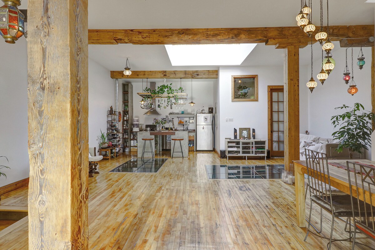 The space is 2500 sqft of open space spread across 2 floors. The design is beautiful, modern/cottage/urban industrial renovated space; you will be inspired. It is an amazing space for relaxing, yoga, working, playing music, dancing, watching movies, enjoying a romantic vacation, working, writing, living... etc