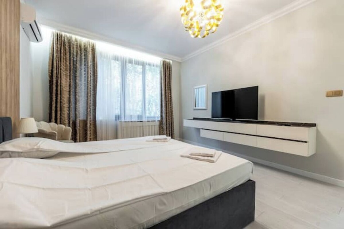 Experience the best of downtown living at our luxury 2-BR flat on Blvd. Patriarh Evtimii and Vitoshka Street. Surrounded by vibrant restaurants, clubs, and near the National Palace of Culture, this fully equipped flat offers a big extendable couch, large flat-screen TVs, and two bedrooms, including a king-sized bed. Perfect for both business and leisure, enjoy comfort and convenience in the heart of the city.