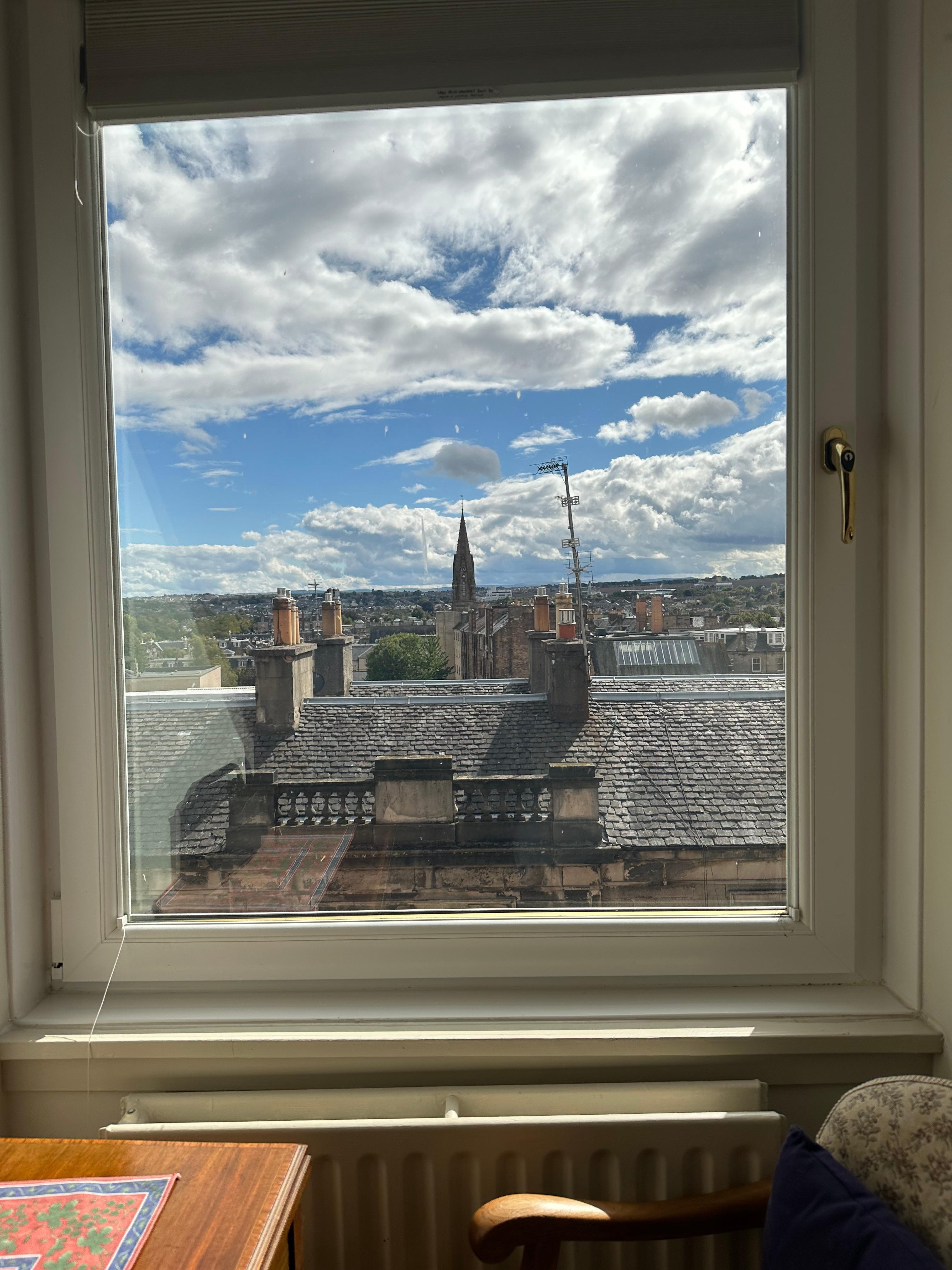 Light, bright and spacious top floor flat (third floor), quietly located in a converted printing works in the university area, 20 minutes' walk from the Royal Mile. Spacious double aspect living room with fabulous views to north and south. Wi-fi internet access, TV, DVD, CD player and radio. Wide selection of books, DVDs, CDs and games. Two comfortable double bedrooms, one of which can be converted to a twin. Well-equipped kitchen with gas hob, electric oven, microwave, fridge and freezer. Stylish modern bathroom with power shower. Washing machine and tumble drier. Private parking space in courtyard. The flat is warm and welcoming, with efficient central heating and double glazed windows. Excellent location within walking distance of the historic city centre while also providing a peaceful sanctuary for visitors.