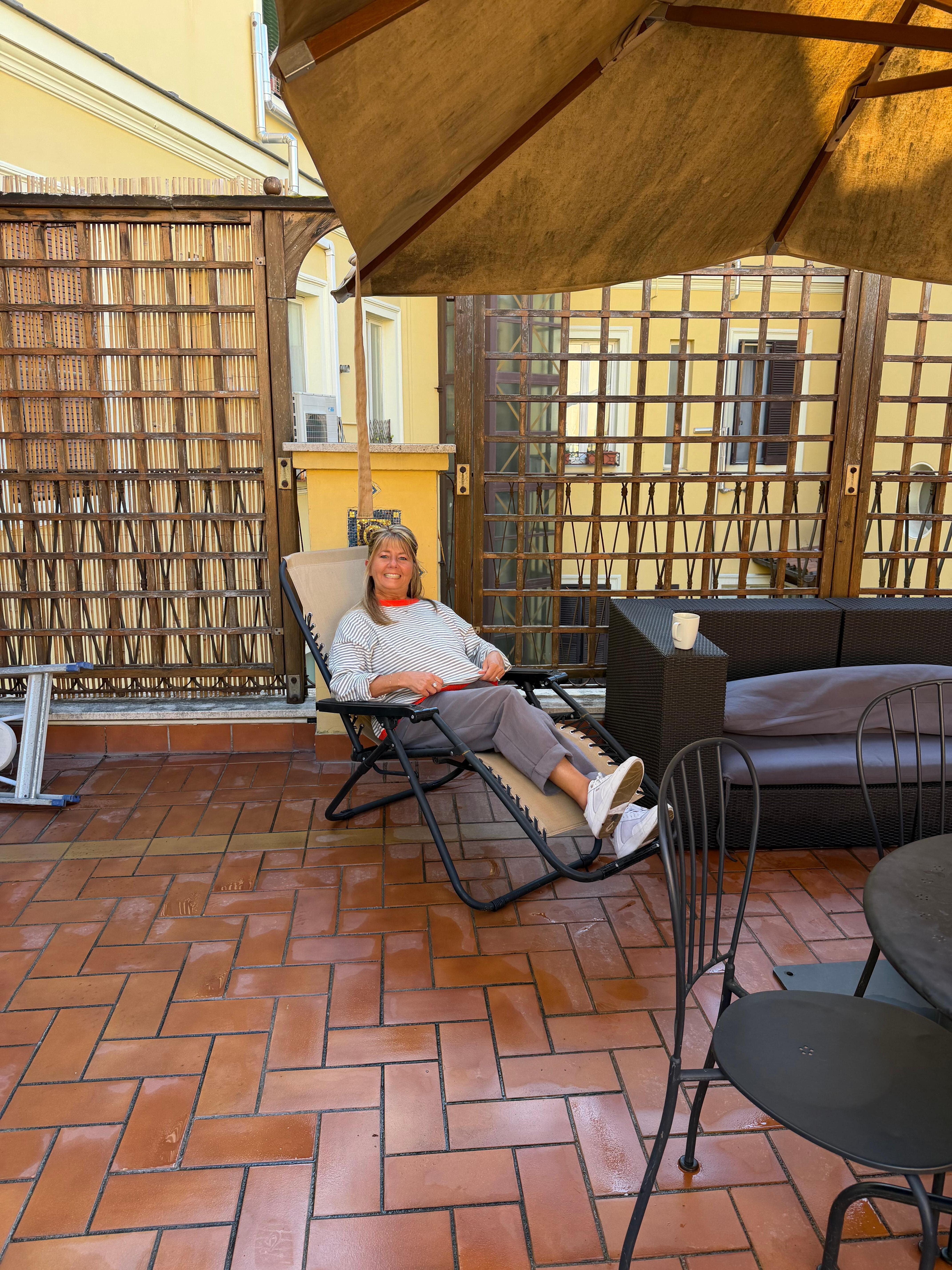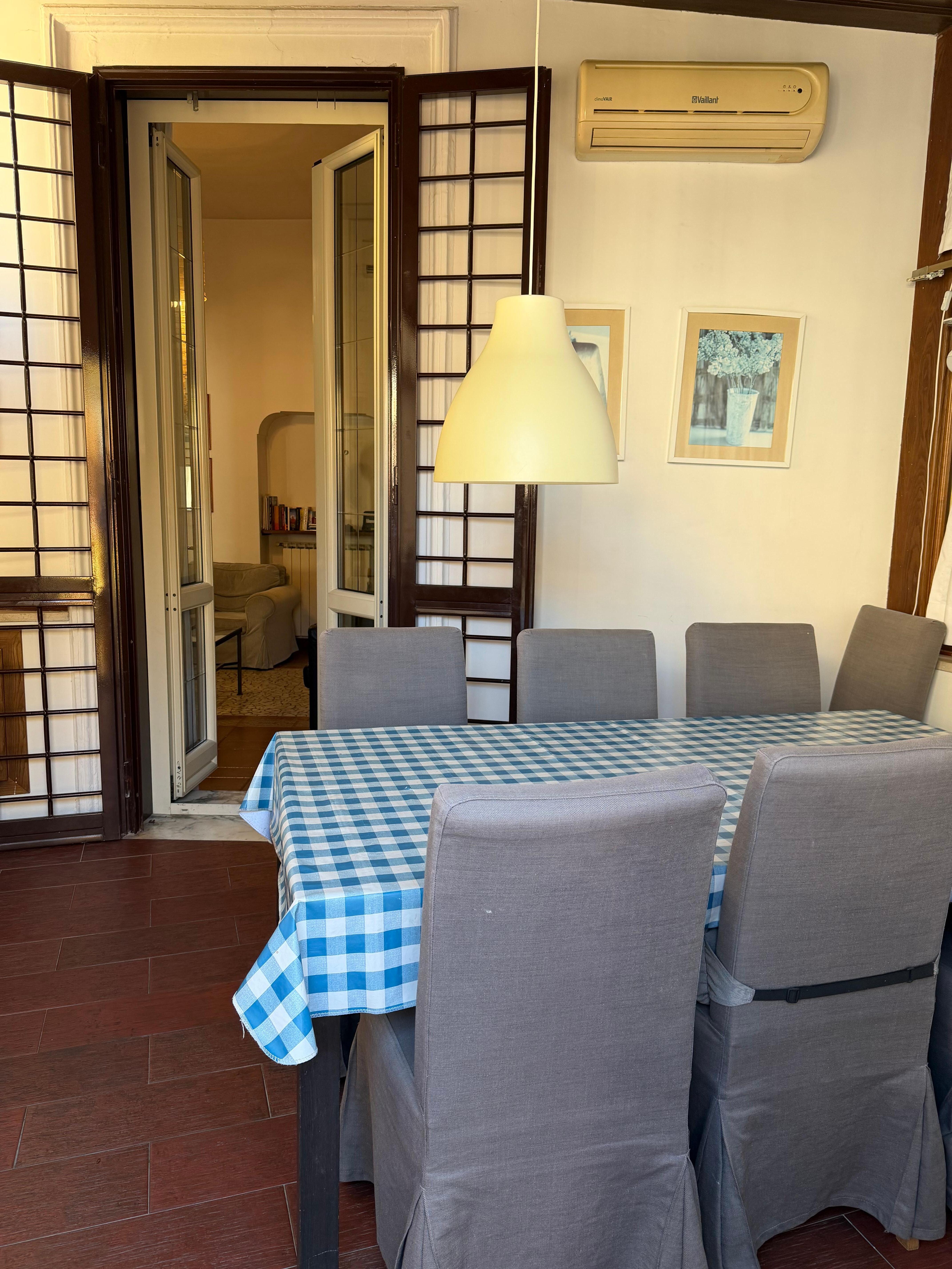 This was a very comfortable and convenient apartment. It was on the (fifth?) floor of a secure apartment building. There is an elevator which was great for moving luggage and for anyone with a problem with stairs. There was air conditioning, though it needed to be used with care alongside other appliances due to the load on the electricity. The easy solution, turn off the air and run the clothes washer and the dishwasher when you are out and about. There were also heavy curtains to keep out the light and keep things cool. The bedrooms are comfortable and quiet, the baths large and modern. We had five persons and one used the sofa bed in the living room, also comfortable. The kitchen was very well equipped, though we used it primarily for breakfast as the restaurants in Rome are great, including several nearby. There is a separate dining room and a large terrace. We spent a lot of time on the terrace in the evenings.