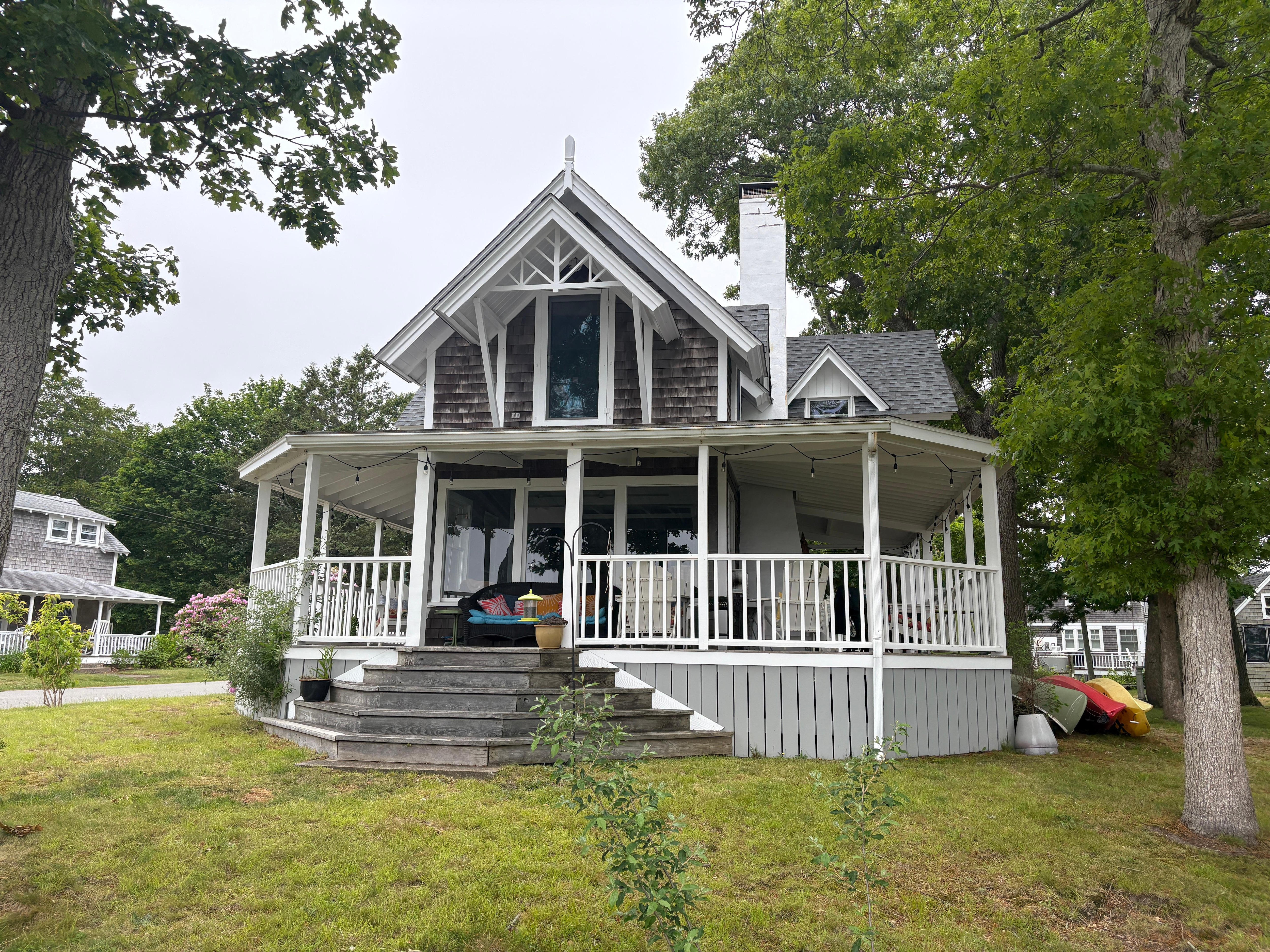 Huge wrap-around porch/deck, big yard, hammock, use of canoe/kayak (row across the pond to the beach and a great fishing spot). Four bedrooms, all with water views, great mattresses and bedding, high cathedral ceilings. Nice napping spot in downstairs double daybed cubby; basement playroom is rustic but has painted floors and walls and enclosed ceiling with a pullout queen bed and dance floor/lights. Great place for teenagers to hang out.