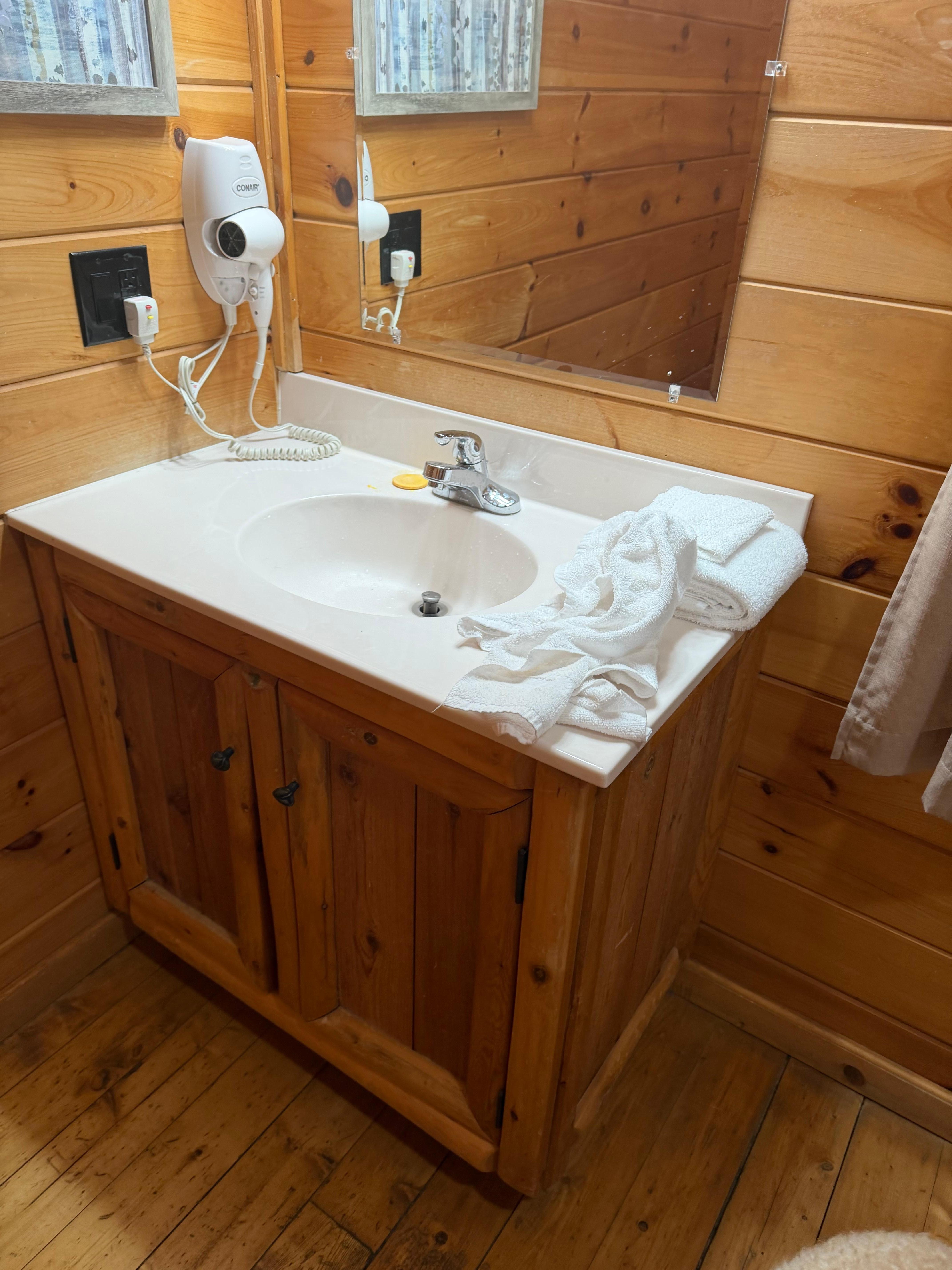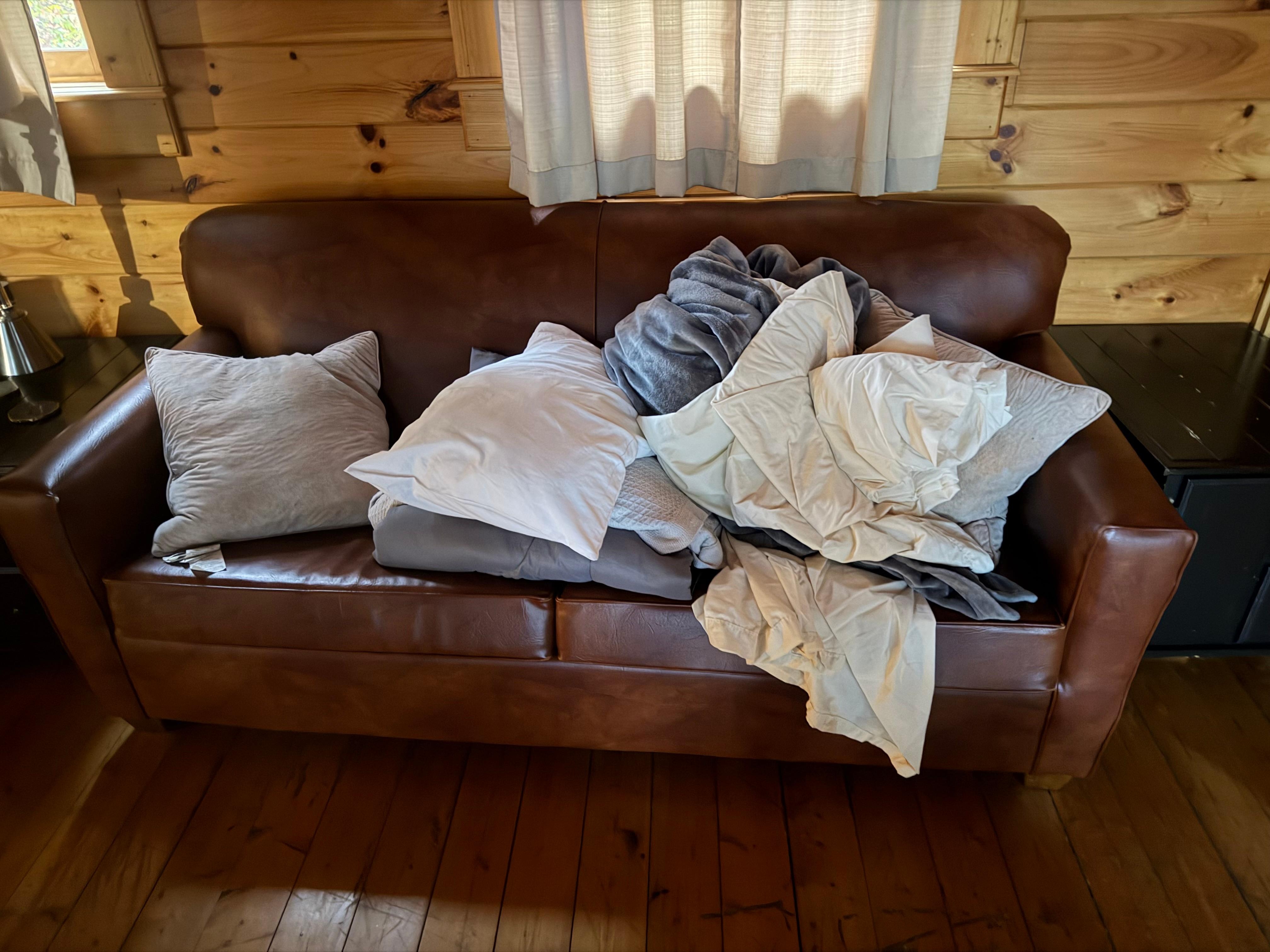 When you go to the lower level of the cabin, you enter the game room and the ideal area for everyone to gather and enjoy spending time together. This game room features a pool table, leather couch, leather love seat, drink station, card table, motorcycle bar, and an 85-inch smart TV with surround sound. There are also two bedrooms downstairs and is the ideal area for kids. The first bedroom comes with a king size bed, 2 nightstands, a 43-inch flat screen TV, and a bathroom with a tub/shower combo. The second bedroom on this level comes with a set of full-size triple bunk beds, 43-inch flat screen TV, and a private bathroom with a tub/shower combo. The lower level also features the second of the three covered decks which comes with 5 rocking chairs, a bench, and beautiful mountain views.