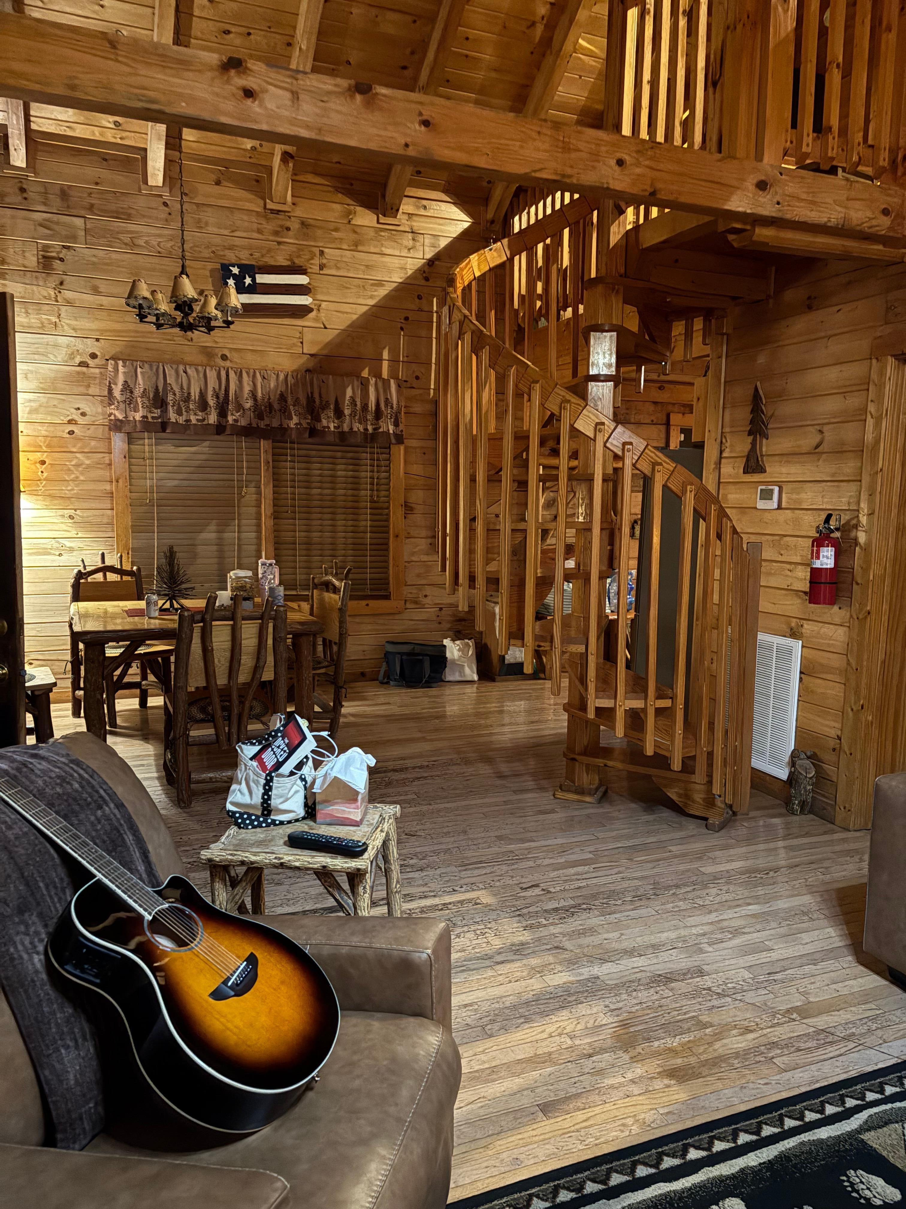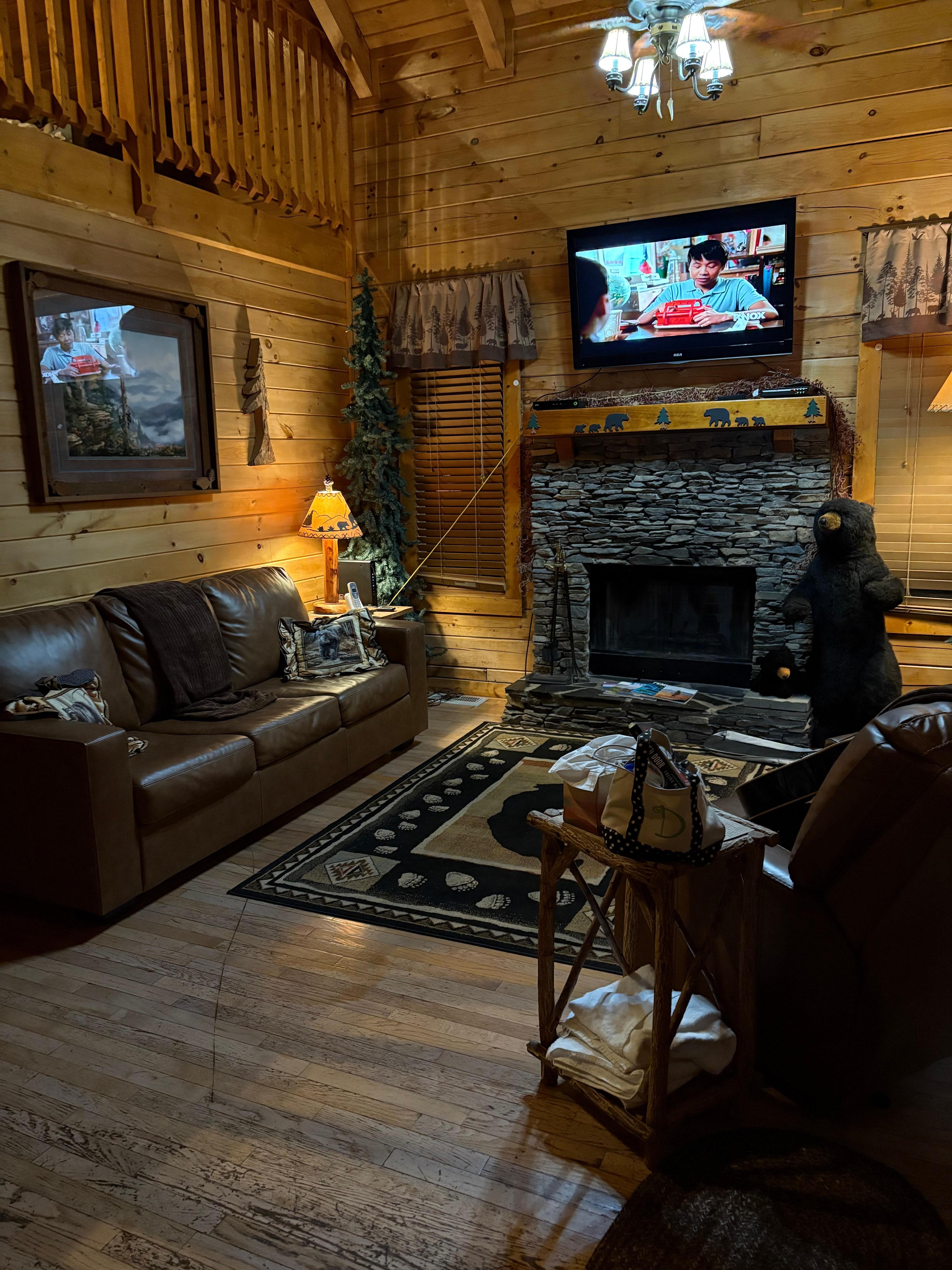 Bear Tracks guests are welcomed by the massive vaulted pine ceilings. The cabin's spacious, open space is perfect for families. Wood is from floor to ceiling - offering guests a genuine cabin experience. The kitchen is appointed with quality appliances and is fully stocked with dishes, drink ware, and utensils. The loft includes a comfortable memory foam queen size bed and pullout sleeper sofa, as well as a "Multi-cade" commercial arcade with all of the classic games - PacMan, Donkey Kong, Galaga, and dozens of others!
