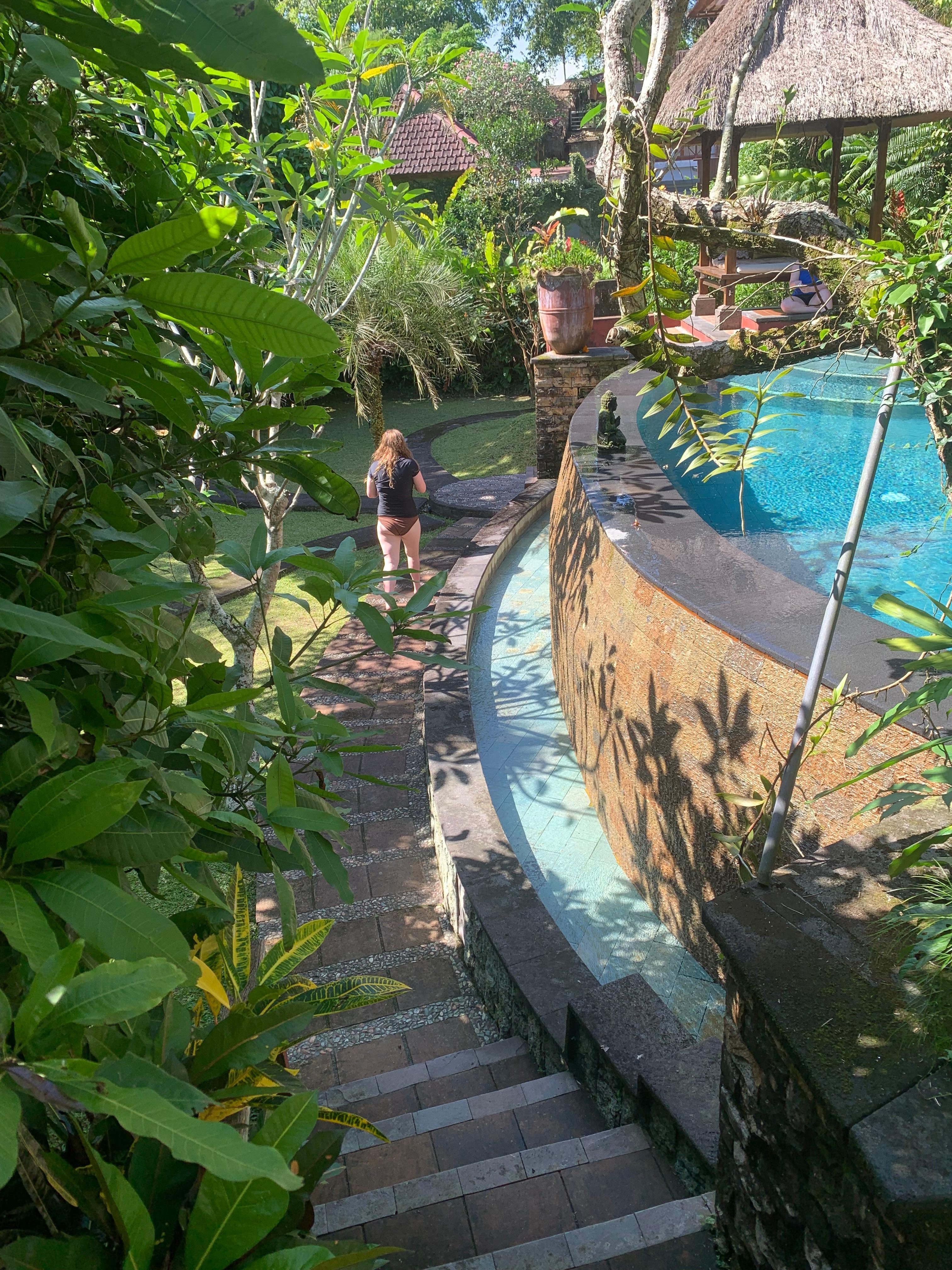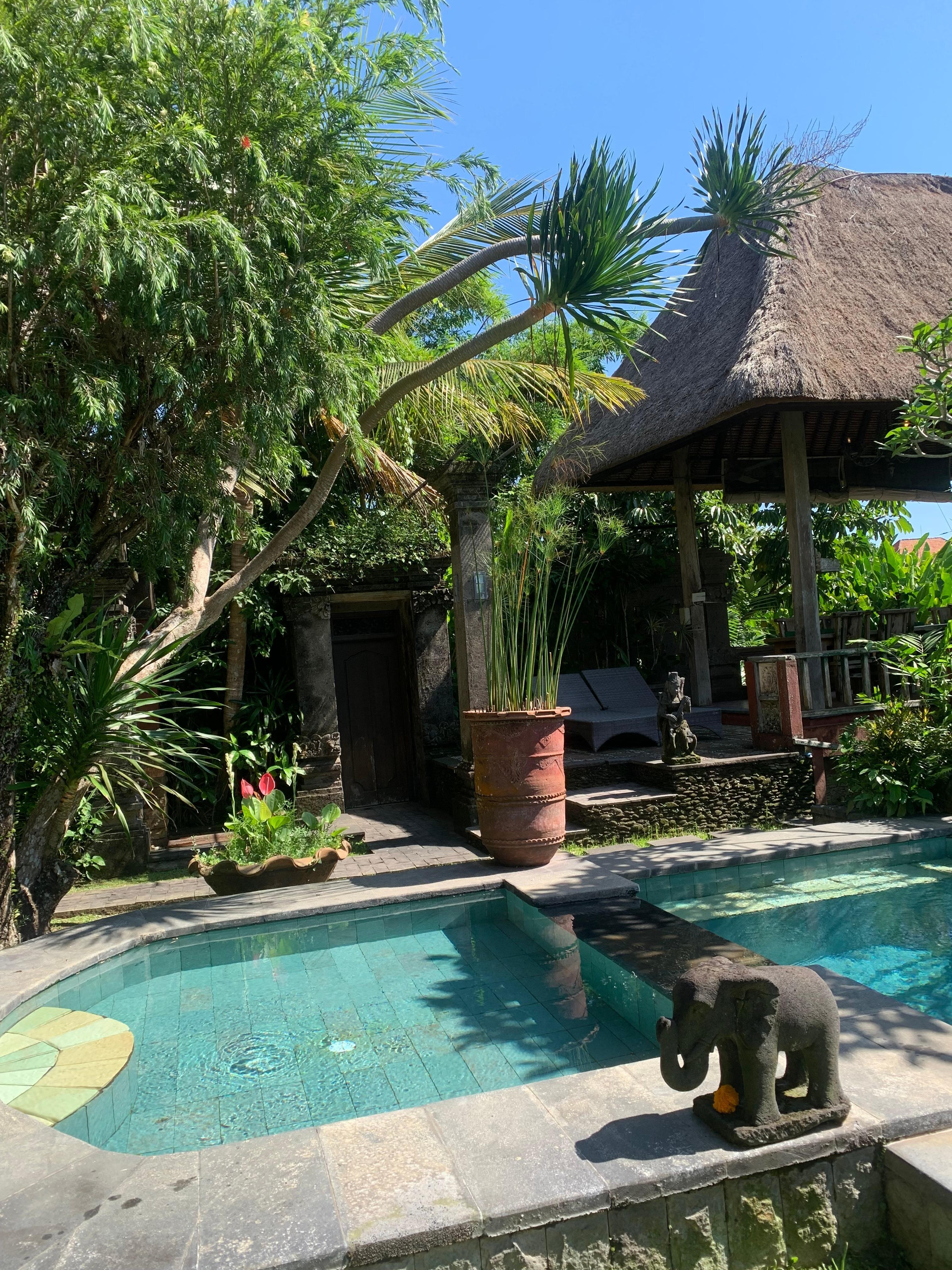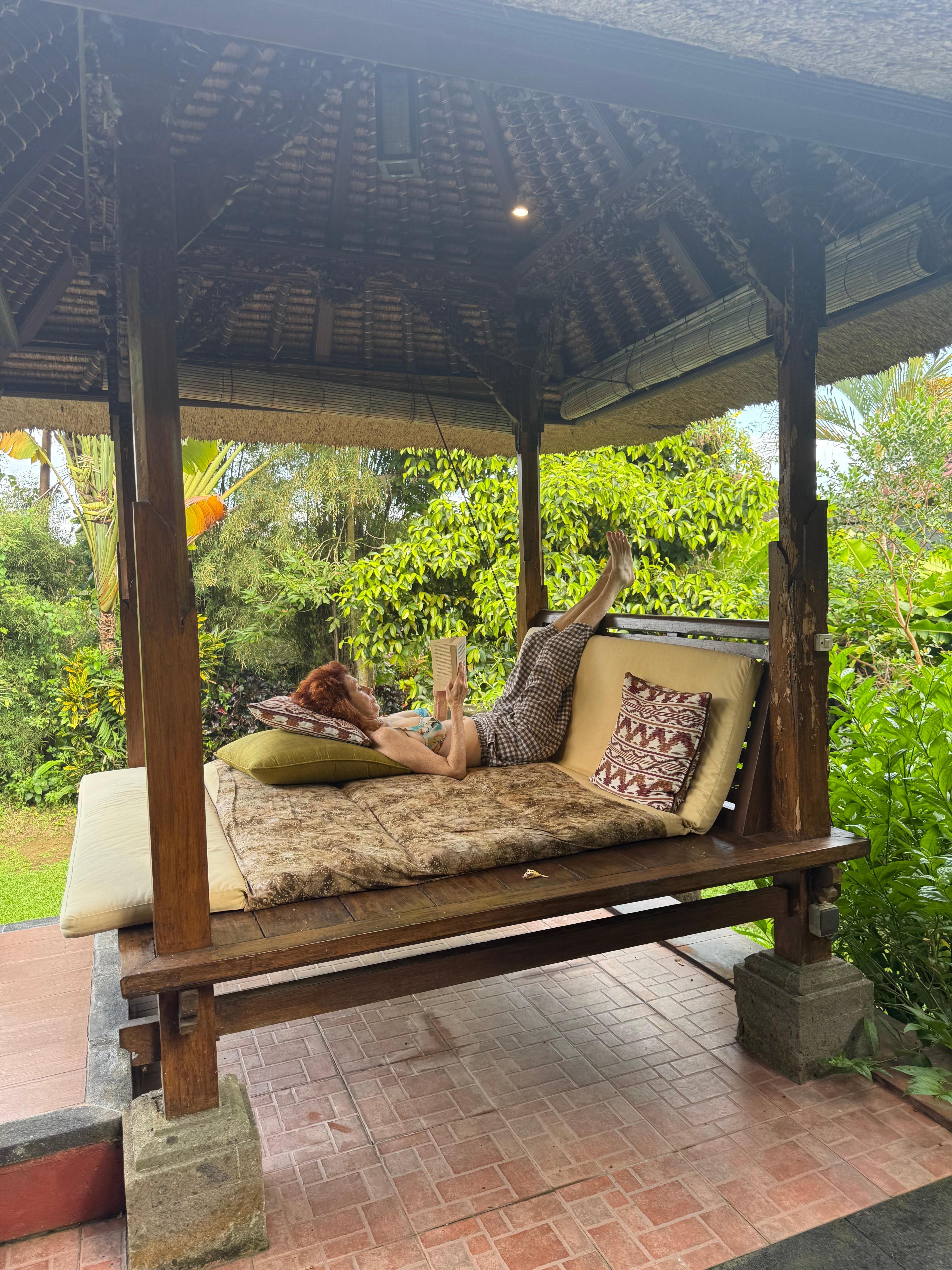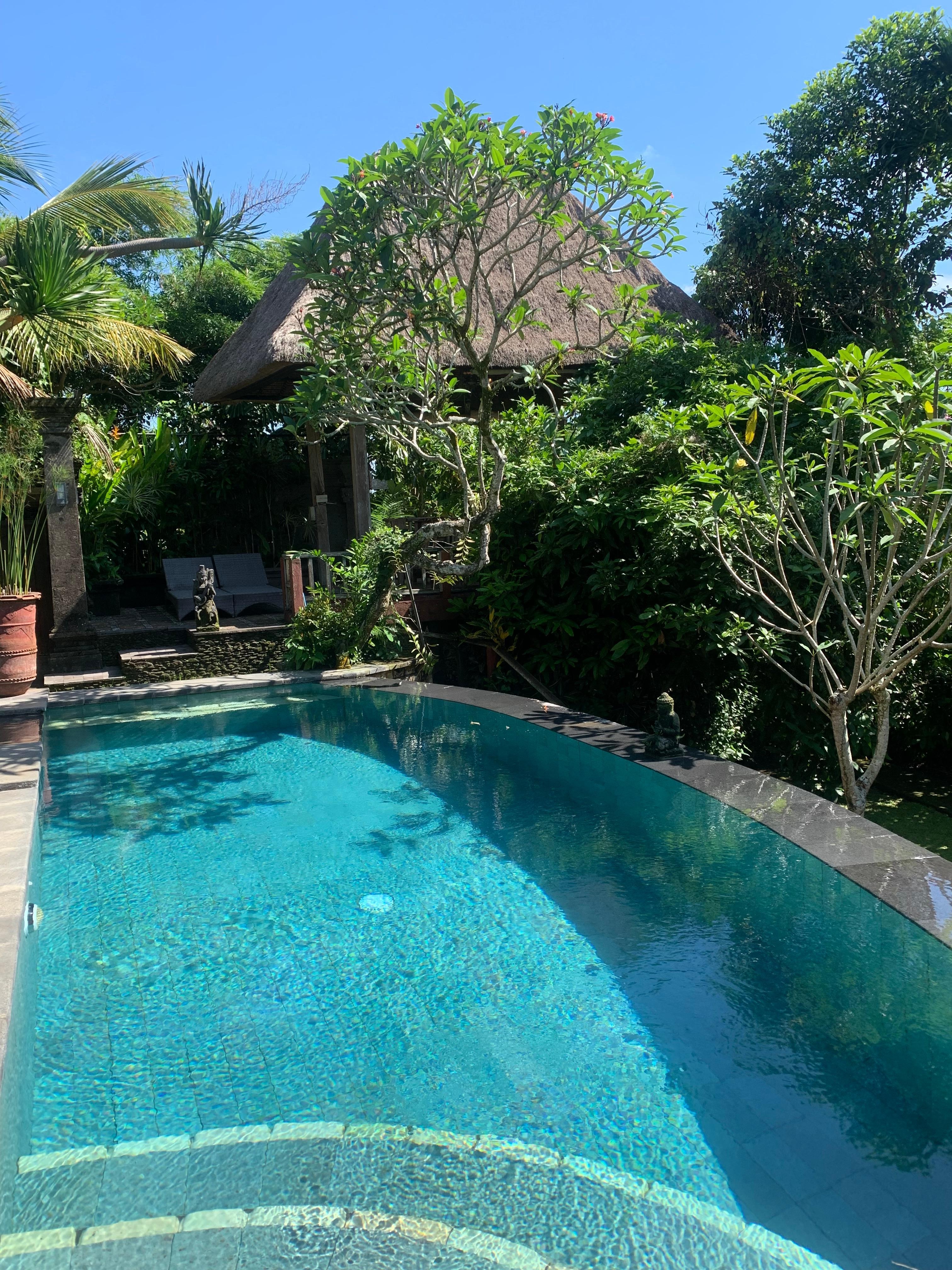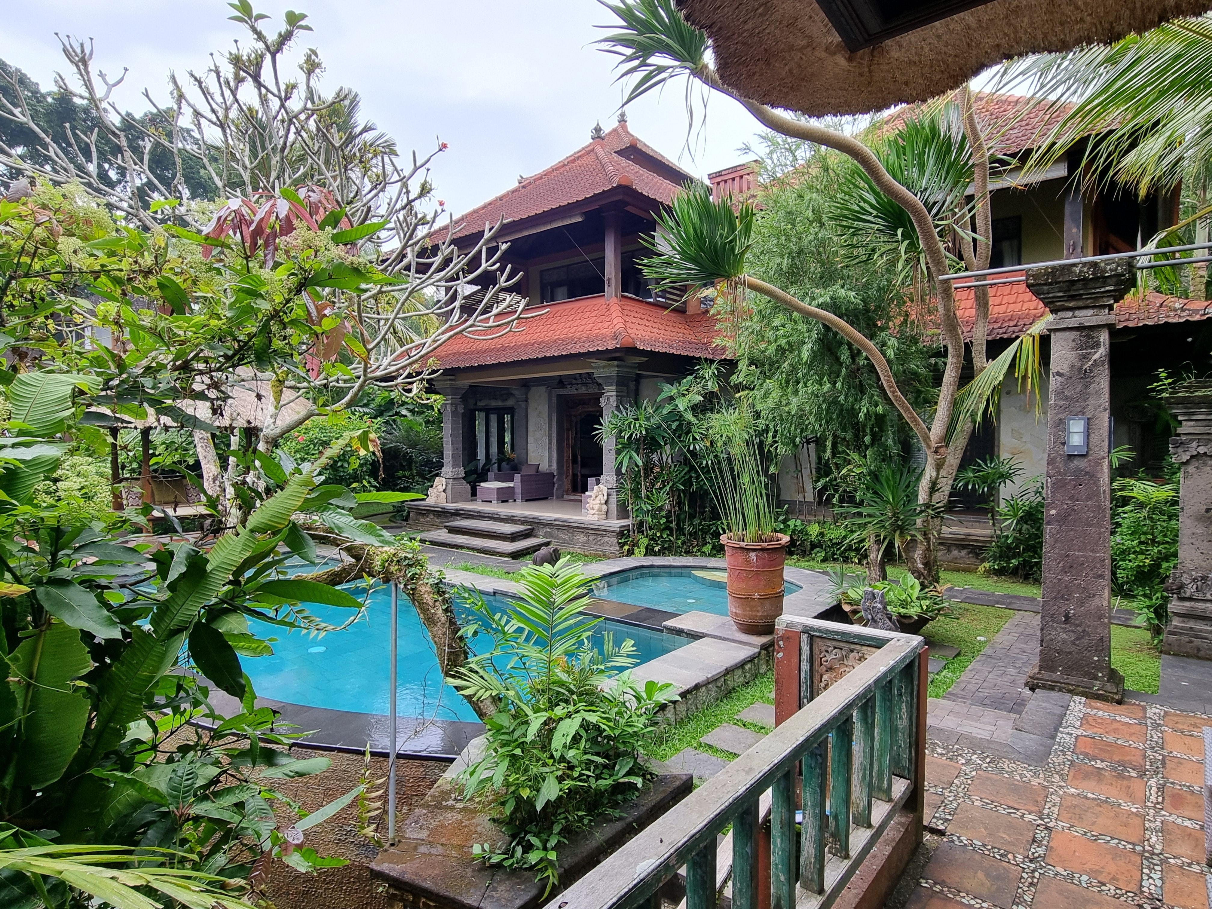 The first floor great room is large and beautifully furnished, with a living area and a reading nook with a view of the gardens and pool, and a Balinese-style kitchen: refrigerator, two-propane burners, but NO OVEN. The house is equipped with some cooking utensils and dishes, though the Balinese are such good cooks, you should rarely cook for yourself!!