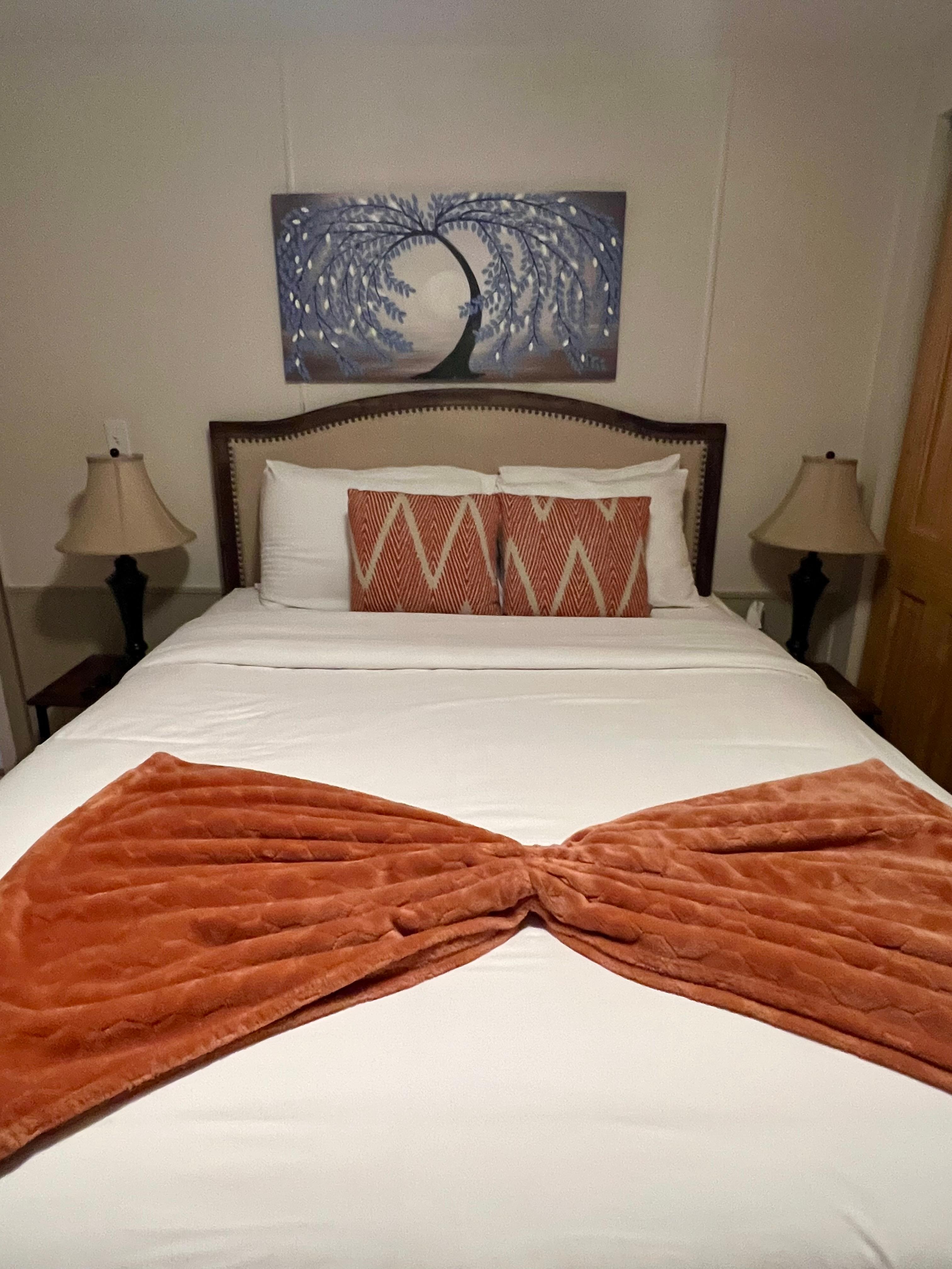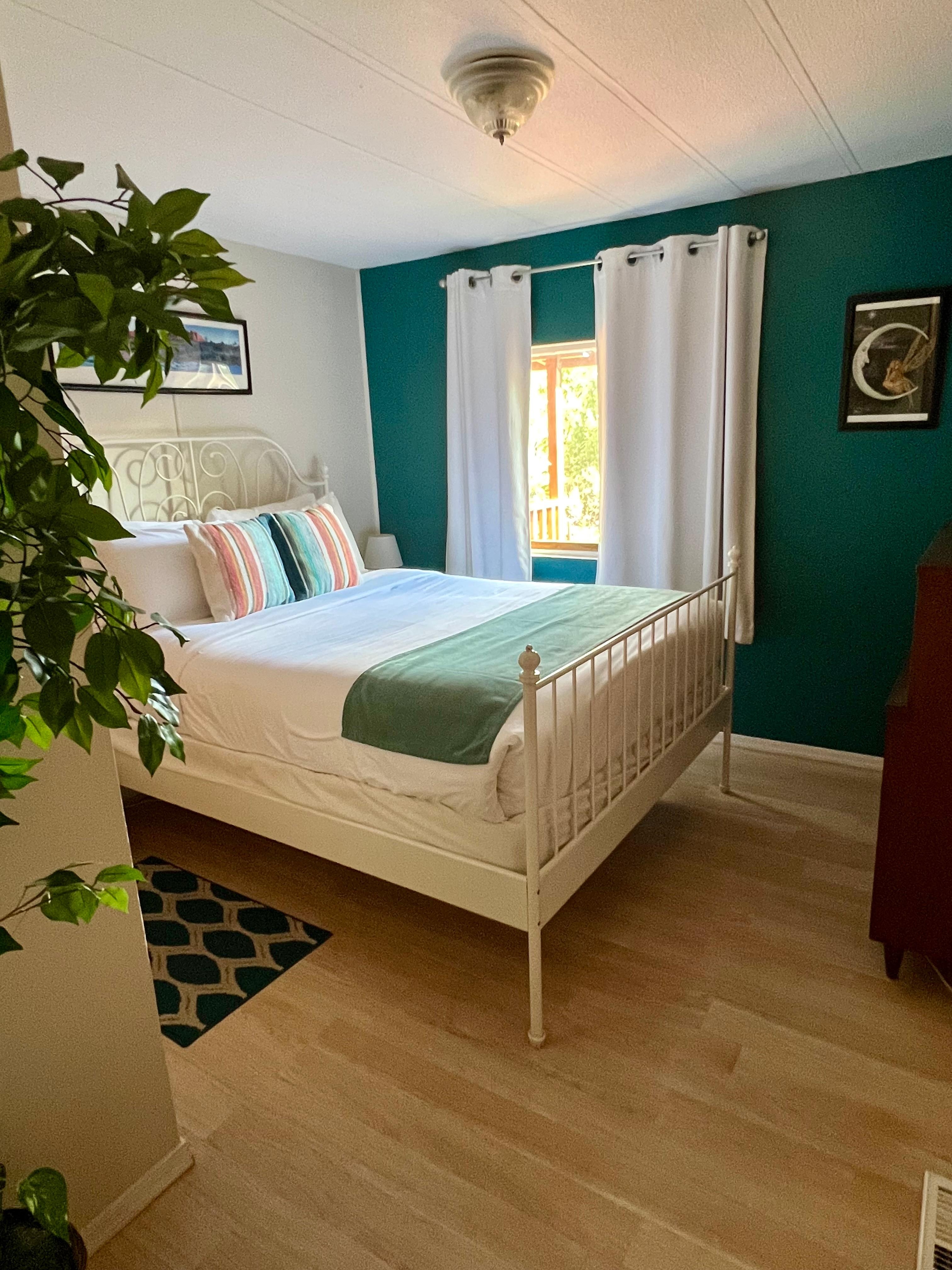 This beautifully remodeled home features two bedrooms, each with a comfortable queen bed. One bedroom includes an ensuite bath, and there’s a second guest bathroom with a walk-in shower for added convenience.