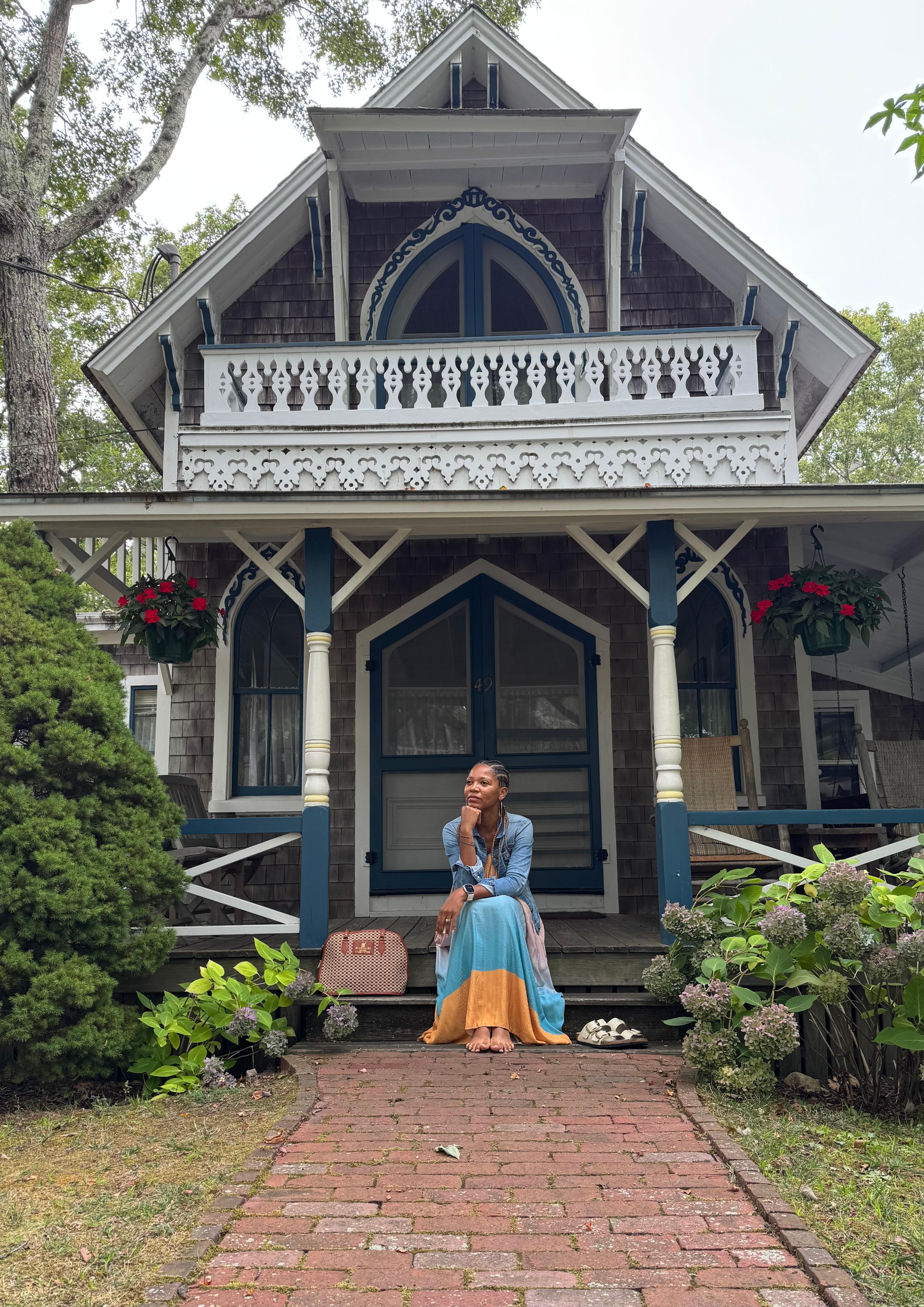 Extra-large gingerbread cottage in historic Campgrounds in Oak Bluffs, sleeps nine. Located on a double lot in the heart of the Martha's Vineyard Camp Meeting Association in Oak Bluffs, this extra-large cottage has five bedrooms and sleeps nine comfortably. The cottage has two full baths, both of which were completely renovated over the past few years. One with a cast iron tub and one with a tiled shower. A completely private outdoor shower made from cedar and accessible by a raised walkway from the back door of the house is the perfect place to clean off after the beach or simply to enjoy the fresh air with the morning shower. Set back from a wide quiet street, the house is a five minute walk from Oak Bluffs downtown and harbor. The covered wraparound front porch is the perfect place to enjoy the morning coffee or dinner on a summer evening. The porch boasts a classic porch swing, wicker rocking chairs and a teak table and chairs set. The extra-large lot means the house offers considerably more privacy than many Campgrounds cottages. There are two reserved parking spots behind the house.