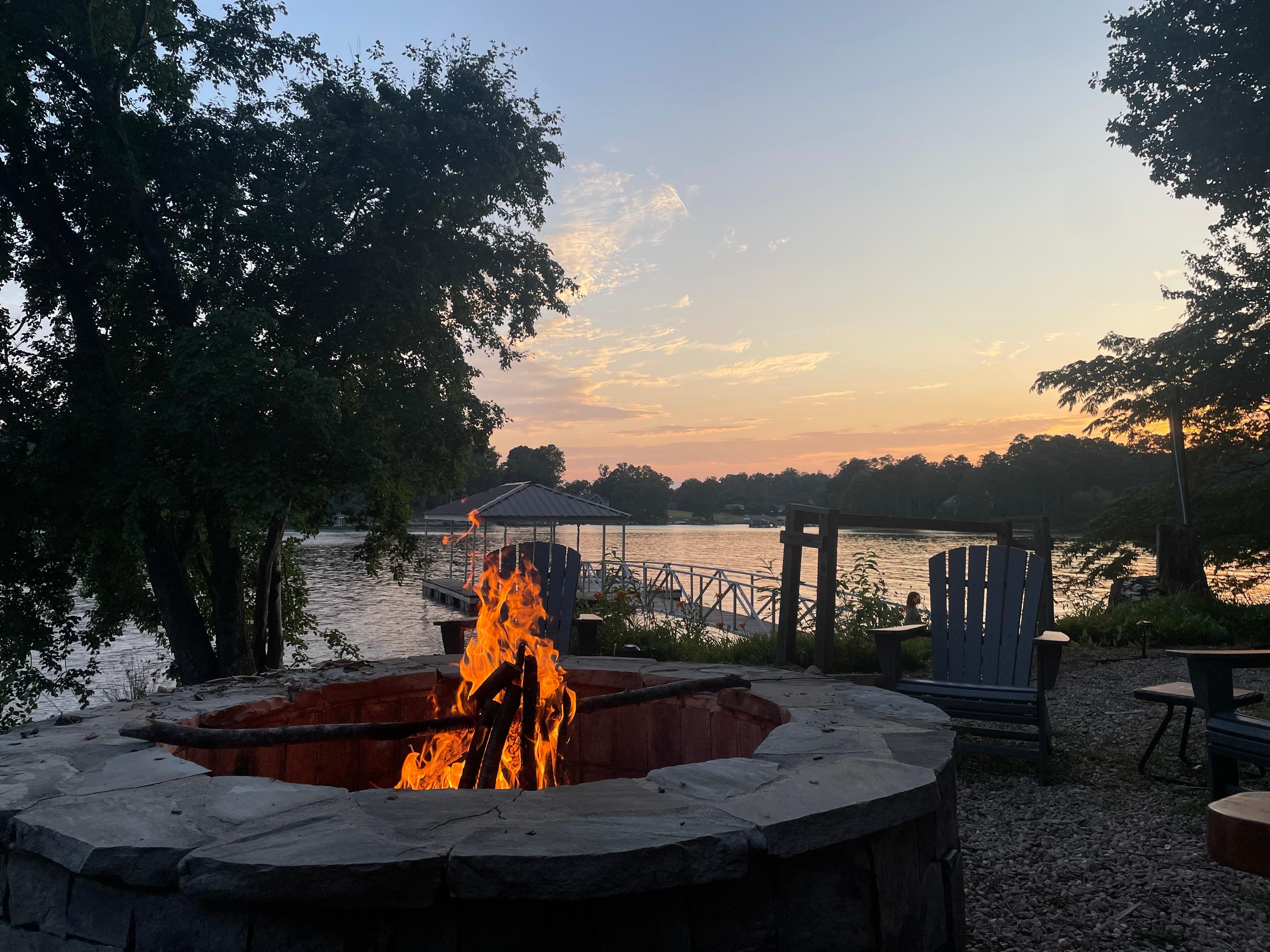 It has the perfect outdoor living space for gatherings with an expansive upper deck, patio sitting area with TV, covered dock with swimming platform and seating to relax, a private beach, fire pit, outdoor cooler, horseshoes, and an outdoor shower.
