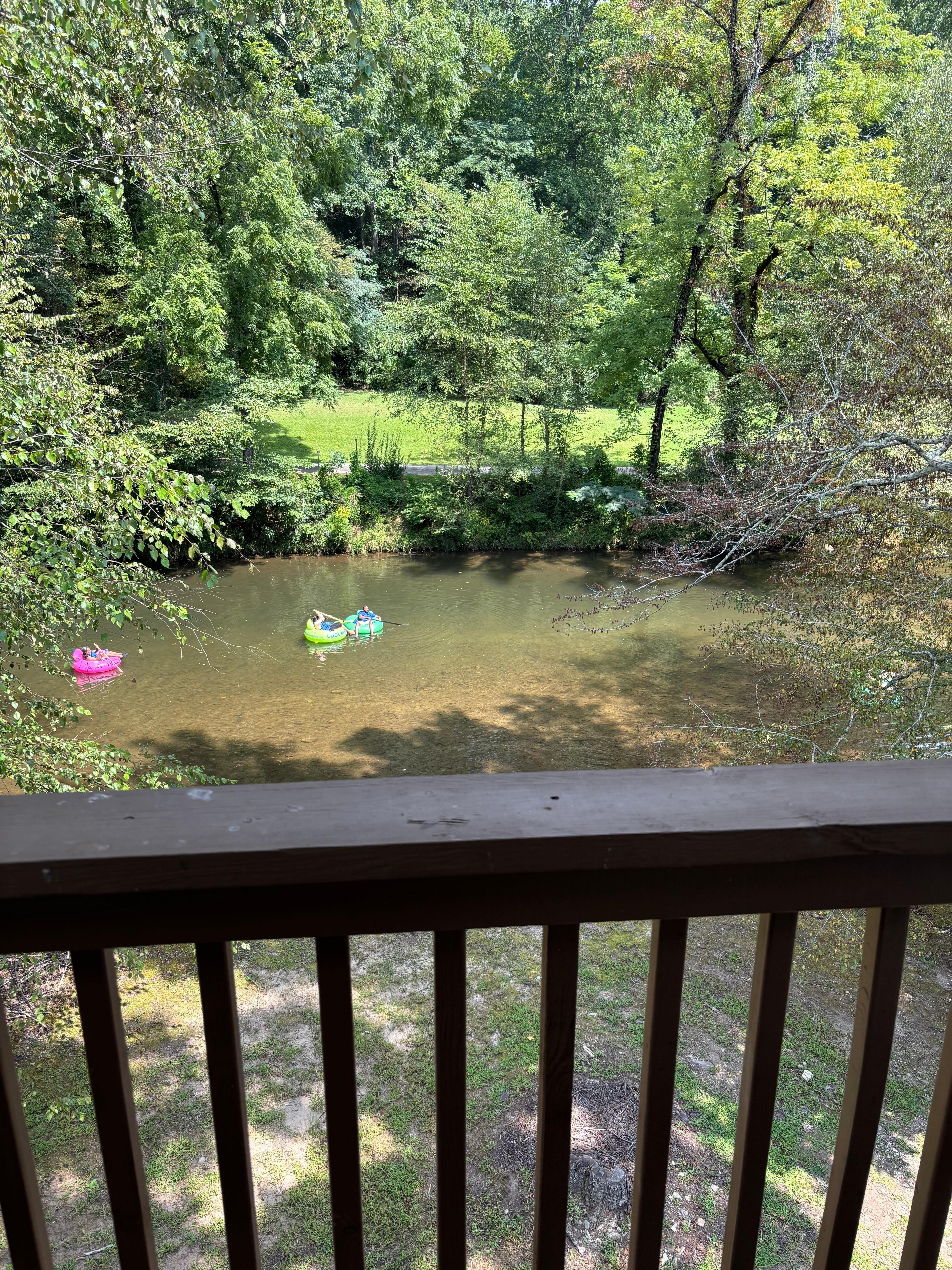 Recently purchased, this well maintained condo has incredible Chattahoochee River views from the spacious top floor covered porch and only a short walk to the heart of downtown, this is an ideal Helen getaway. The king size bedroom has a see-though gas-log fireplace, flat screen TV and door that leads out to the large fully- furnished outdoor covered deck. Large bathroom includes a jetted tub, a separate shower and a linen closet for extra storage. Being a top floor unit awards the best views of the river and also assures a very quiet stay. This spacious 980 square feet condo is tastefully decorated with comfortable leather couch and loveseat, Flat screen TV, Gas Fireplace (winter months) all new artwork and accessories. The well equipped kitchen has granite counter tops, stainless steel appliances, and a pub style table and chairs. Washer and dryer also in the unit.