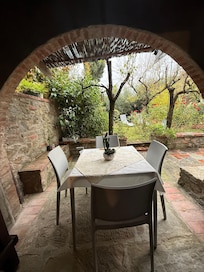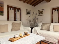 It is the old home of our family! The apartment in question is located on the ground floor of a traditional farmhouse. It consists of two double bedrooms, living room with sofas, one of which is a sofa bed, fireplace, kitchenette and two bathrooms. From the kitchen you can access the veranda where in summer you can eat in the shade and access the garden.