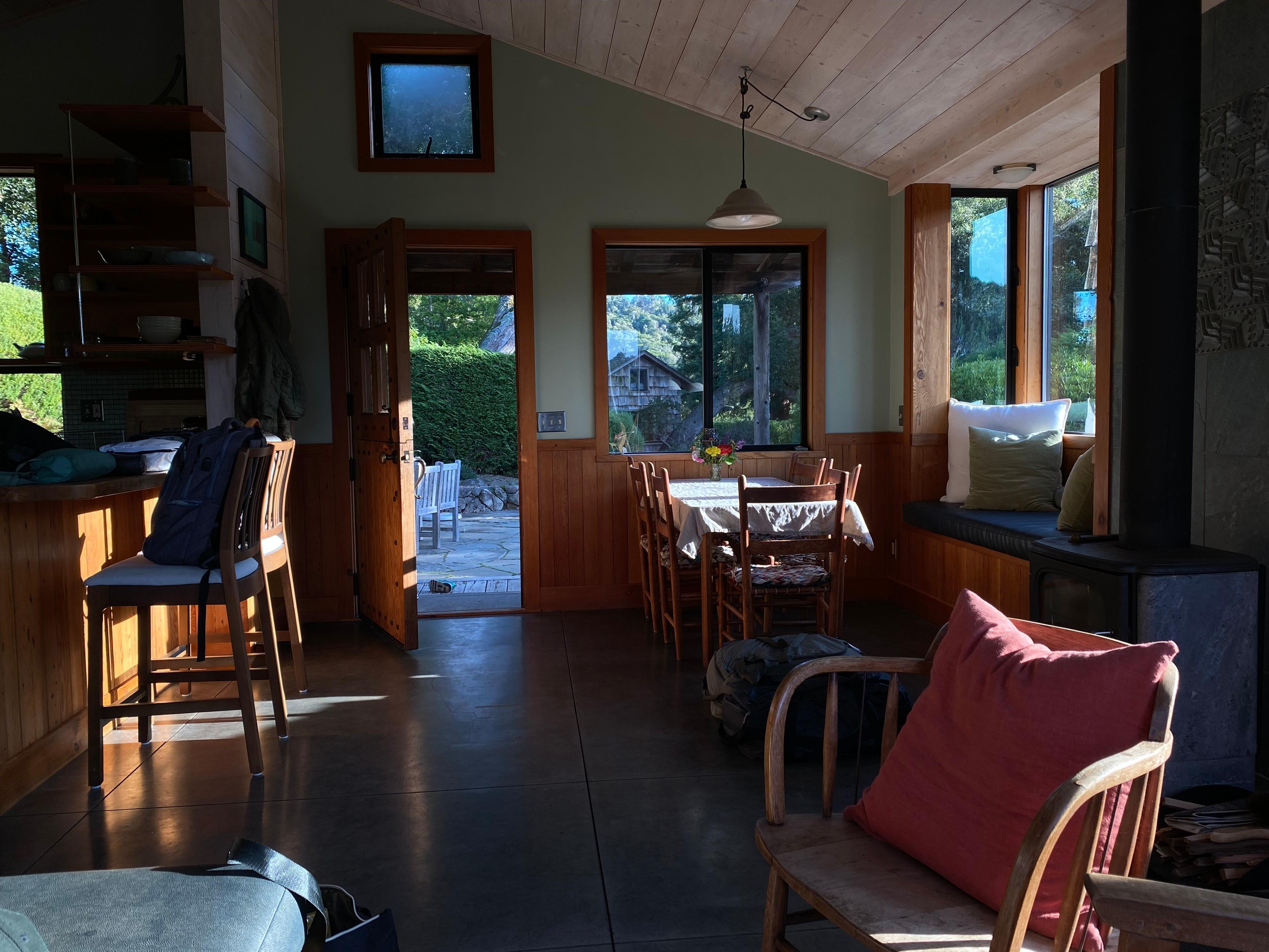 Enjoy a cup of tea snuggled up in one of the bench seats. Cook a gourmet meal in the fully-appointed kitchen. Feel the warmth from the wood-burning stove and the radiant-heated floors. Appreciate the views of Mount Vision from the private deck. Listen to the sound of the birds as you soak in the hot tub. Relax in the peace and tranquility.