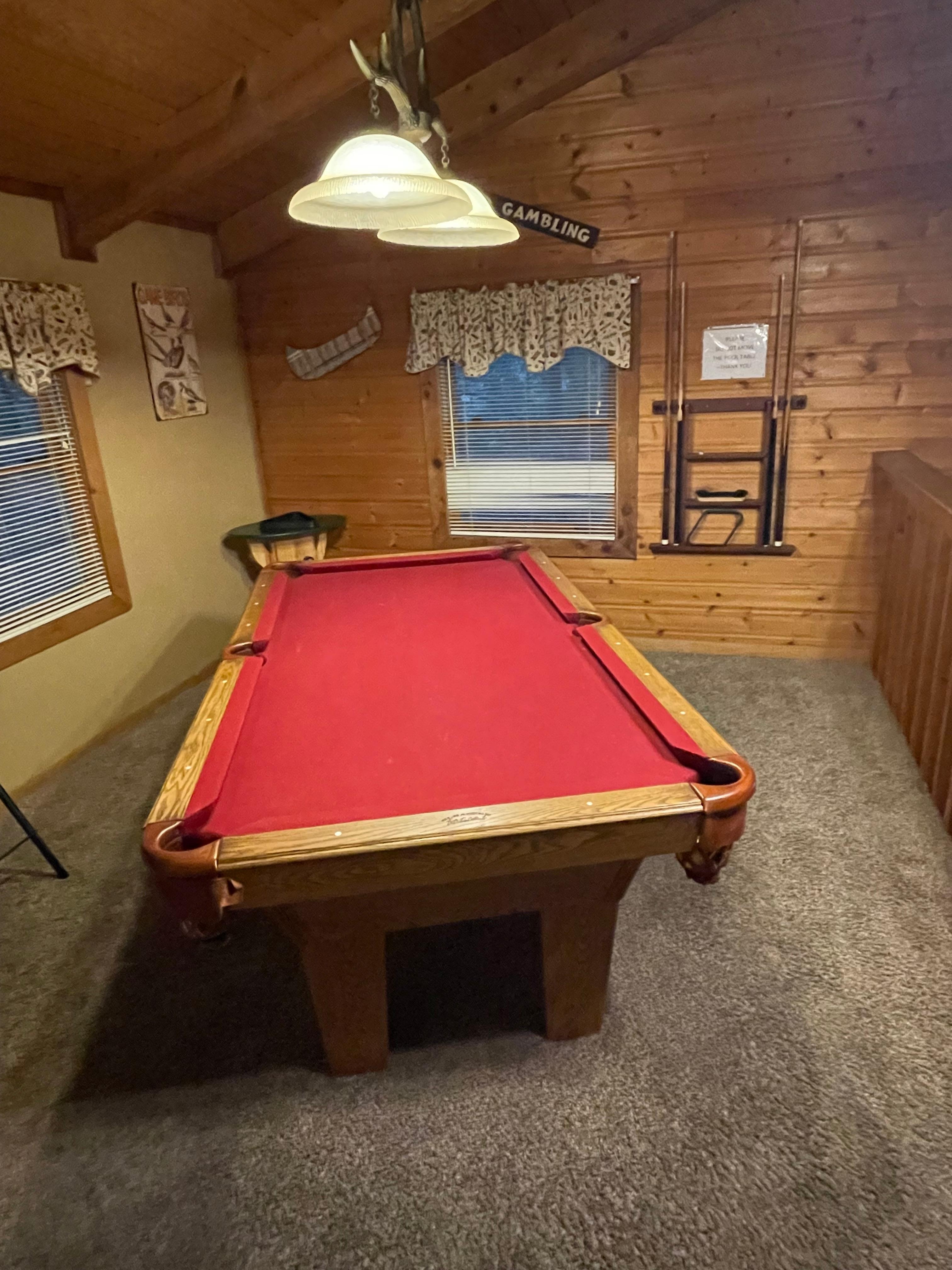 There are 3 levels in our cabin. You arrive at the main level into an open concept living area with a gorgeous stone gas fireplace, sleeper sofa and a two comfy recliners for your relaxation. The kitchen is just beyond the living room, with a dining table that seats 4, and 4 bar stools at the counter. There is a relaxing "Bear" bedroom with a king bed and bathroom just past the kitchen. The loft upstairs has a pool table for your entertainment, and a separate "Fishing" bedroom with a king bed. Downstairs is an entirely separate living space containing a wet bar, a small refrigerator, an additional stone gas fireplace, queen sleeper sofa, a separate private "Moose" bedroom with a queen bed, and a half bath with a toilet and sink. Parking is parallel in the front of our cabin with plenty space for 4 vehicles.