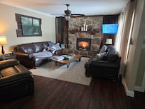 A beautiful stone fireplace, part of the original house and built by Kris's father, is the center piece of the living room.