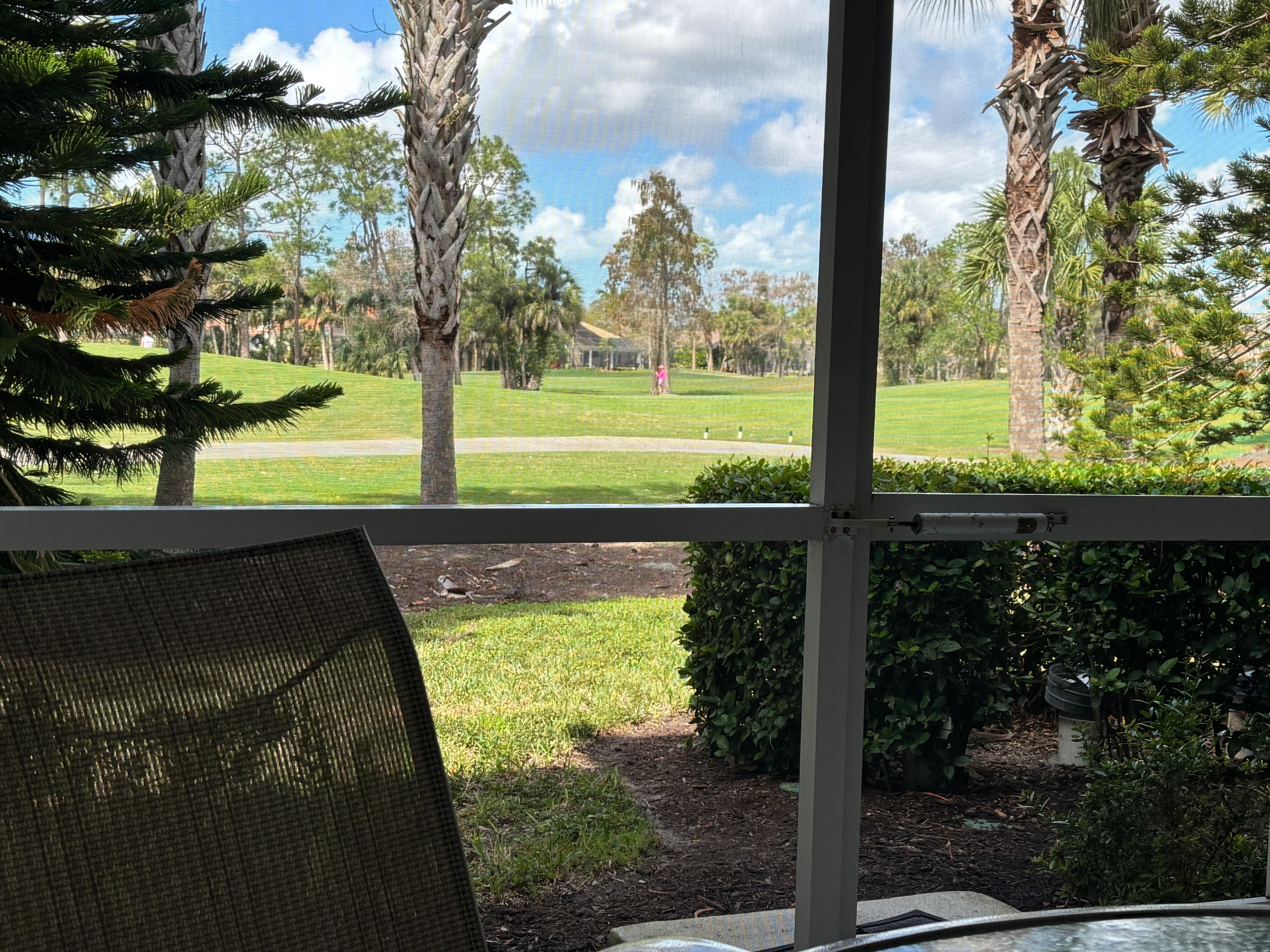 We open the blinds to our lanai and enjoy a lovely view of the golf course. We can watch golfers try to get out of the sand traps or watch the pros make winning shots.