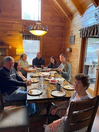 As you enter the main level, you will find a spacious living room with a sofa, loveseat, rocker, TV, DVD Player, Gas Fireplace, ceiling fan, and wood flooring. There is a fully equipped kitchen with 3 bar stools and wood flooring for cooking tasty meals at the cabin along with a separate dining room area that has a table for 8. There are two Queen bedrooms on this level with TV, ceiling fans, and carpet along with a full bathroom with wood flooring.