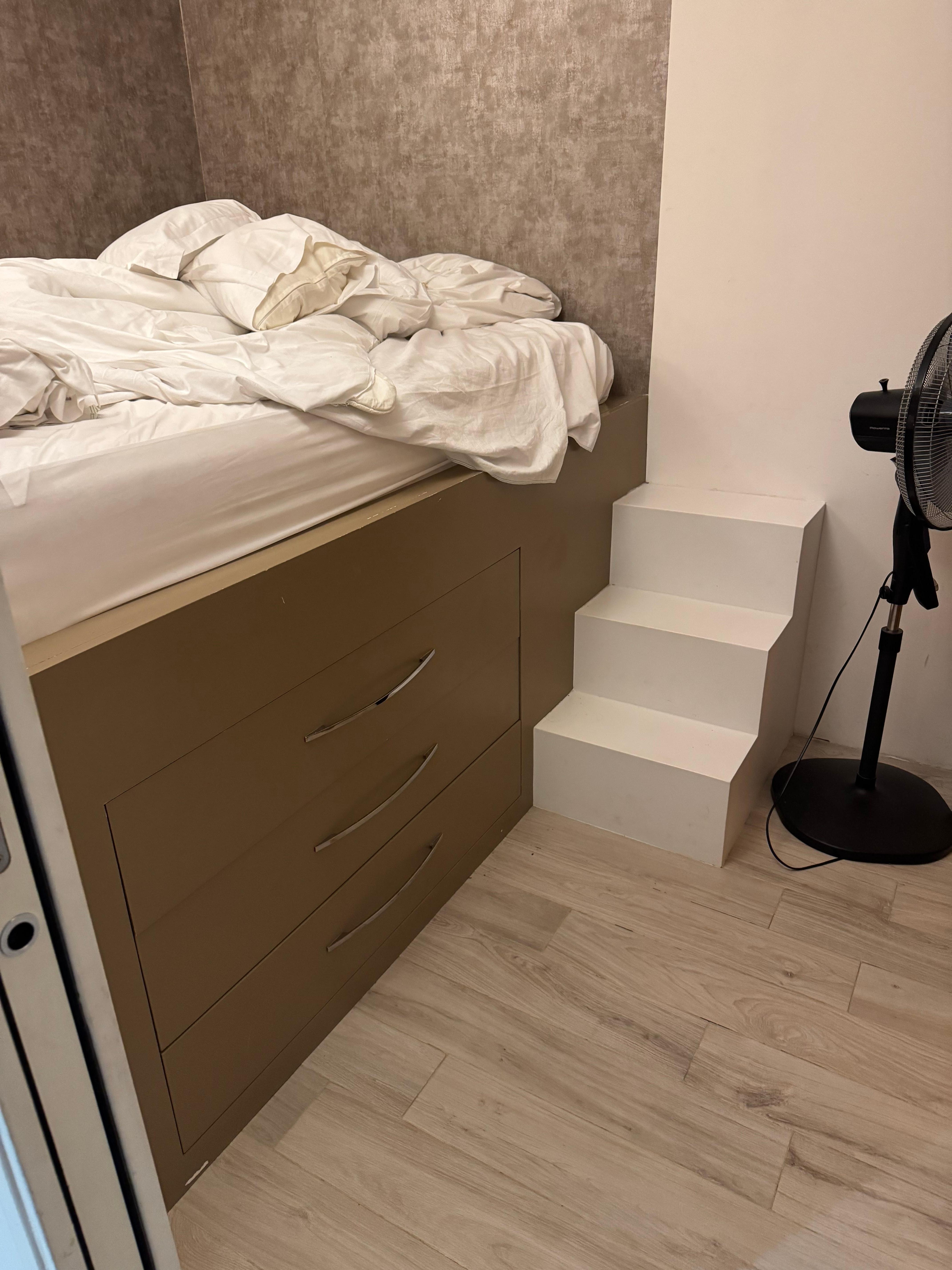 The flat is composed of one separate bedroom with an elevated queen size bed, a large and fully equipped kitchen, a nice living room with a very comfortable sofa bed and a beautiful bathroom.