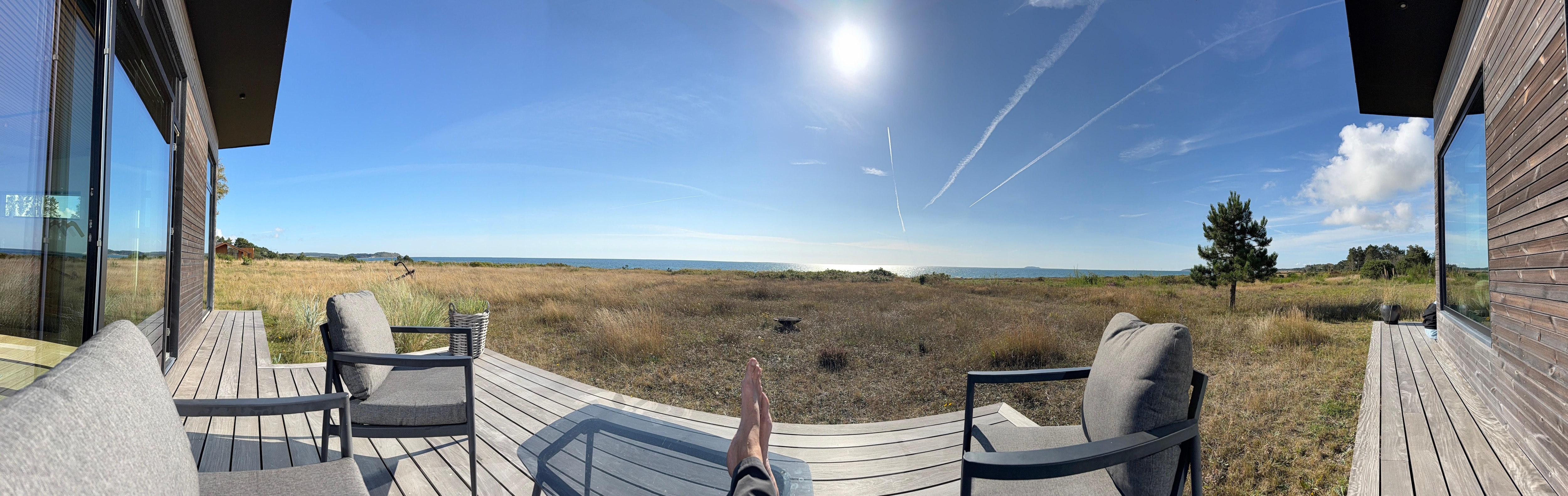 Lovely luxurious holiday home is in a great location with a panoramic view of sea. The summer house is located in the 1st row, a stone's throw from the beach, and has the joy of sunshine all day on its beautiful wooden terrace surrounding the entire house. Here you can enjoy a holiday far beyond the usual in a modern holiday home furnished with facilities such as a outdoor wilderness bath, outdoor shower, and barbecue.