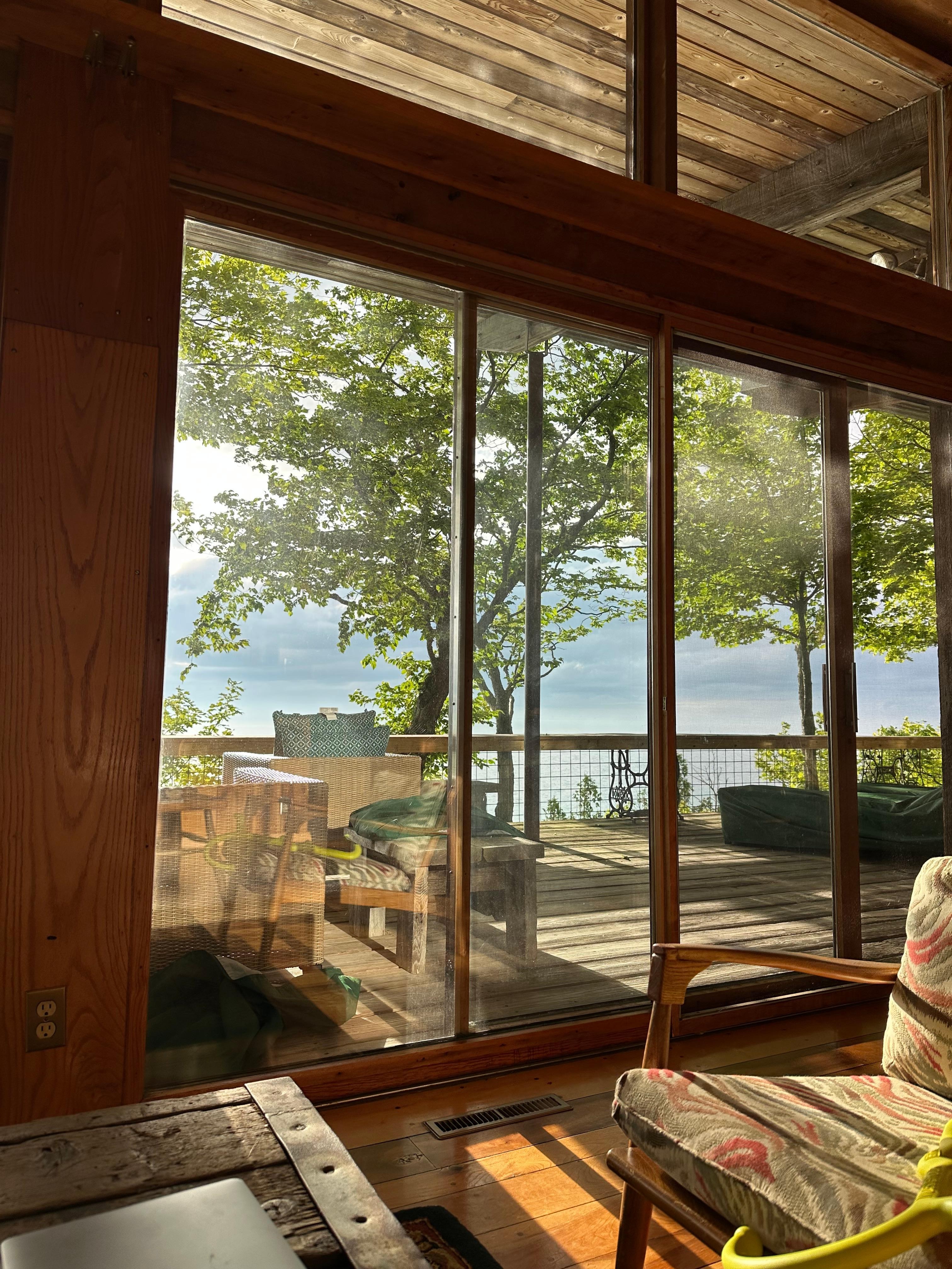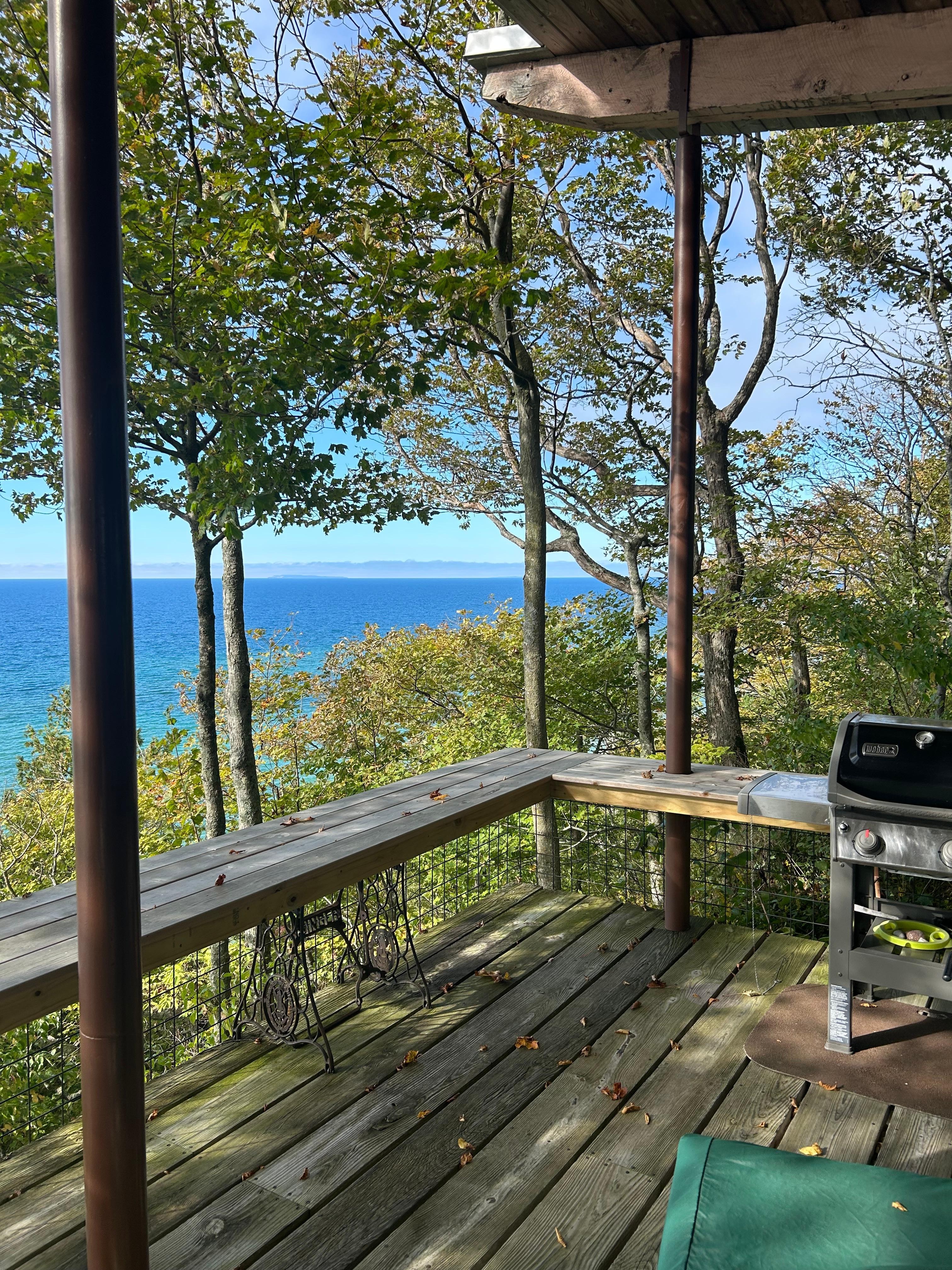 The cottage has a wide covered deck that is the perfect spot to lounge: read, eat, watch a breathtaking sunset or storm clouds fly in from the west, star gaze or dream. There is an eagle's nest nearby and regular flybys. Track and identify freighters sailing through the Manitou Passage by phone app!
