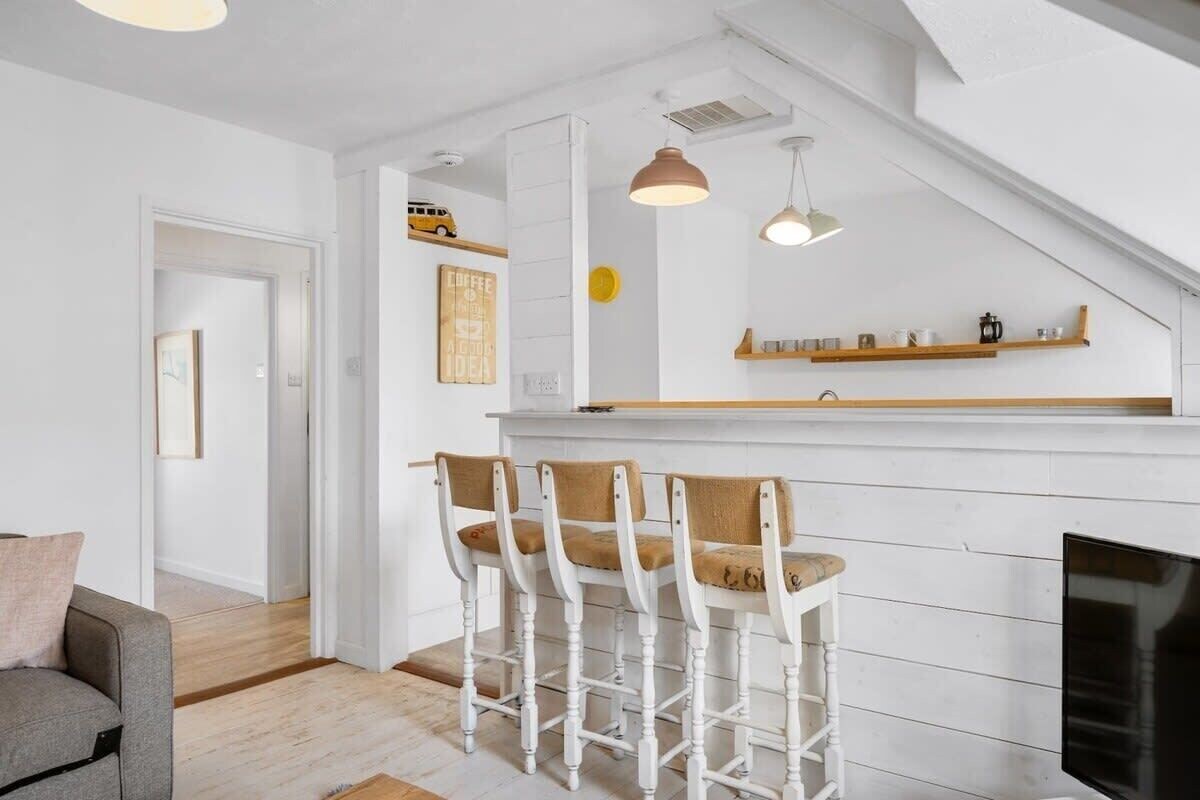 The well-sized living room features a large and comfortable corner sofa with a wooden surfboard hanging on the wall - it's the perfect spot to crash after busy days! You'll find ample things to watch on the Smart TV, which comes with a handful of modern apps: Netflix, Prime, BBC that you can log into. The well-equipped kitchen overlooks the living room, but is also divided by a breakfast bar. It has been recently refurbished with modern appliances, such as an electric hob and oven, fridge/freezer, kettle, toaster, washer/drier and dishwasher. The breakfast bar with it's upcycled bar stools is a great spot to eat dinner or enjoy your morning coffee!
