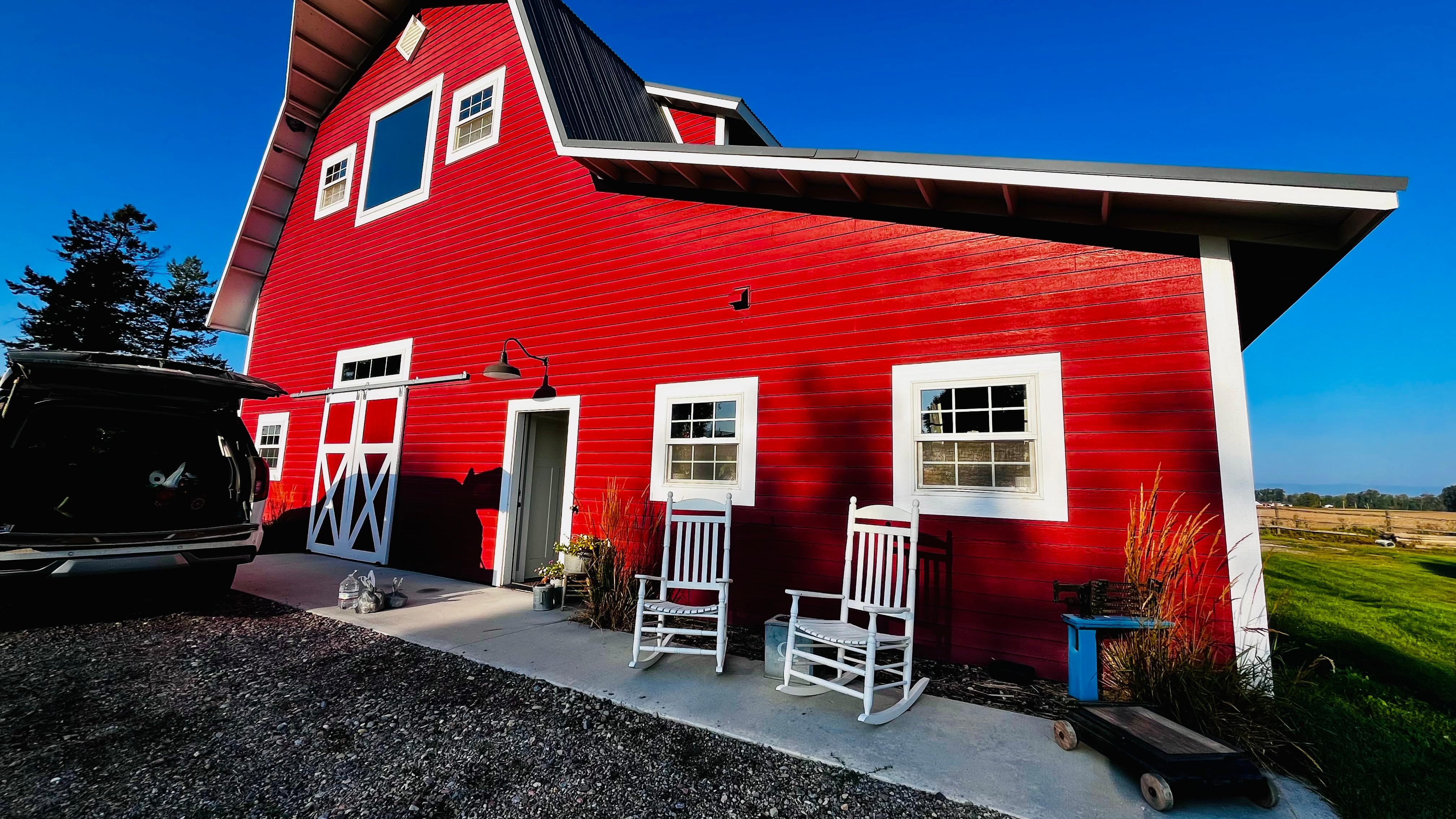 Our second story loft style apartment is decorated in a farmhouse vintage style. The happy red barn is a new addition to our farm which has been nestled on our quiet country road since 1918. The farm is conveniently located at the center of all the Flathead Valley has to offer: