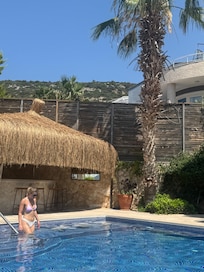 The outdoor space has multiple seating options with areas of both shade and sun throughout the day. The pool has step and ladder access and sunken bar seating.