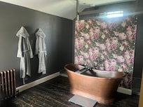 It has a large bathroom with a large freestanding copper bath, double sink and large walk in shower.