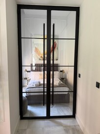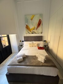 The bedroom, located adjacent to the living room, is very quiet and bright, with a balcony overlooking the street and a double bed. It includes a built-in wardrobe and a modern, fully equipped en-suite bathroom with a shower.