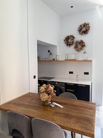 You enter through a hallway with large windows and glass doors overlooking the building’s entrance, where you can admire a beautiful Andalusian courtyard with greenery. At the end of the hallway to the right, you’ll find the elegant open-plan kitchen, fully equipped with all the utensils needed for a comfortable stay.