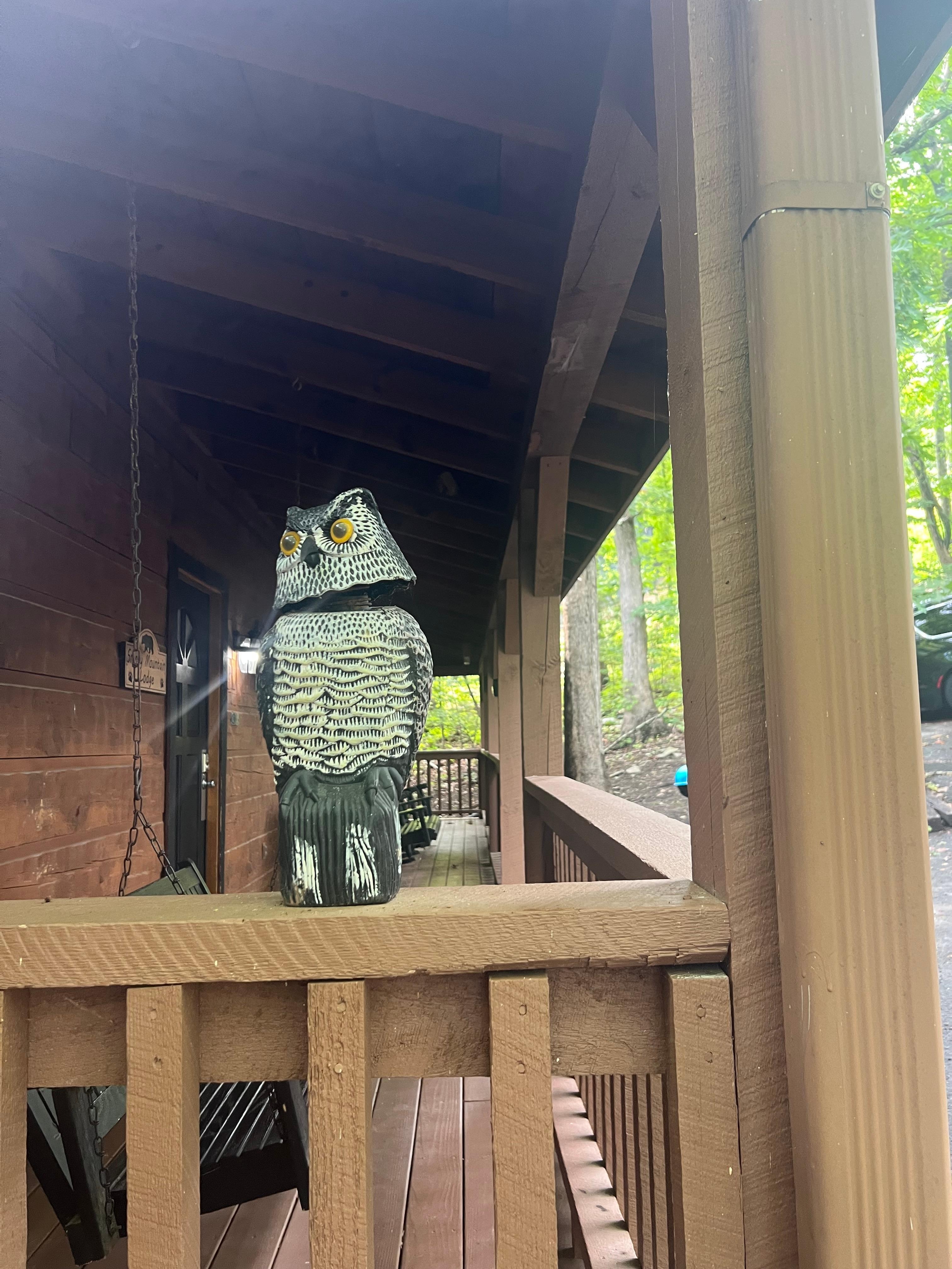 The outdoor space seamlessly blends relaxation and entertainment. The centerpiece is a spacious covered screened-in deck area, perfect for enjoying the fresh air while staying protected from the elements. In the covered area, you'll find a pool table for friendly games and a bubbling hot tub for ultimate relaxation. Adjacent to this area is an open-deck area featuring a table with seating for six, rocking chairs, and additional chairs with small tables, ideal for gatherings with friends and family. The serene wooded view creates a picturesque backdrop, enhancing the peaceful ambiance. At the front, a welcoming covered deck with rocking chairs and porch swings invites you to unwind and savor the tranquility of your surroundings. There is a propane grill on the back deck available for grilling up some hamburgers or hot dogs. This outdoor oasis is perfect for lively gatherings and quiet moments of leisure.