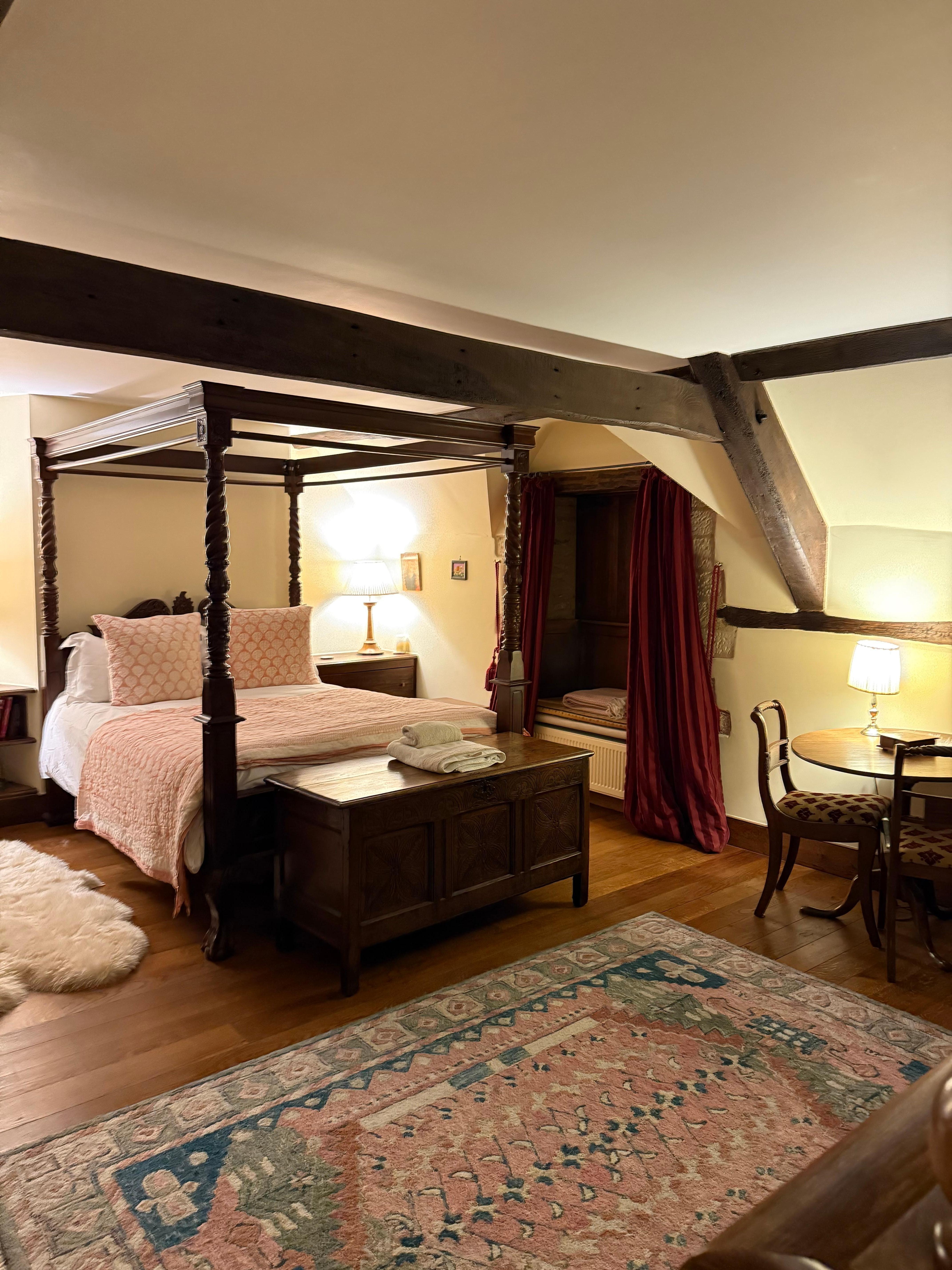 Cosy sitting room/dining room with flagstone floors, a large open fireplace, and a window seat
