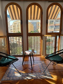 At the back to the right of the living room is the terrace, facing south with lots of light. It is covered and has a large window in 6 parts, all in transparent double glazing. All parts can be opened. The lower windows are equipped with mosquito nets. Roller blinds provide privacy and an electrically operated awning provides shade. The heating is electric. Low chairs and a glass table make the terrace cozy. From here you have a wide view above the trees, the square, the neighboring restaurants and the adjacent streets.