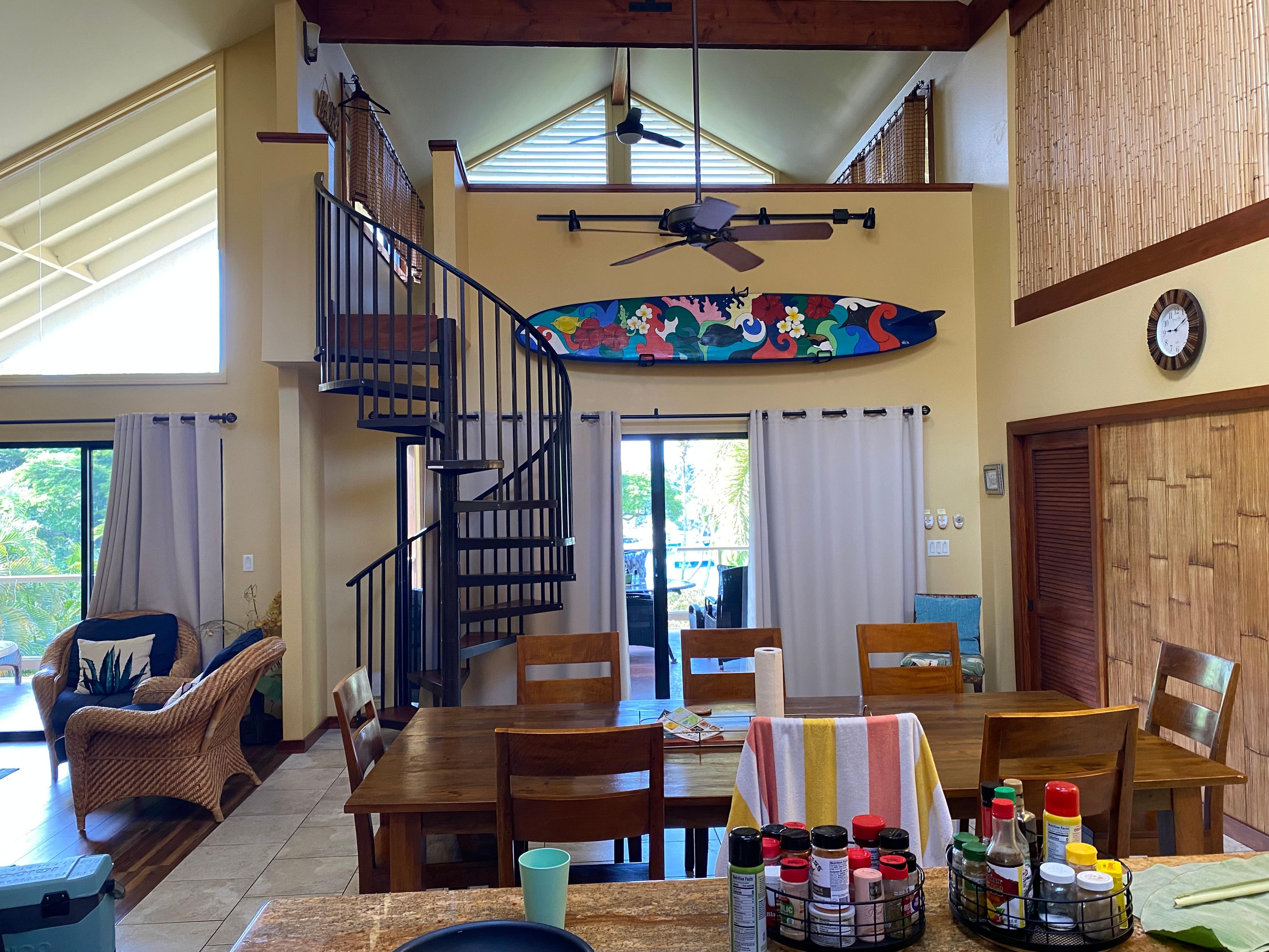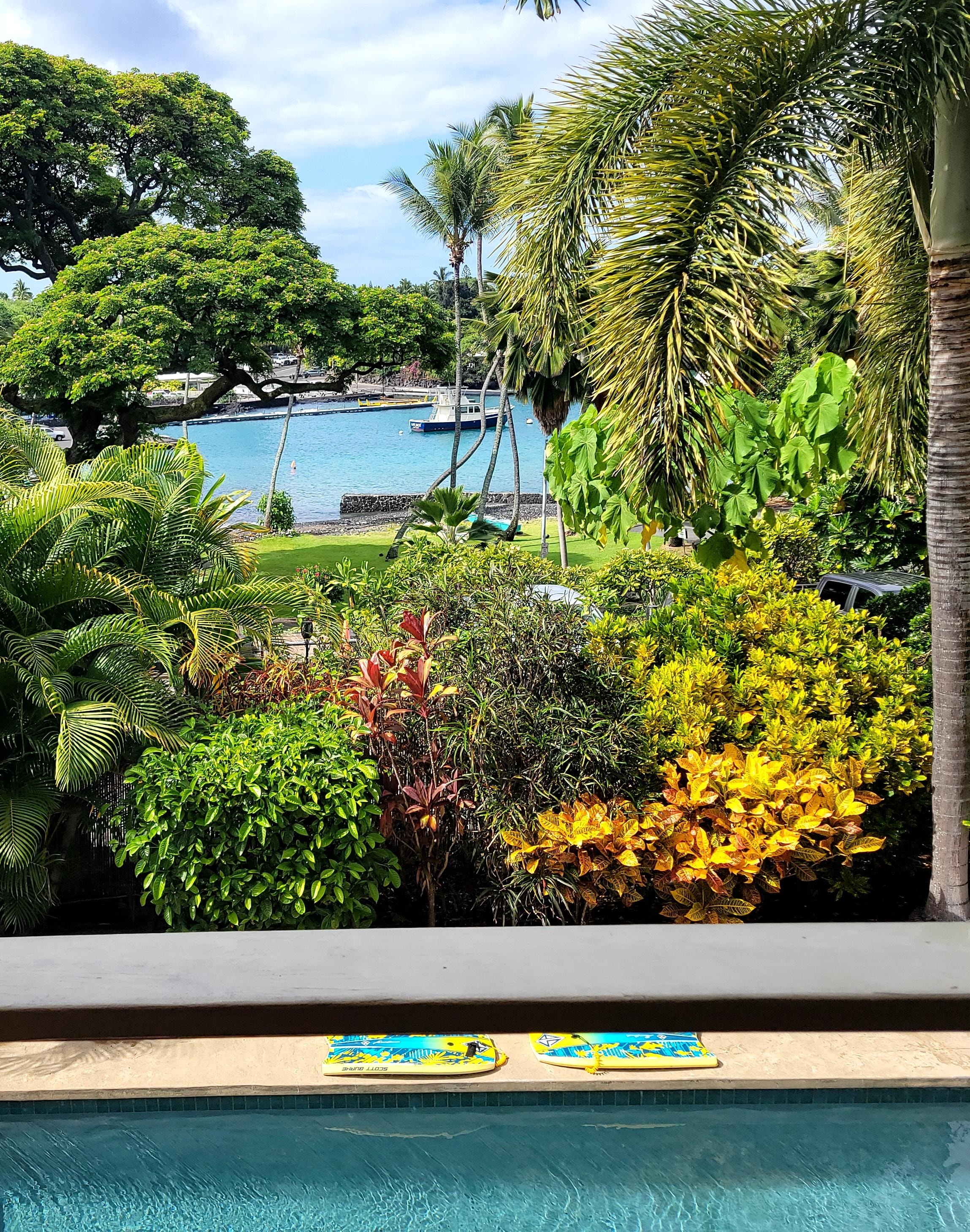 Beautiful home 120 steps from the warm waters of Keauhou Bay. House has 4 bedrooms, 2 1/2 baths and will comfortably sleep 8 in beds and up to 10 including futon couches. Fully equipped to give all the comforts of home while on holiday. Close to shopping, snorkeling excursions and other water activities. Great location for exploring all the adventures the Big Island has to offer. Small pool for the days you just want to stay home and relax between adventures. Wifi, internet, PS2, DVD, 3 flat screen TV's and stereos are also available for in home entertainment. Great fooseball table. Nicely equipped kitchen with bar and dining room table as well as comfortable seating outdoors on the lanai. Who wants to sit indoors when there is such a great view from the lanai? Waterfront view of Keauhou Bay, plus beach toys (including SUP) to enjoy all the bay has to offer. Keauhou Bay offers rec paddling with the local outrigger club, snorkeling tours, world famous manta ray dives, sand volleyball courts, SUP and deep sea fishing charter boats. Walking distance to Keauhou shopping center which has a movie theater, grocery shopping, drugstore and restaurants. This home is also air-conditioned! Bonus! Washer and dryer available for guests, so pack light:) Private front driveway has room for several rental cars. Come to see the lava flowing and stay at your own private resort