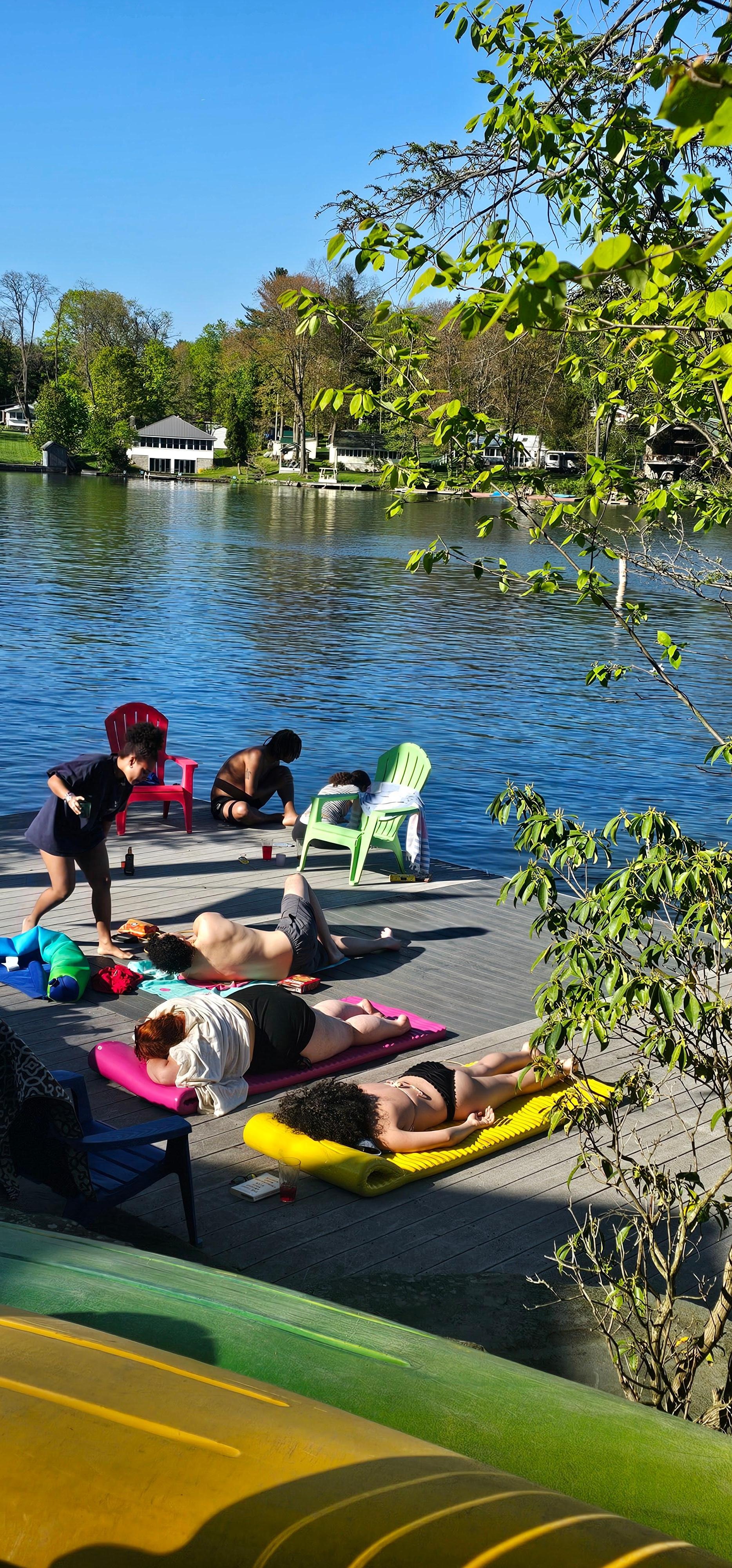 There are two paddle boats, 1/2 person canoes, 4/1 person kayaks, 4/1 person youth kayaks, and a yellow floating dock about 20 feet from the permanent dock. We also have a significant number of life jackets.