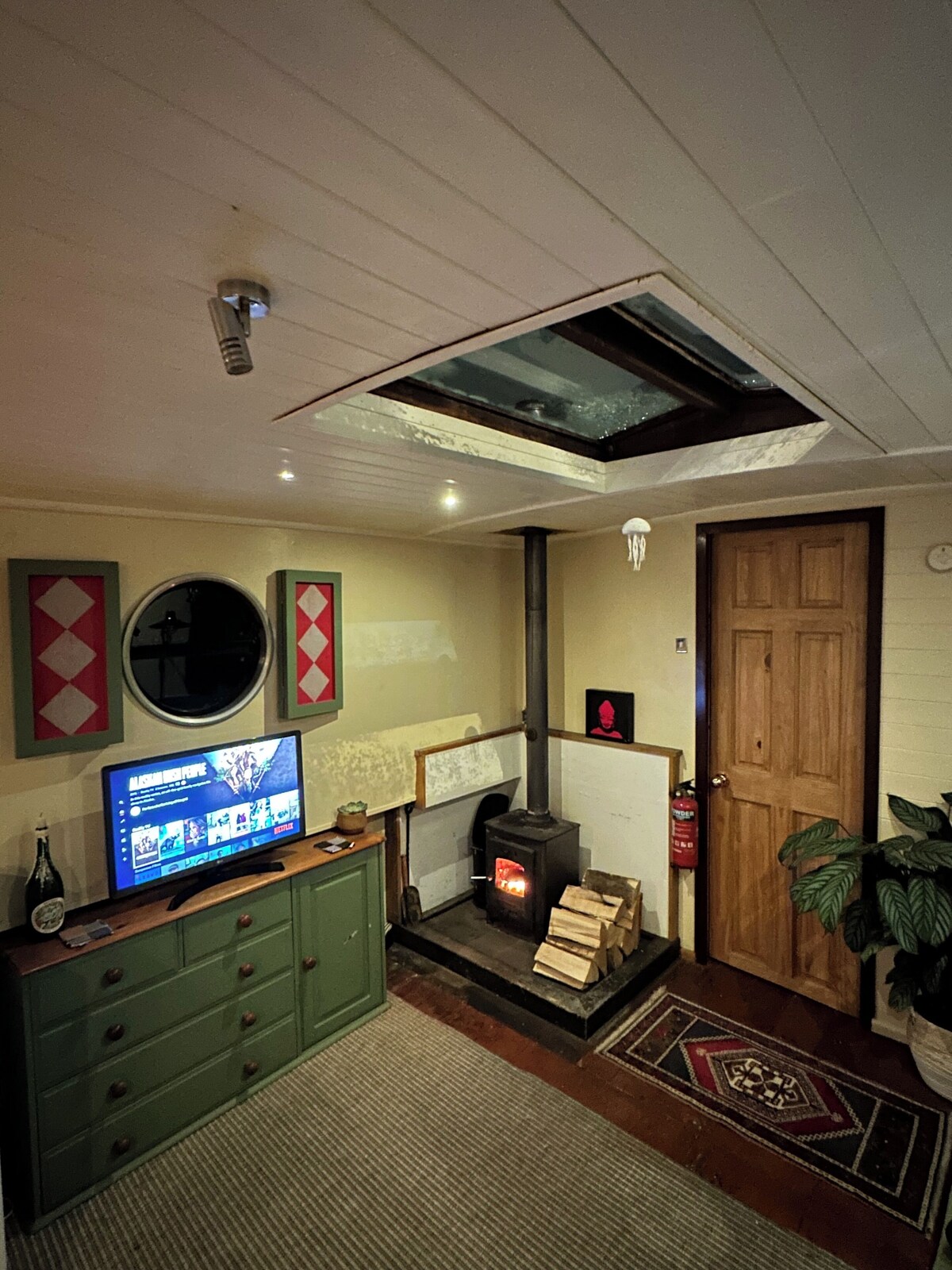 Inside, the barge is warm and inviting. The layout features a cosy bedroom at one end, with a comfortable living room and fully-equipped kitchen at the other. You enter the boat through the wheelhouse, a spacious and light-filled area with stunning views over the river. The wheelhouse can be used as a dining space, a spot to enjoy your morning coffee, or simply a place to relax and take in the peaceful surroundings.