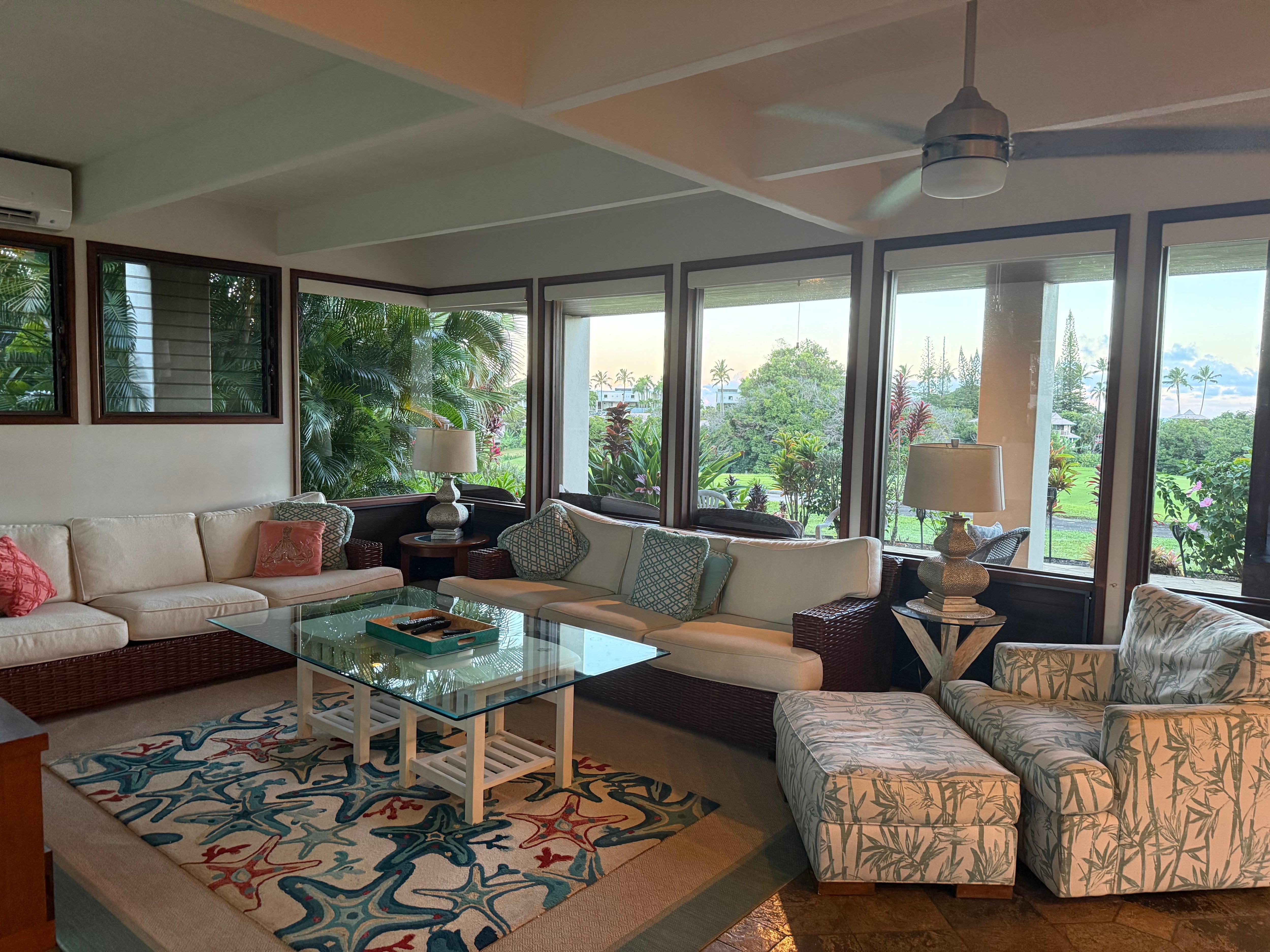 The Living Room: A/C in Living Room. Large Flat Screen TV with Cable, Netflix. Huge Windows that face the Makai Golf Course 2nd Green.
