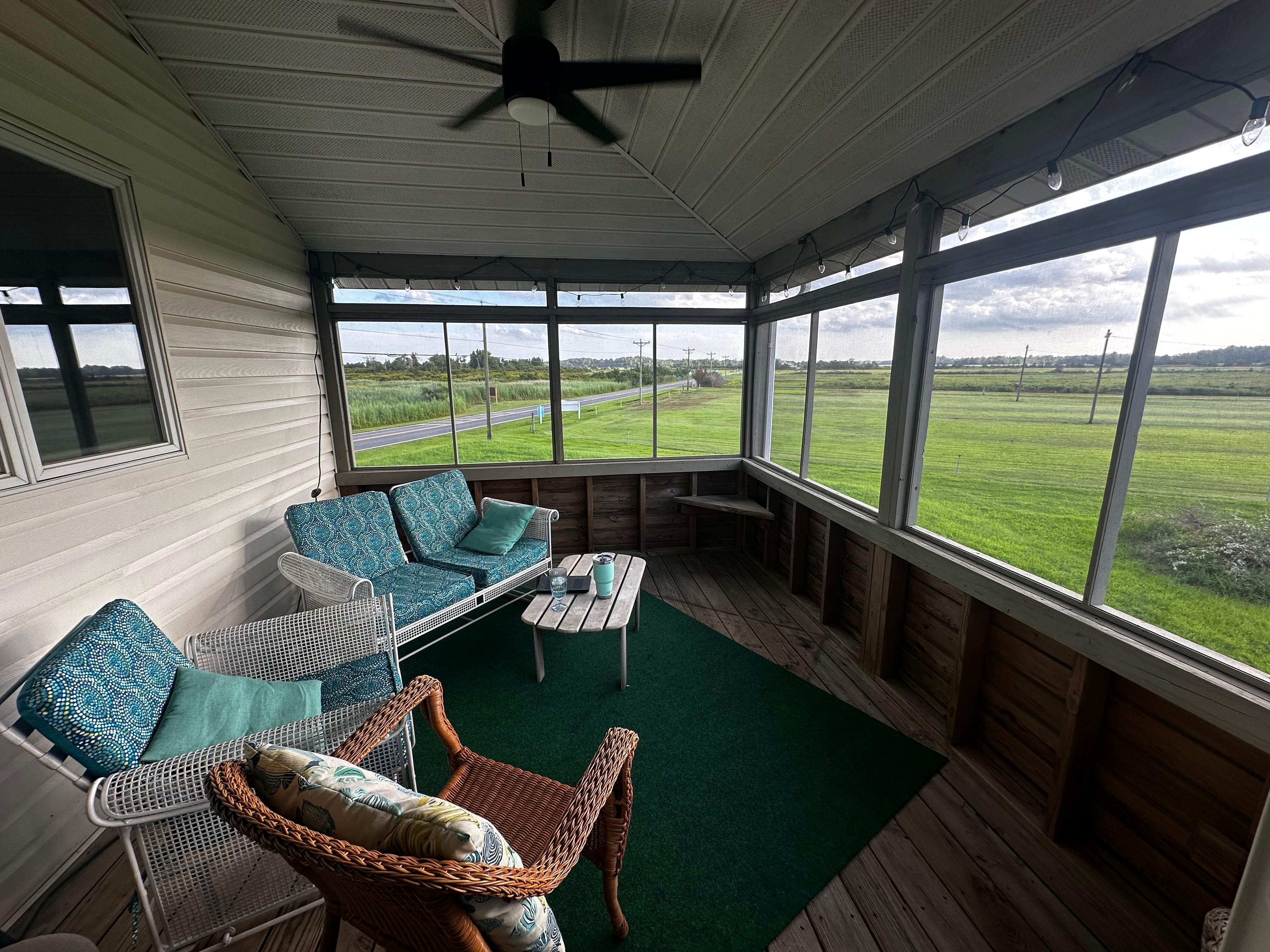 Dining/kitchen area with a comfy sitting area for watching smart TV, screened in porch out back.