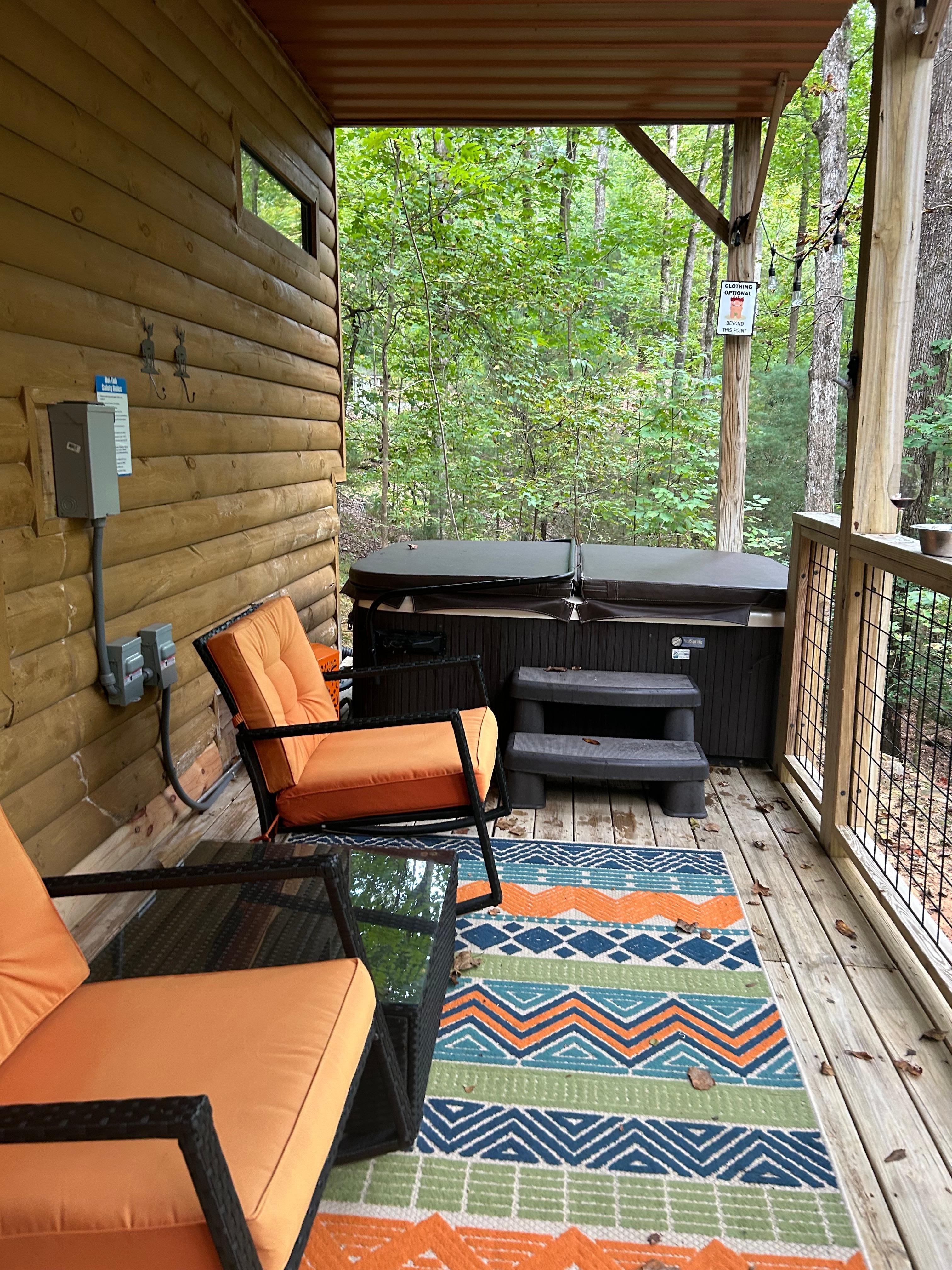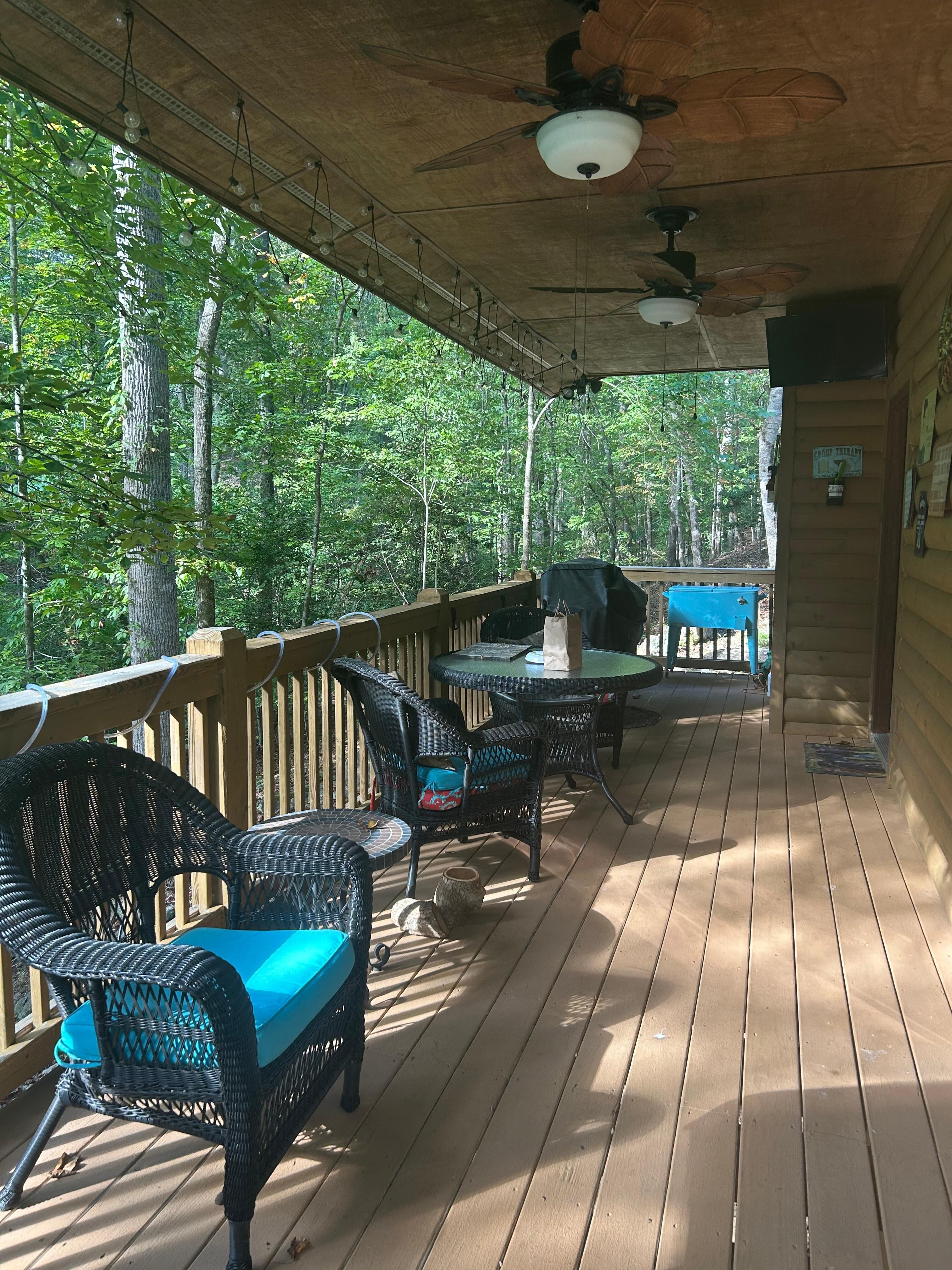 The cabin is spacious and comfortable with an open floor plan. It has a nice flow offering ease of movement. It is uniquely outfitted with multiple lounging areas. There are 4 furnished outdoor areas giving you the opportunity to change your views as often as you like. You won't get bored here. The side covered deck is popular as it often gives you the chance to see a family of deer that have been living below for generations. Each deck has its own individual character, lighting, and different experiences. There is a laser light show lamp that gives night life to the forest. It is entertaining, and relaxing to watch the lights dance in the trees. It turns on from the downstairs deck and can be seen on both levels and enjoyed from the hot tub, the fire pit, and the swing..
