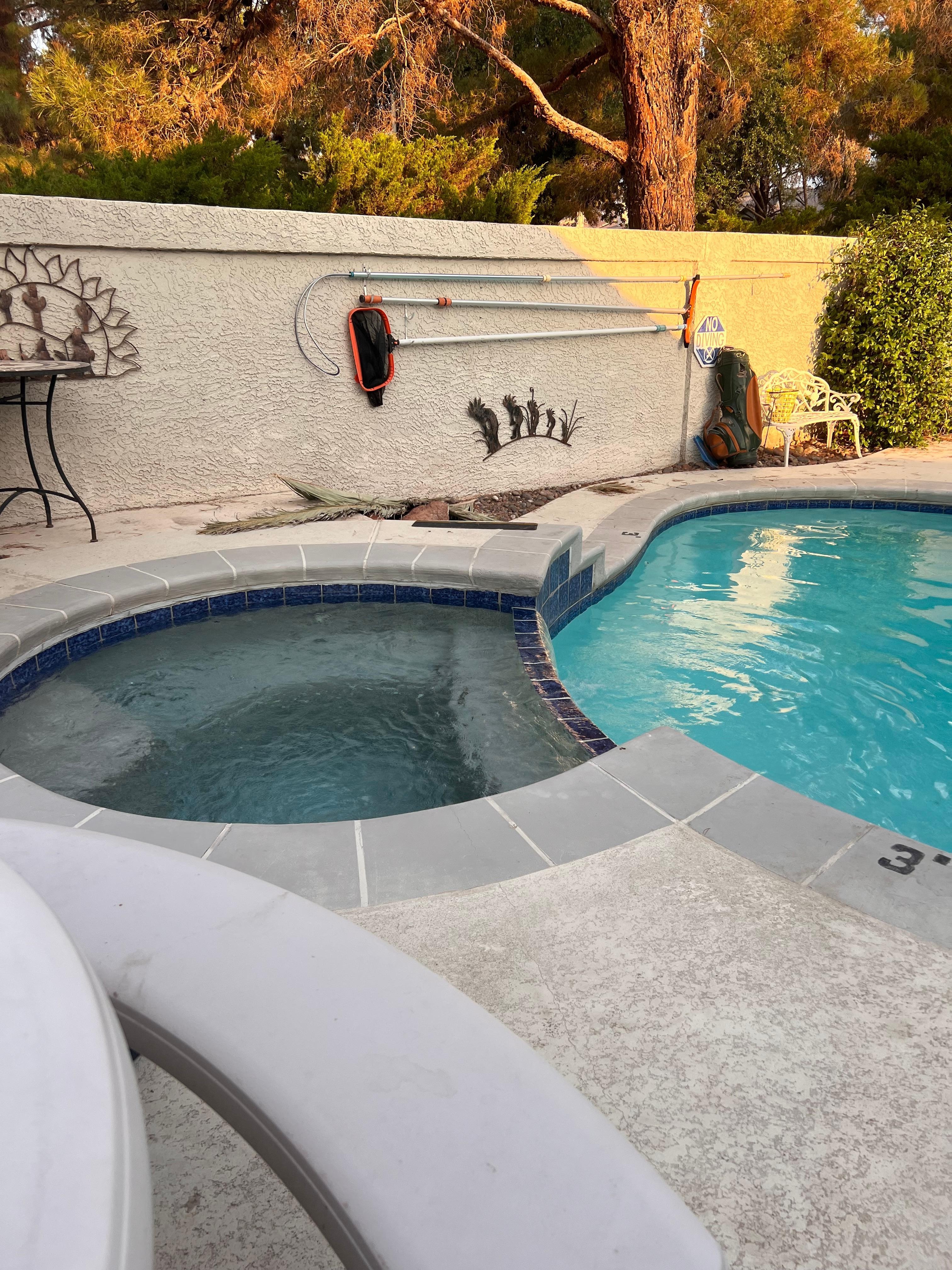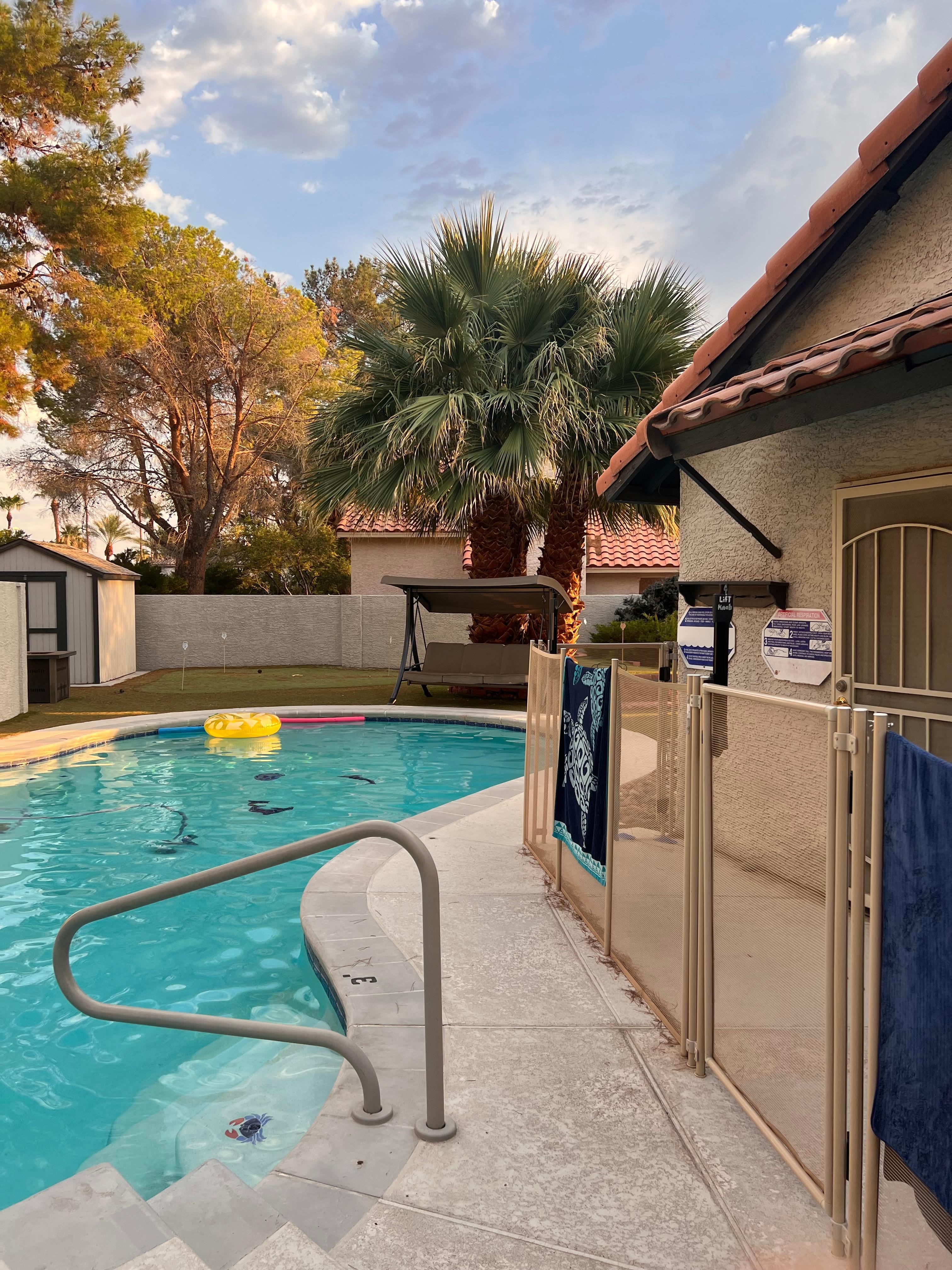 FANTASTIC single level/ Bungalow/Ranch style mostly SOLAR powered home. Child safety fence between HOUSE PATIOS & POOL & SPA/HOT TUB. Fast internet, bring your streaming devices. 9 HOLE MINI Pitch & Putt course in the yard, artificial GREENS & Grass. WILD HORSE Golf course (Public) across Warm springs Road( very nice course). Corner babbling brook fountain, GIANT PALM TREES, 3 bedrooms with KING size Master & ENSUTE. 2 QUEEN size beds, pull up bed & couch. DINING/POKER ROOM. Stocked Kitchen with BREAKFAST EATING BAR, GRANITE COUNTER TOPS, EATING NOOK viewing to the yard & fountain. OUTSIDE BBQ, Mini bar fridge, PATIO's with tables for eating & covered GAZIBO, very RELAXING. Super location & private setting large Yard. Double car garage for indoor parking. close to Las Vegas Strip & Airport. Cool weather POOL Heat is $100/day available for Autum, Winter & Spring Heating to 82 -85 degrees +-. Spa Heat is also available , no extra charge. SHORT TERM VACATION RENTAL CITY OF HENDERSON. STVR REGISTRATION NUMBER: STR19-00118, 2024 registration: STR19-00079