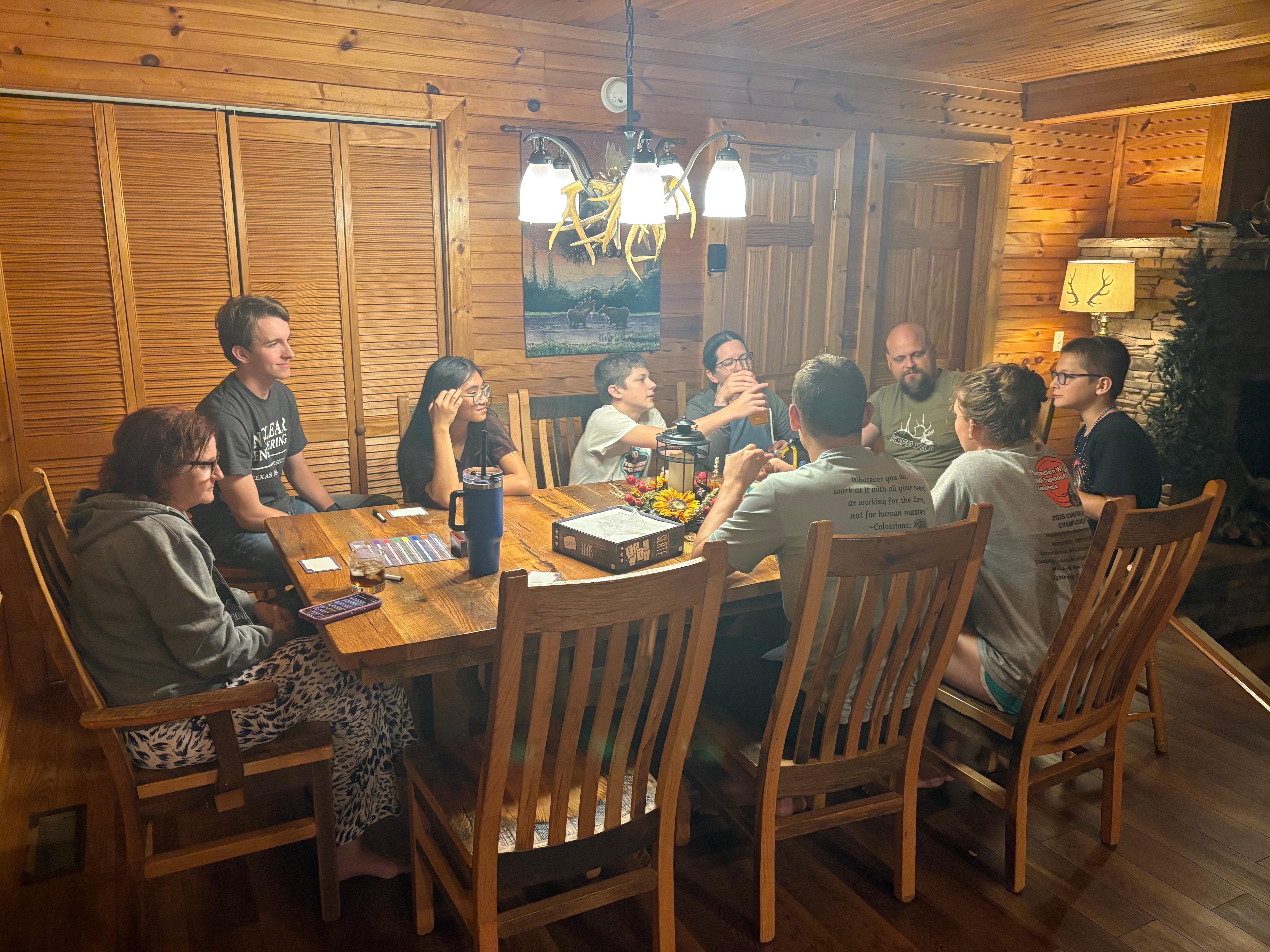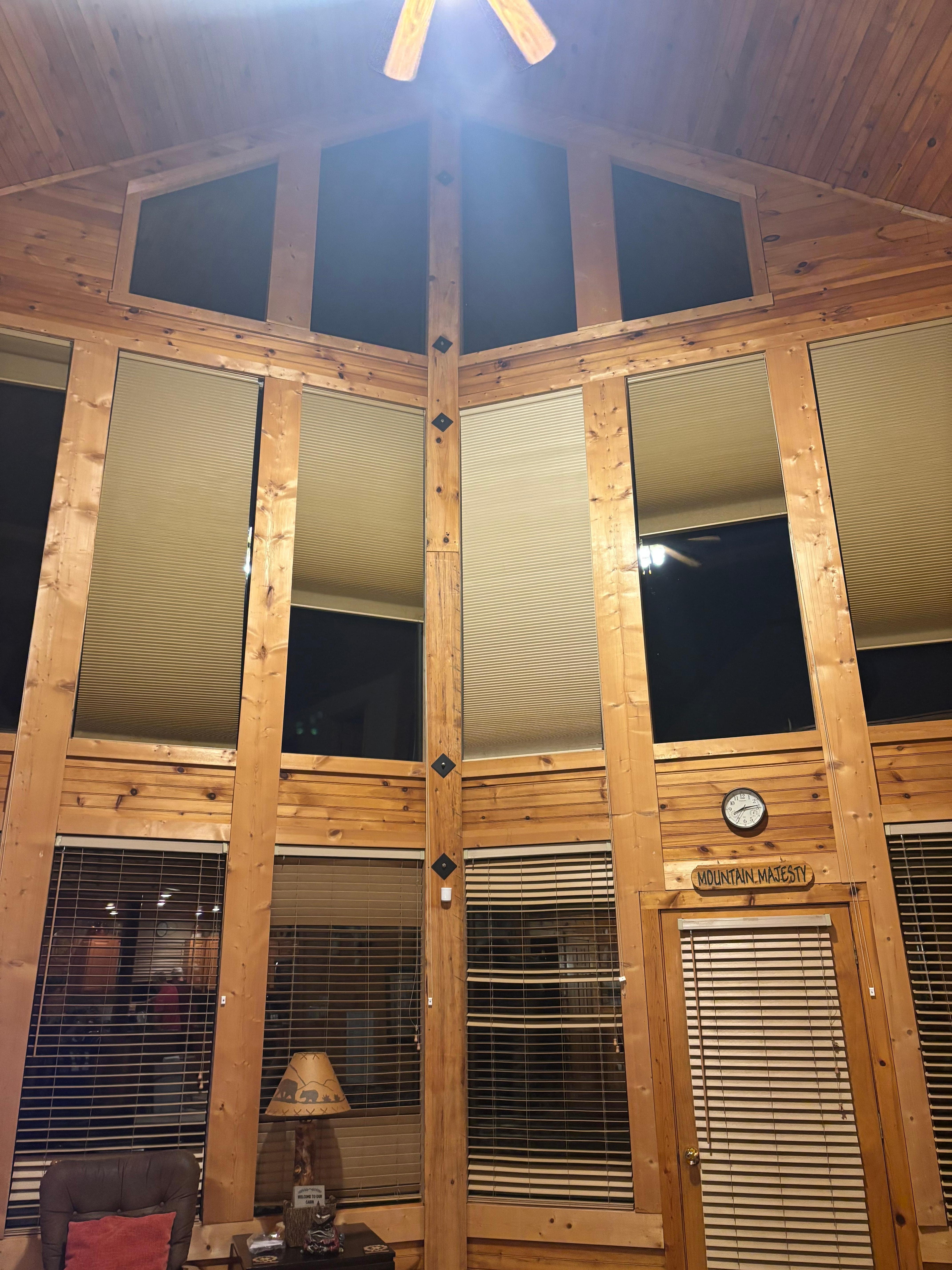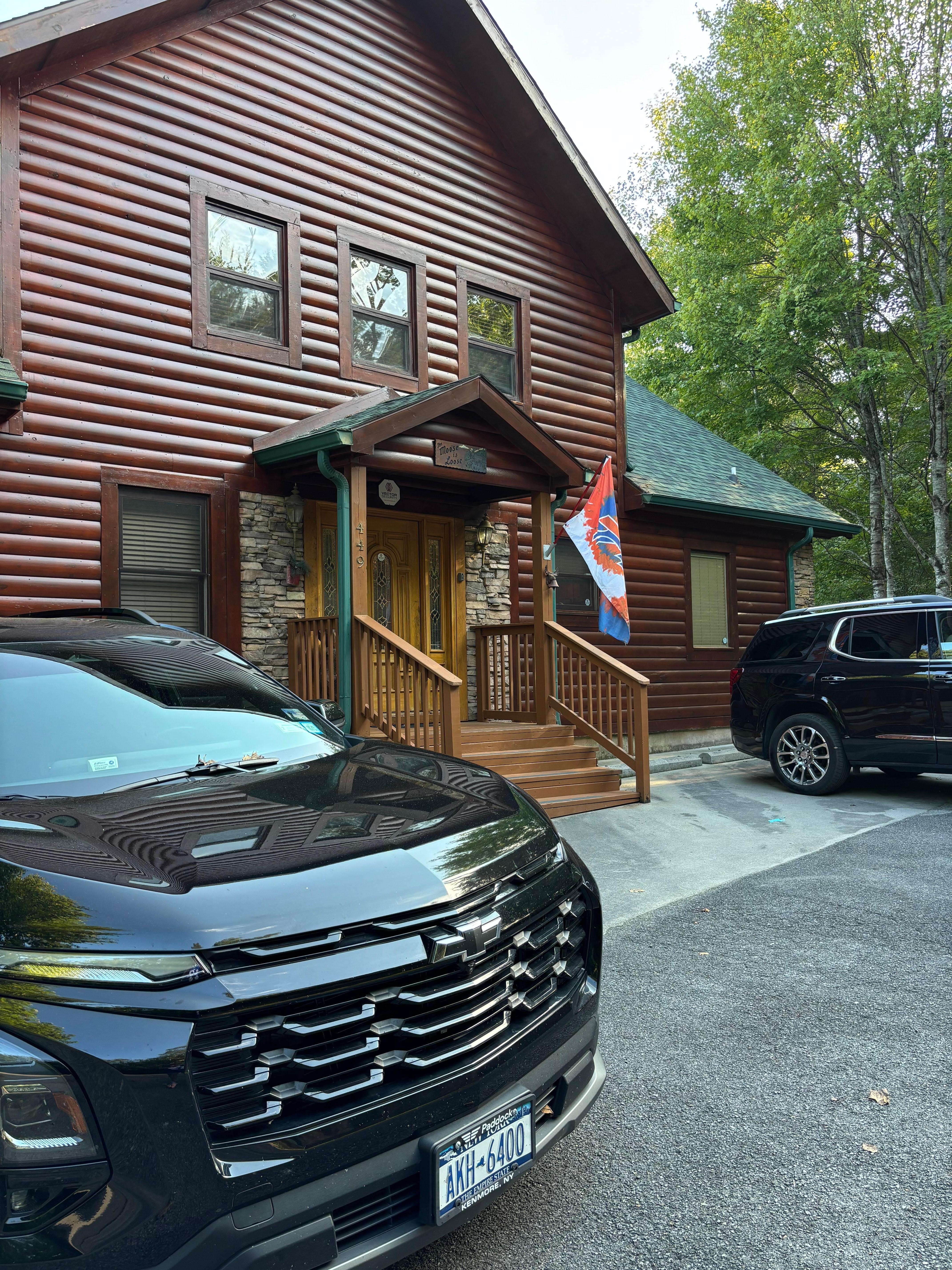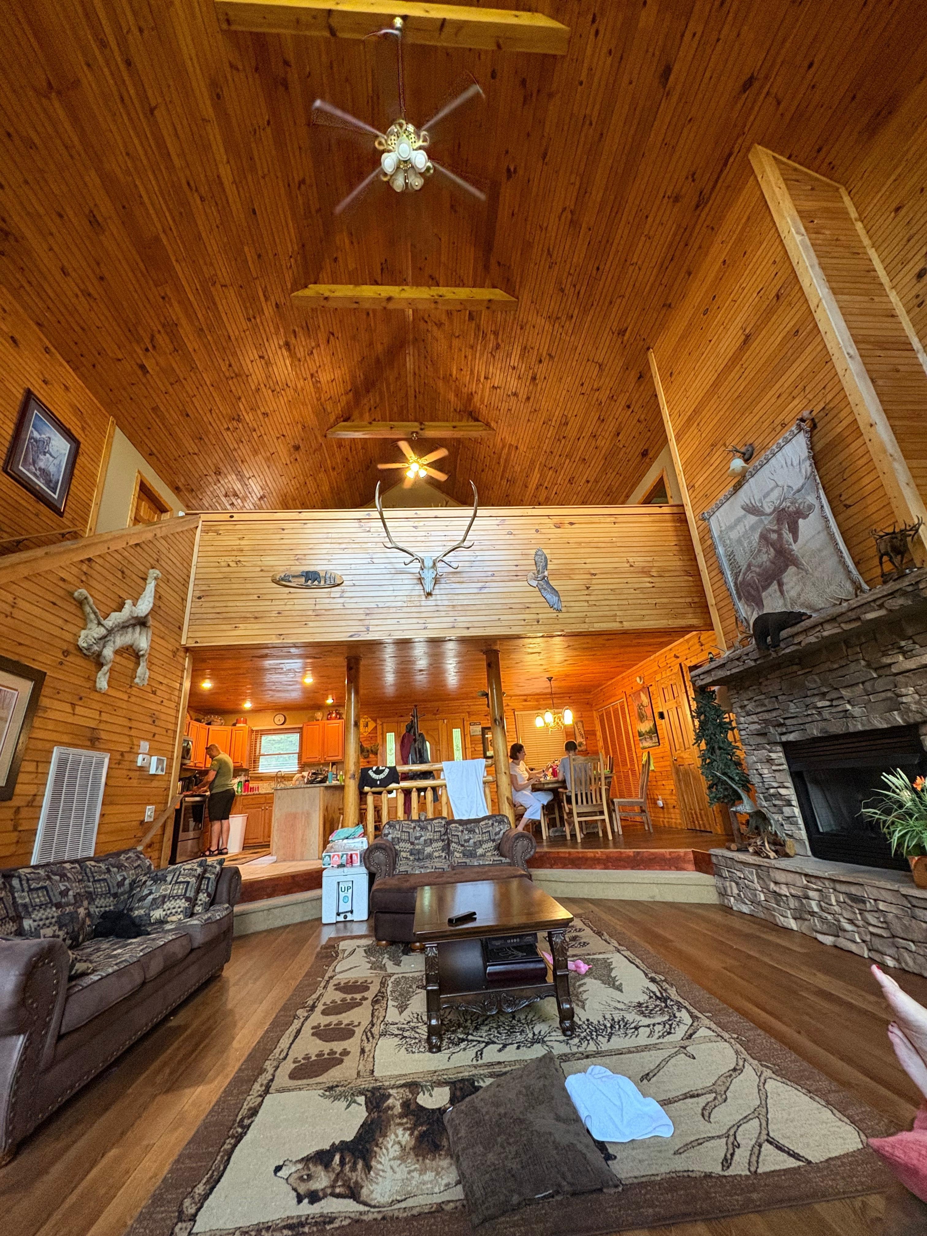 You’ll find additional entertainment options back inside. The loft’s game room hosts an eye-catching log-frame pool table and an air-hockey table. The cabin’s sixth TV is up there as well, along with a pair of leather couches ideal for stretching out on with a good book or for a good nap.