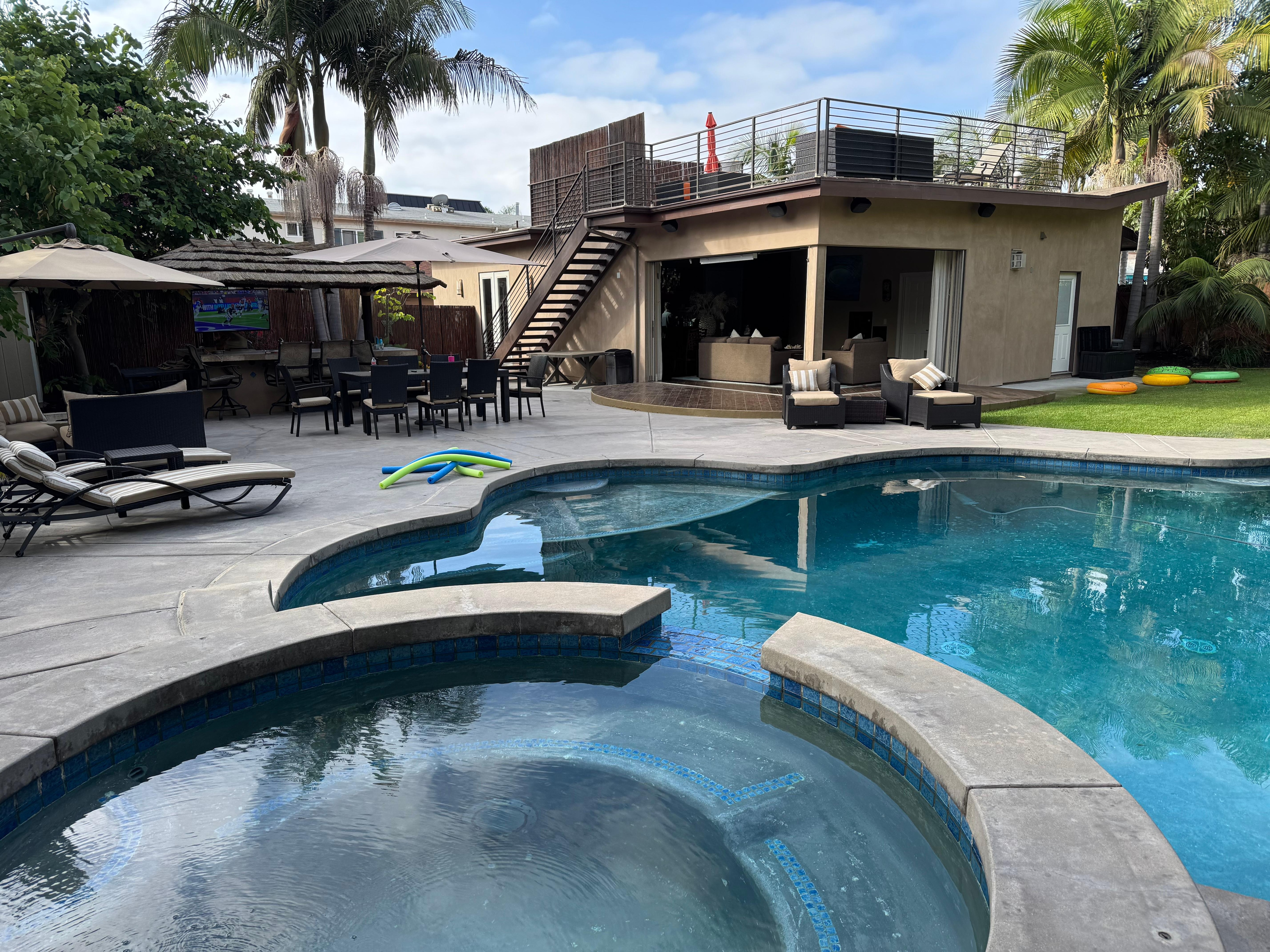 This is one of the biggest properties in Pacific Beach. The backyard is a private tropical oasis with HEATED POOL. All the bamboo has grown in. We have brand new waterproof palapa with 65 inch TV. All brand new patio furniture. Doors open into wall for indoor outdoor airflow. It’s perfect for 2 families with kids. When you walk in you have kids to the left in 2 bedrooms. Parents to the right with en-suite bathroom. Please come and enjoy our beautiful oasis.