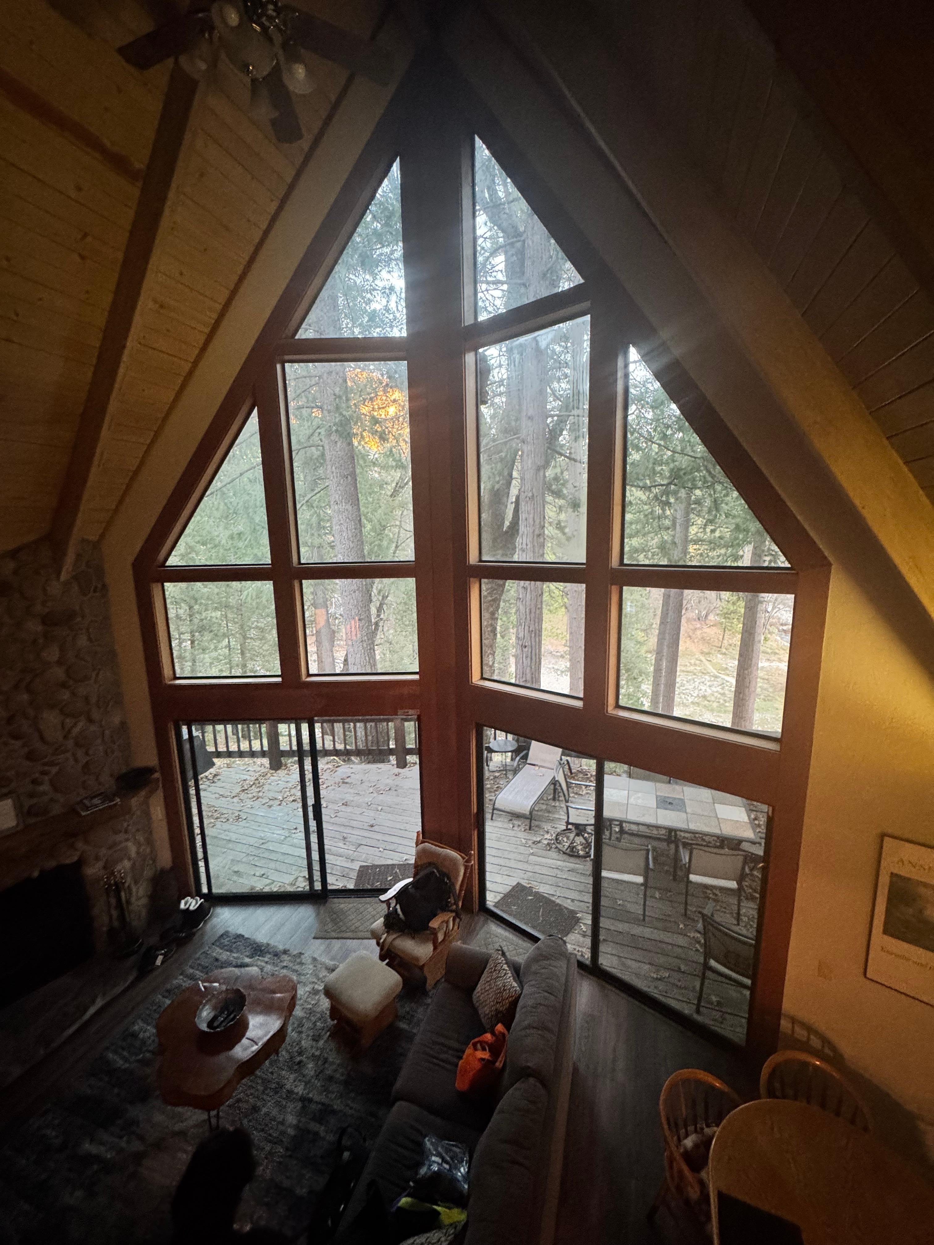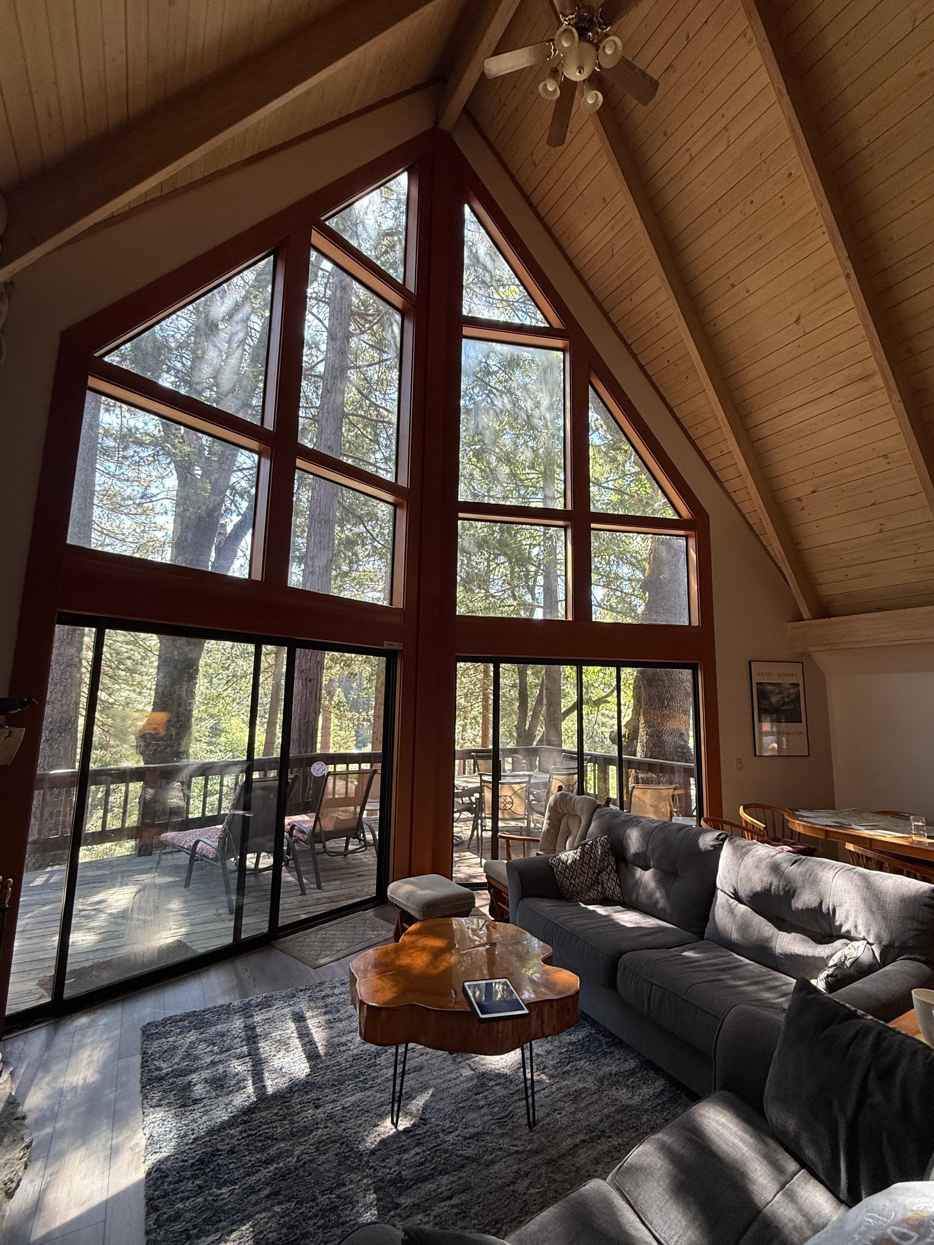 Riverview is a beautiful, wooden, two-story, A-Frame cabin, with floor to ceiling windows that overlook the South Fork of the Merced River. The open plan living and dining area includes gorgeous floor to ceiling glass and a Fireplace. Major remodeling to the kitchen completed on Feb. 15, 2022. With three bedrooms and two bathrooms, including a master suite, this charming cabin accommodates families and groups. Extra sleeping is available in the loft. Nestled in the quaint village of Wawona inside Yosemite National Park, Riverview cabin allows for the full Yosemite National Park experience. For 2024 you will not need a reservation to enter the Park when you are staying at my cabin which is inside the Park.