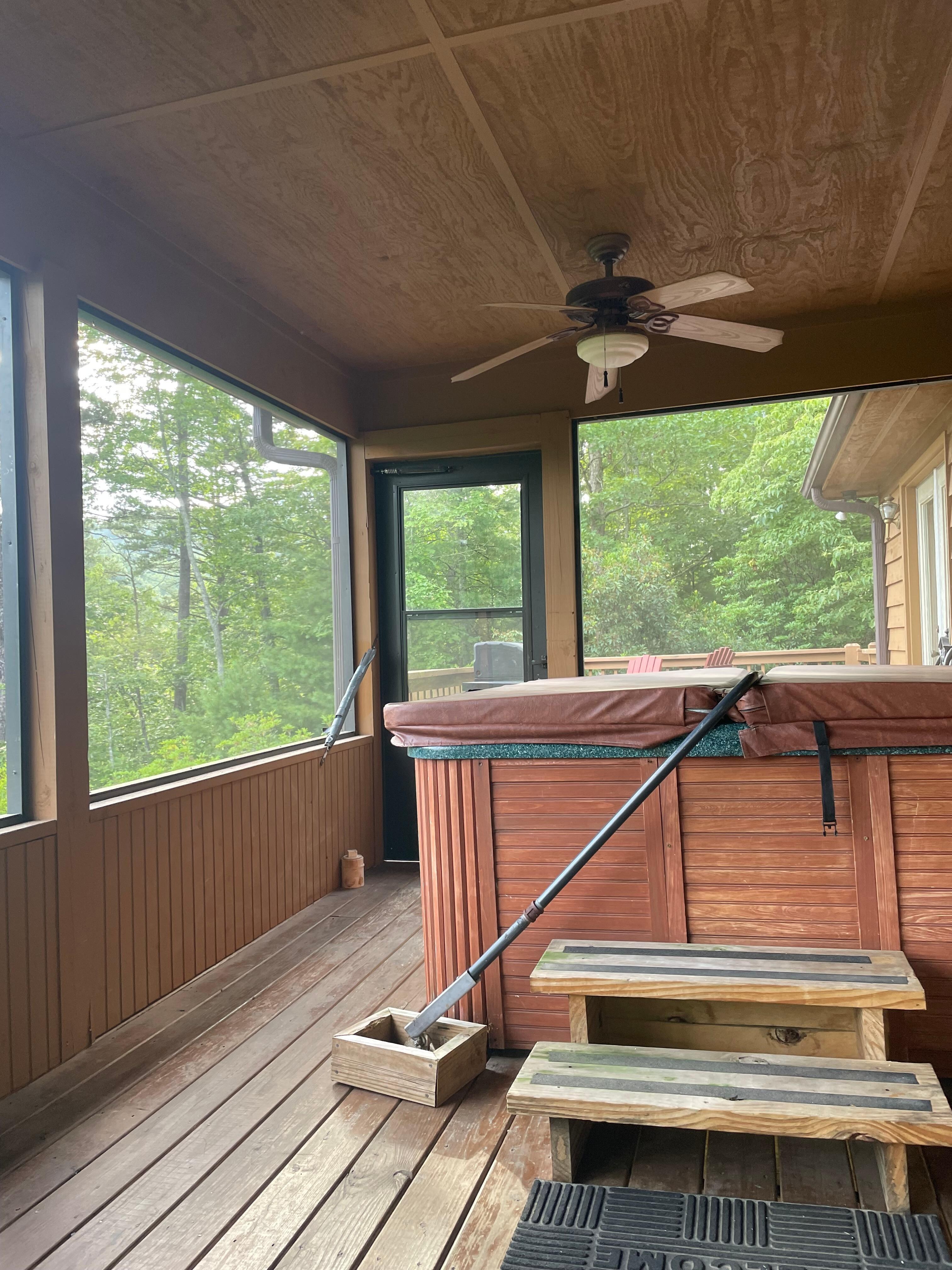 Beautiful view and very clean cabin. I reported to Georgia Mountain Rentals that the French doors leading to the screened in deck could be pushed open even when locked. The couch and chair needs to be replaced due to padding being worn. Queen bed was comfortable. The only other thing was a Keurig coffee maker was listed so we bought k-cups and they would not fit the Hamilton Beach coffee pot that was there. Quiet place and the hot tub was great! Close to Unicoi State Park and a few miles to Main St. Helen.