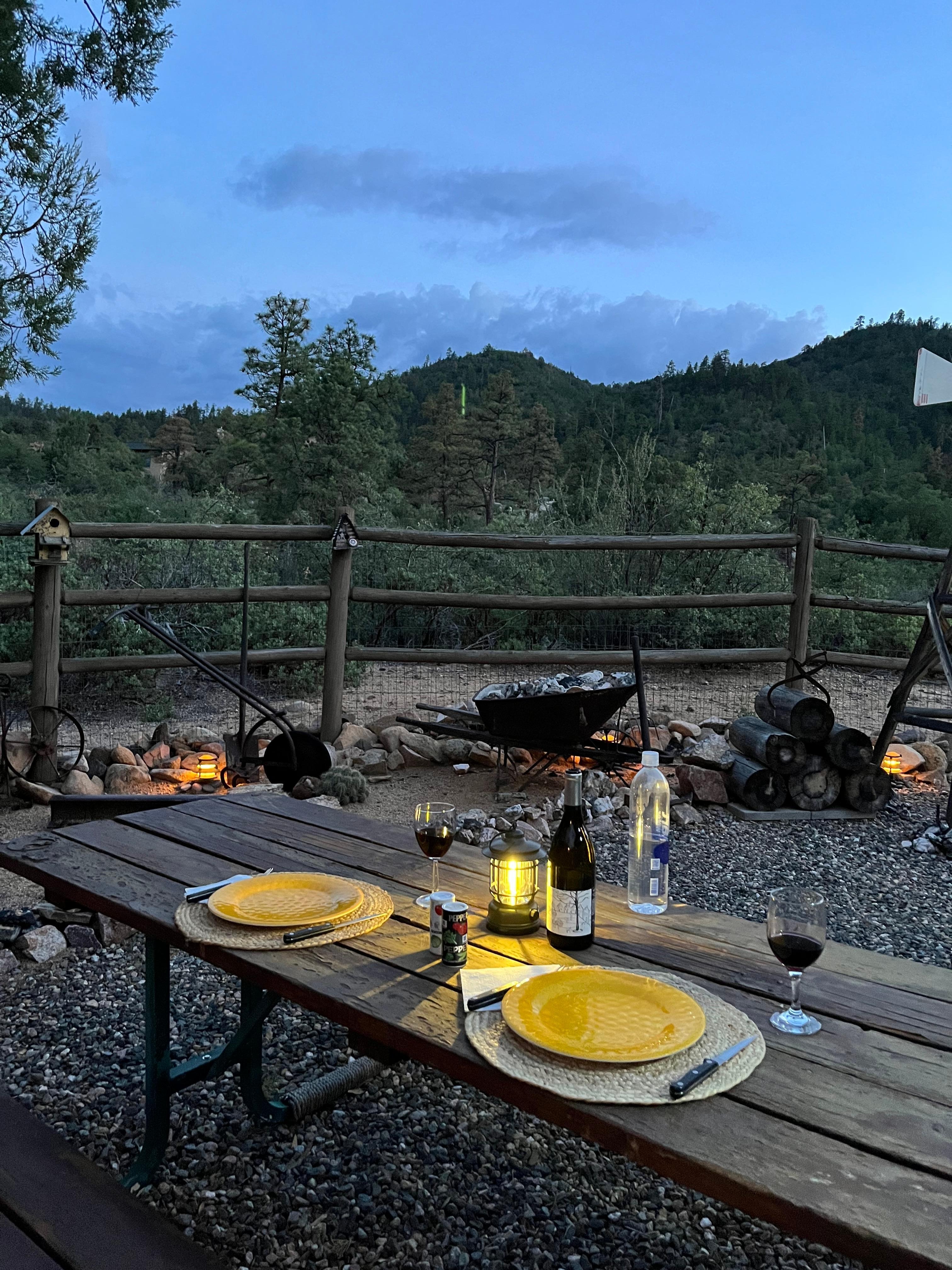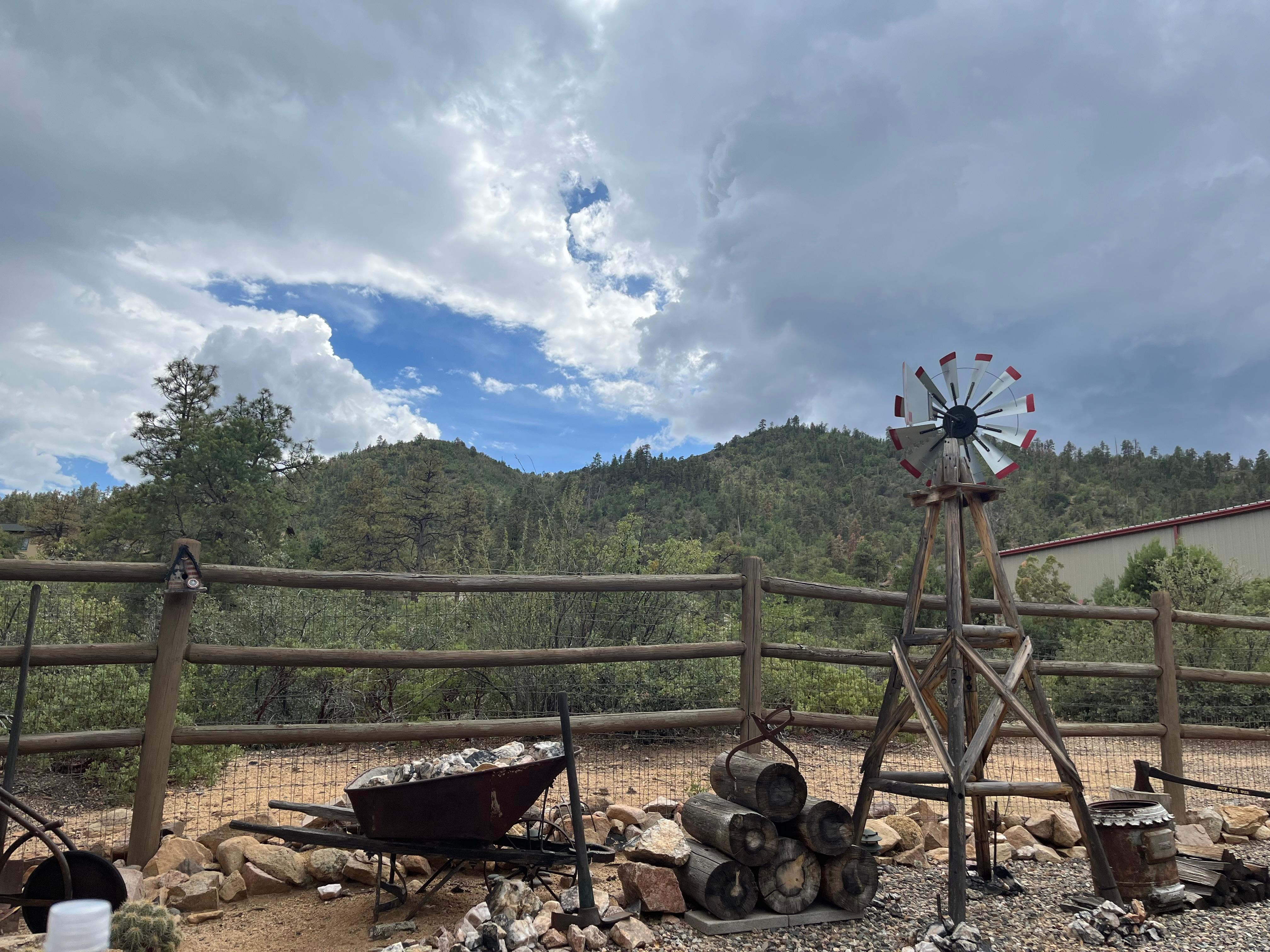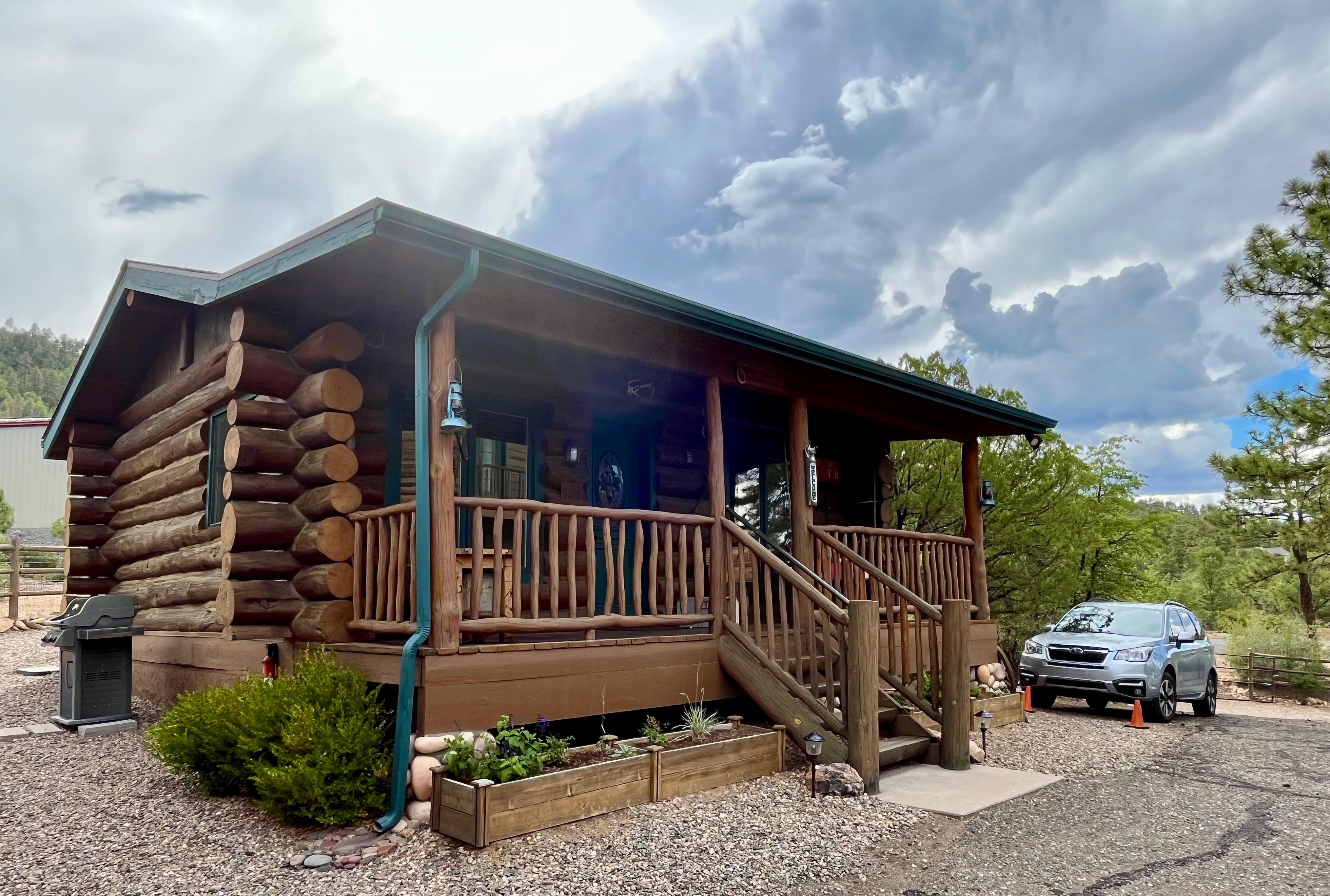 Our property is adjacent to the Prescott National Forest. Relax outdoors, gazing at the mountains while listening to the wind blow through the trees. Take a walk around the property or go for a hike or bike ride without having to get in the car and drive. Our log home is situated across from the cabin. Guest privacy is our foremost priority.