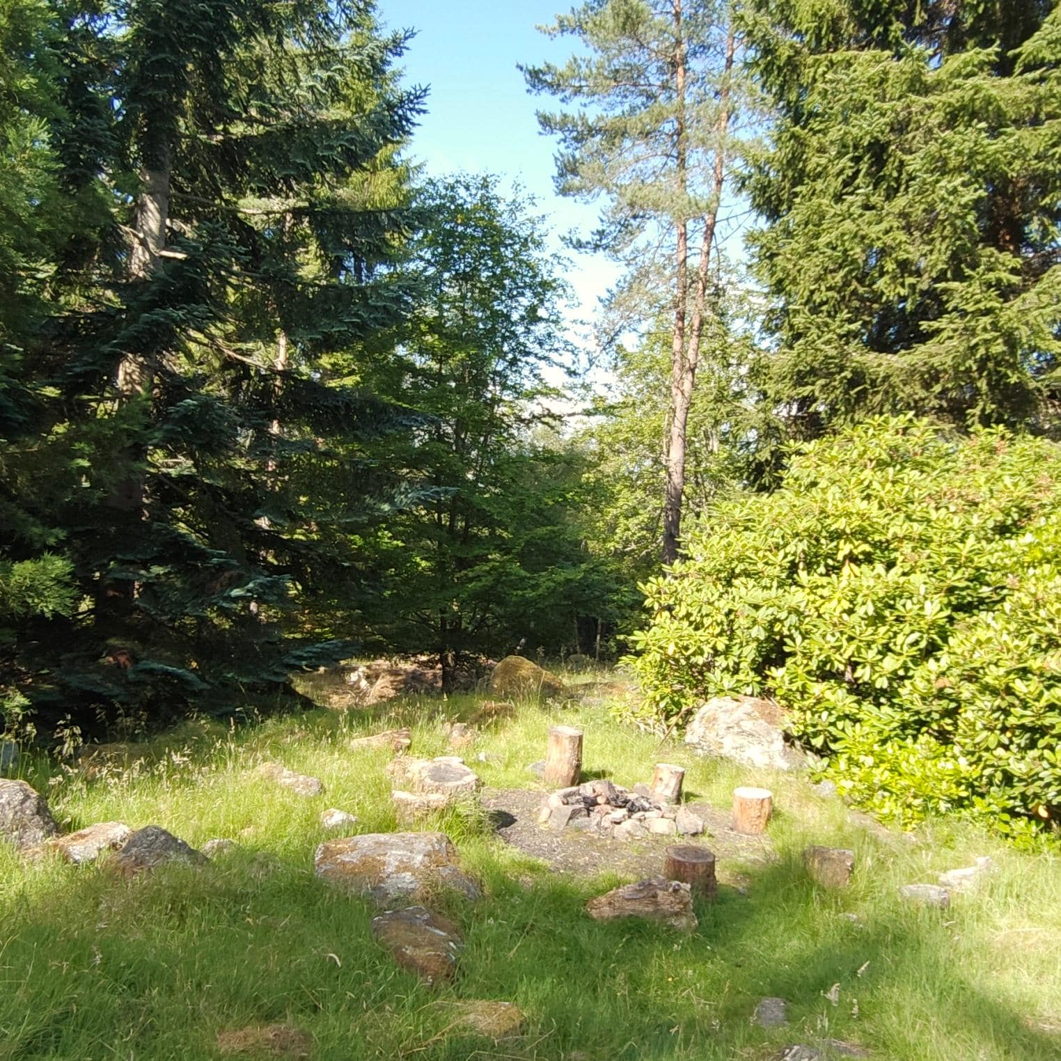 It's set in a 4.4 acre site with a mix of grass, rocks, trees and shrubs running down to a stream, shading over into a large area of open woods and moorland around.
