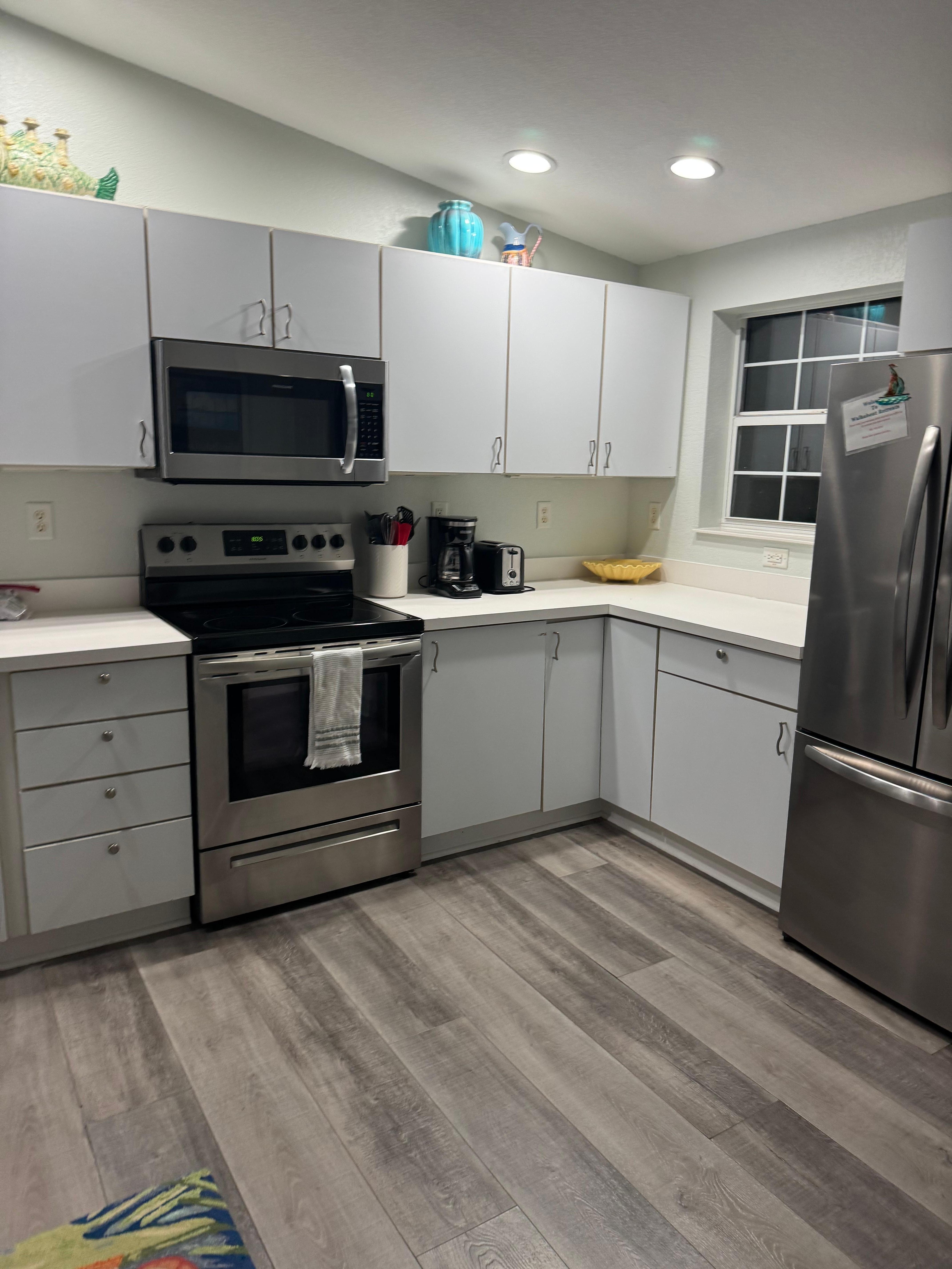 •Kitchen: Fully stocked with blender, toaster, coffee maker, microwave oven. Full supply of; dishes, bowls, silverware, stemware, drinking glasses, pots, pans and utensils.