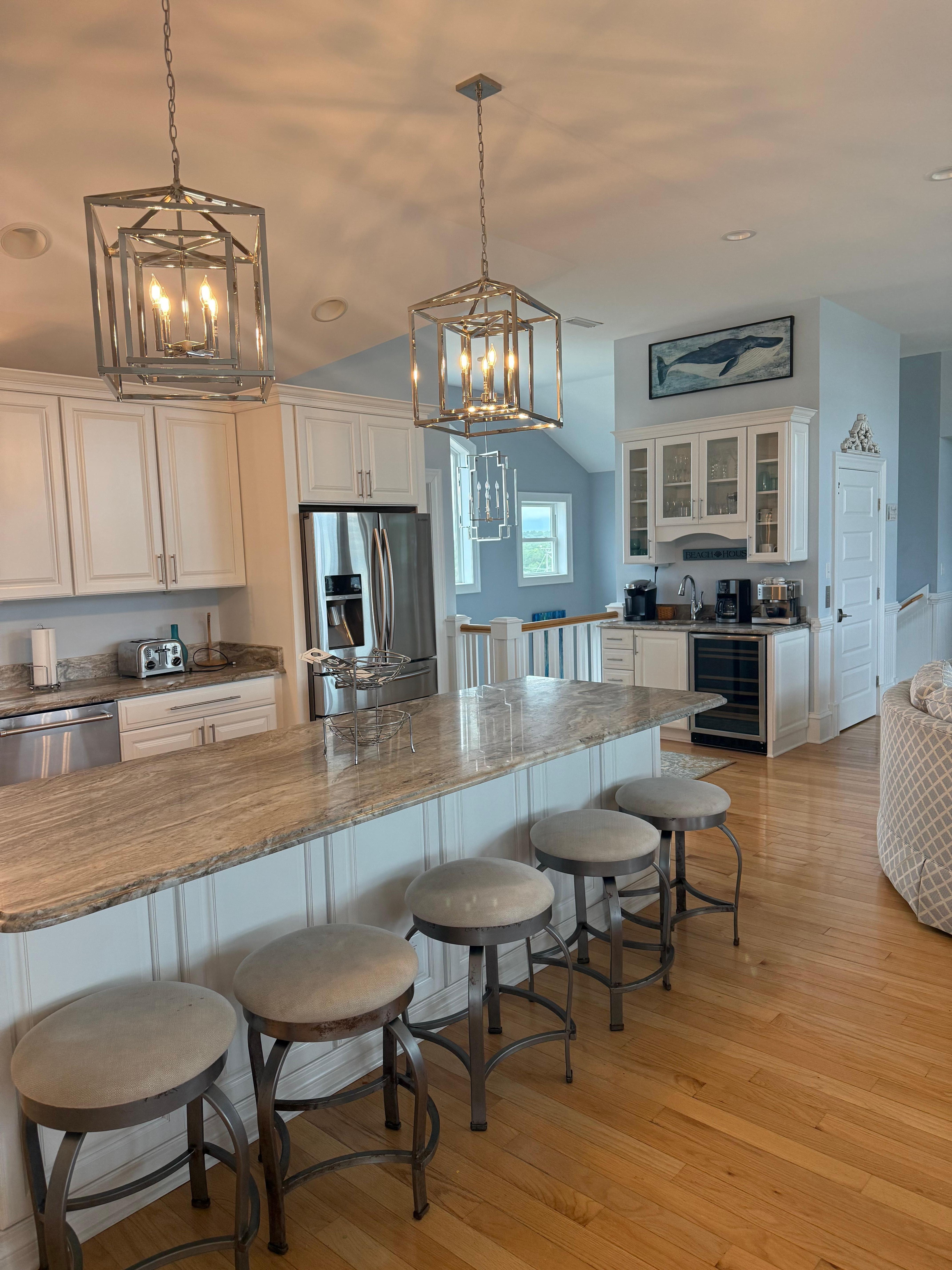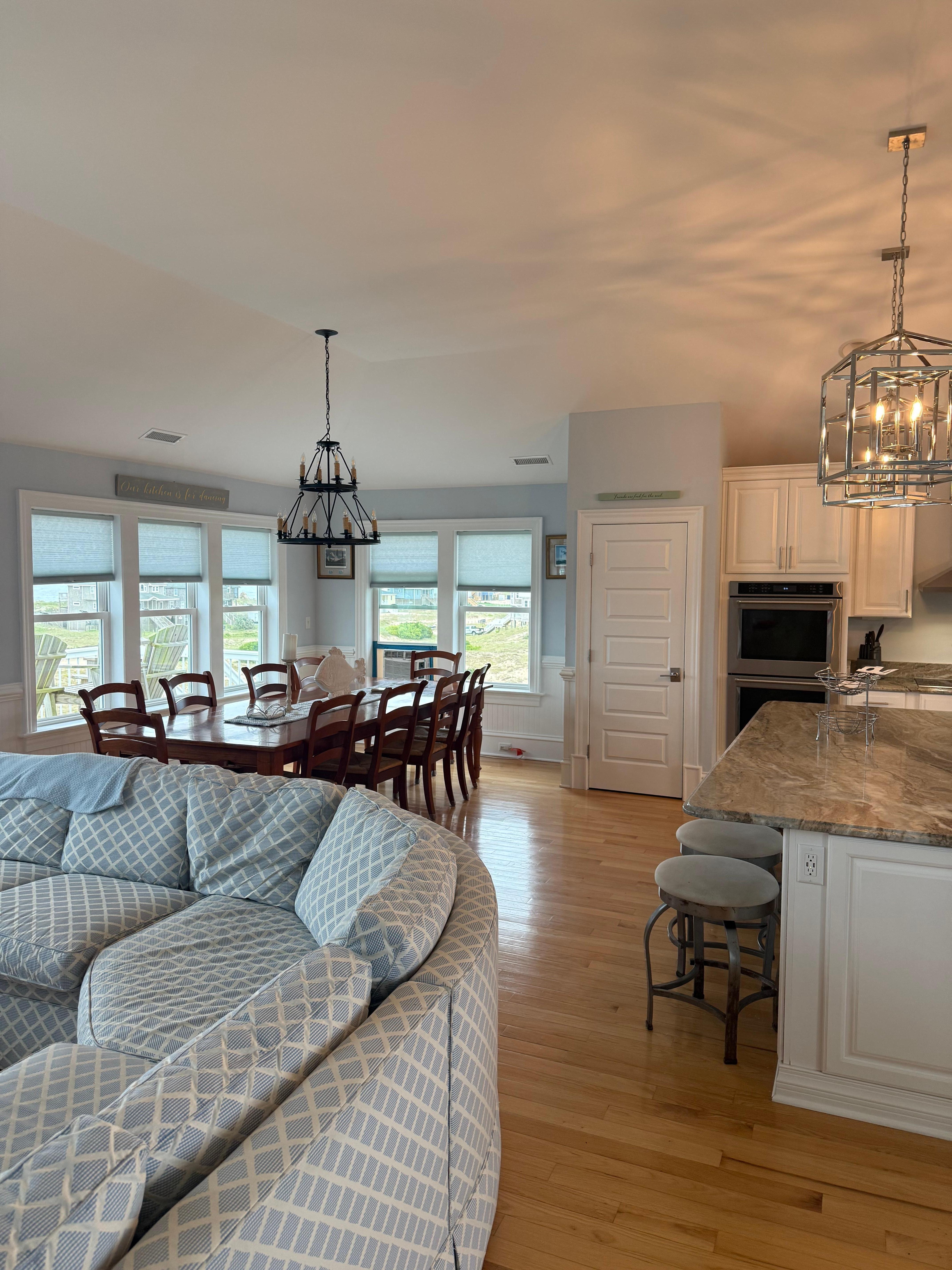 This is the "North Shore" at its best— great ocean views from every level of this luxurious home, situated on an elevated position on the beach. Three living areas create multiple options for your family vacation. We offer an upscale home with 6 bedrooms (4 Master King Ocean view bedrooms, 1 Master Queen Bedroom, and 1 Master Bunk Bedroom with twin/twin and twin/full bunks. There is also a queen sleeper in the game room. There will be no fighting over bathrooms each bedroom has its own bathroom! There is a large open kitchen with upscale finishes.