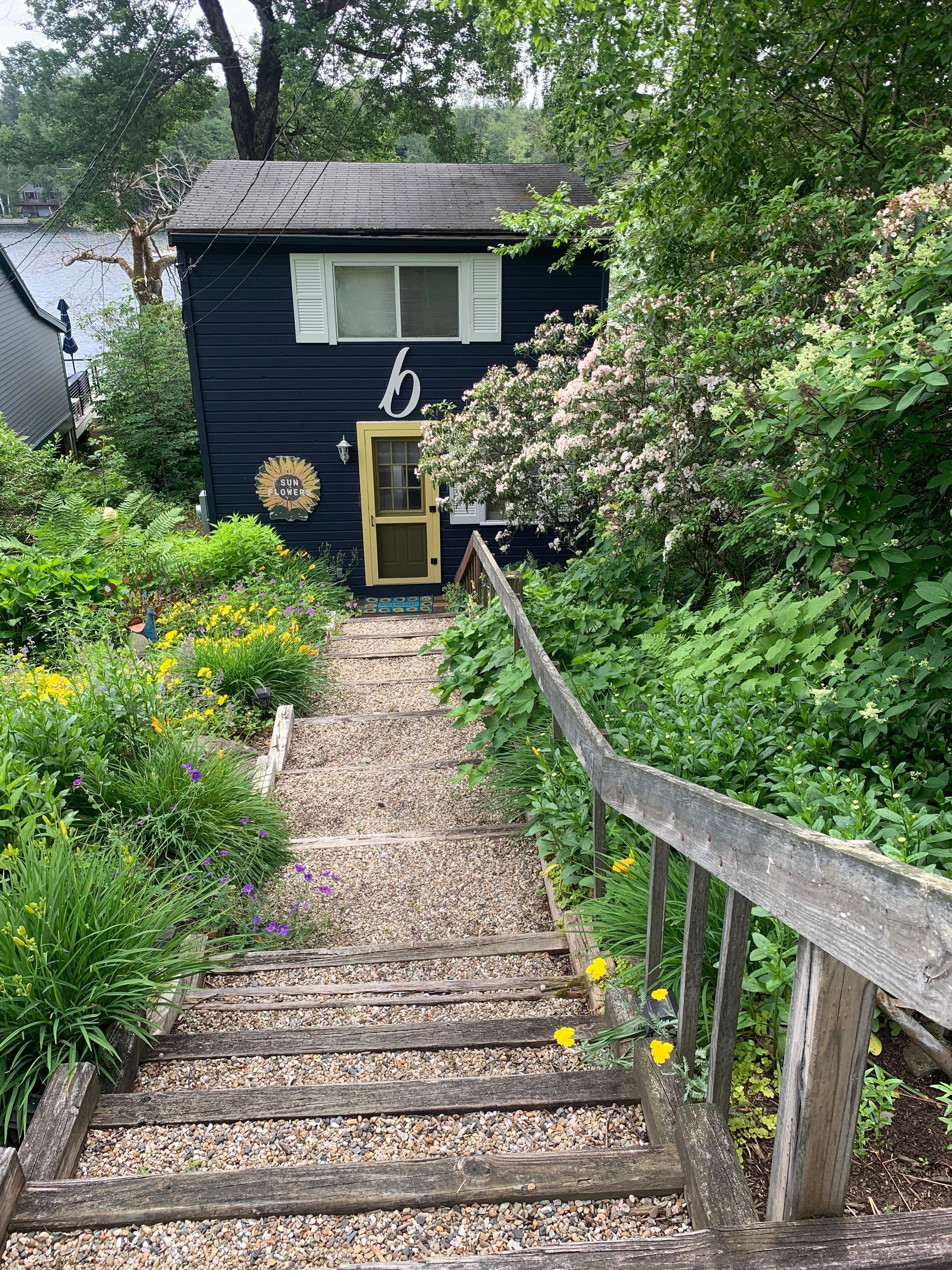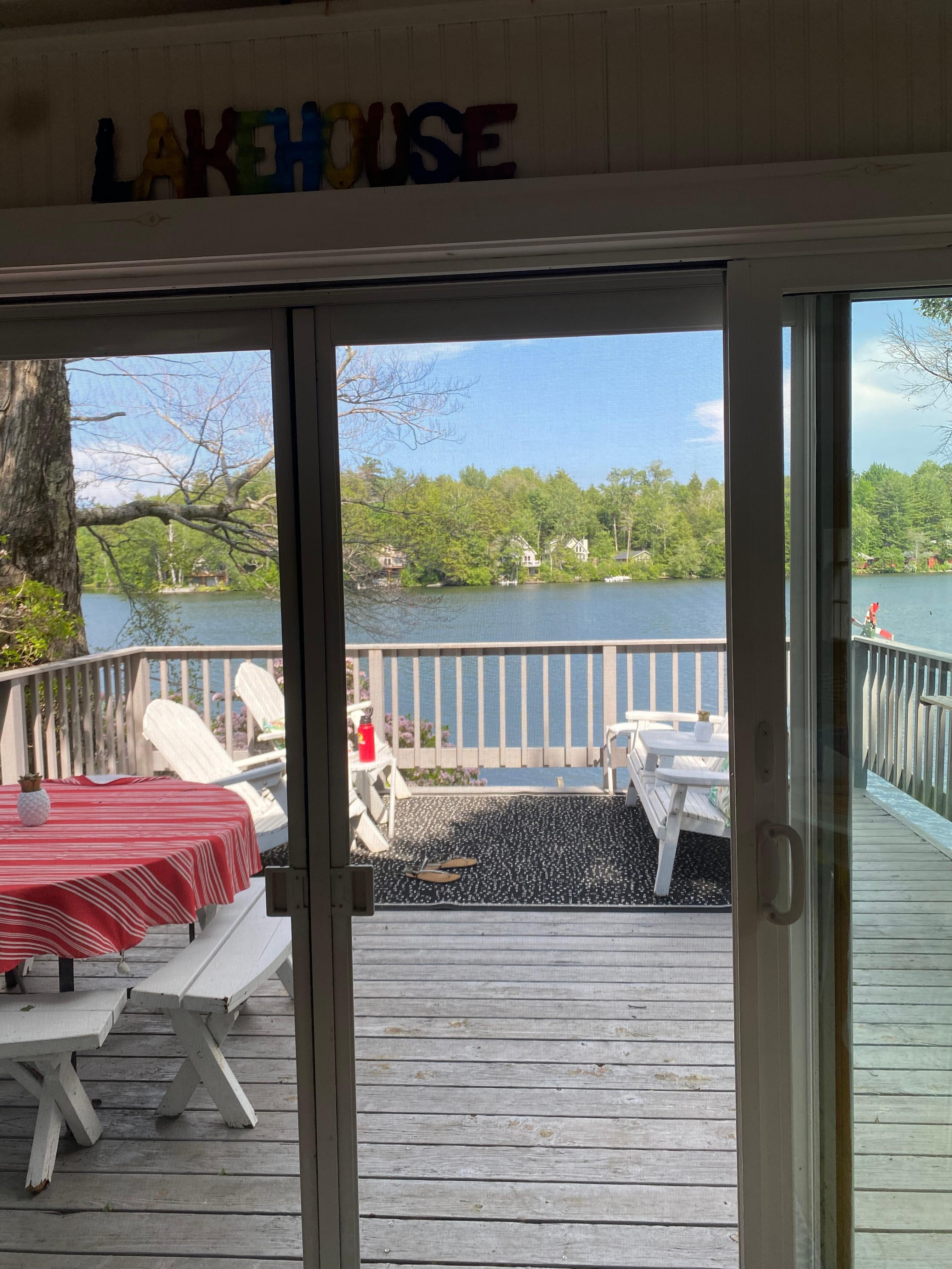 Outside has spacious upper deck and lower deck, plus dock. Eating table and sitting area on upper deck, with comfortable seating on lower deck. Dive into water from dock into 6-foot depth. Clean, clear lake great for swimming. Cottage has 3 kayaks and one 2-person canoe. Great fishing . Motorboats permitted. However, very quiet, peaceful lake. Cottage is east facing. Warm, sunny breakfasts on the deck.