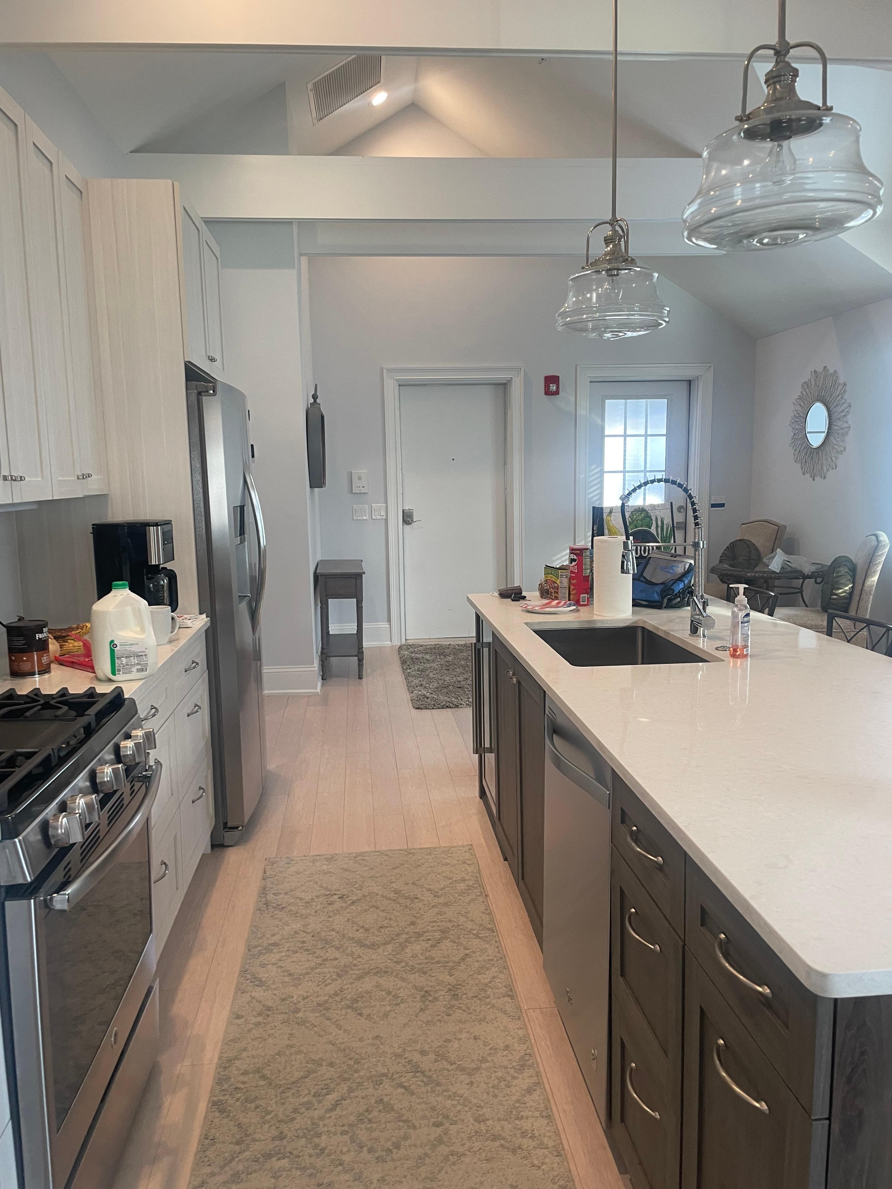 This rental is for the top floor. This 3rd floor condo has 18 ft. ceilings with open beams. All interior doors are 8 ft. high and interior walls are sound proof. NG fireplace and cooktop, granite counters, marble floor to ceiling showers, 2 bathrooms, private balcony, etc.