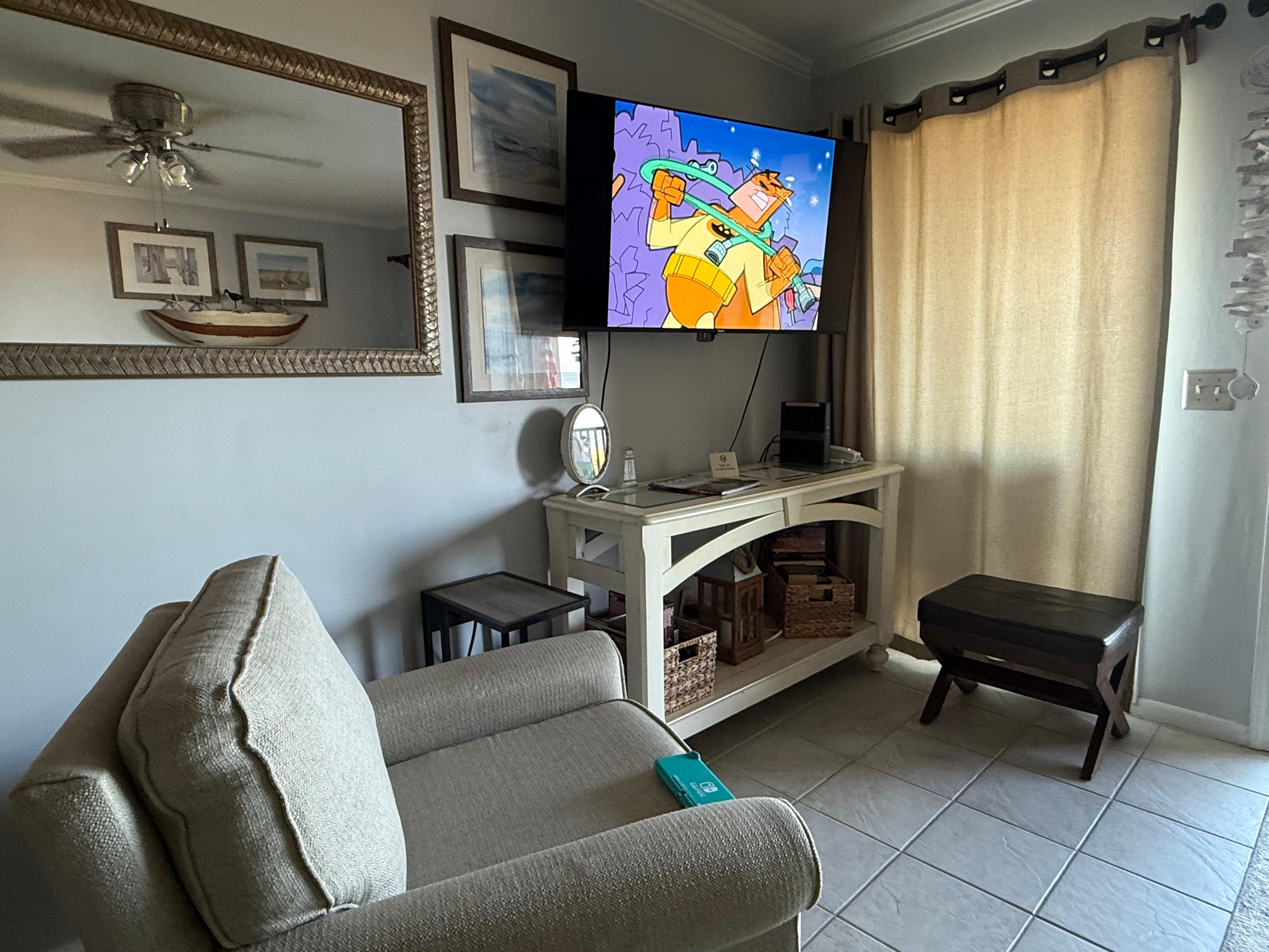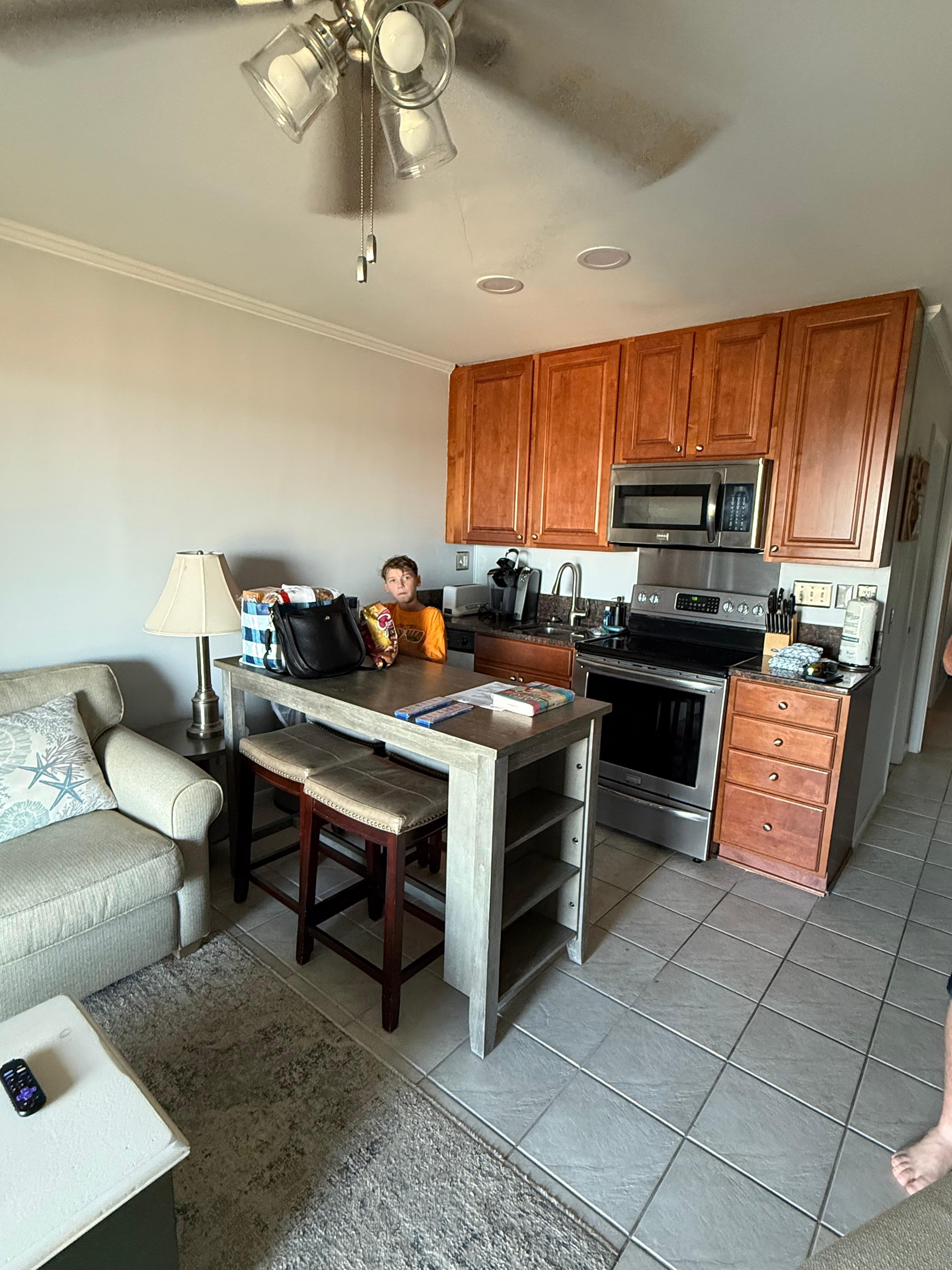 The villa has granite countertops in the kitchen and is equipped with all stainless steel appliances to include a full size range, refrigerator with ice maker, built-in microwave, toaster, coffee maker, and sink with garbage disposal. Other amenities include full set of dishes, glasses, wine glasses, a full line of cooking utensils, new pans, blender and crock pot. There is a TV in the bedroom as well as a 50” SMART TV in the living room with combo Blue Ray and DVD player for your entertainment. Bathroom has a tub and shower, vanity with granite surround, and hair dryer. There are ceiling fans in the bedroom, kitchen and on the balcony to keep you cool when you don’t want to use the AC or just to keep the air moving on a hot summer day.