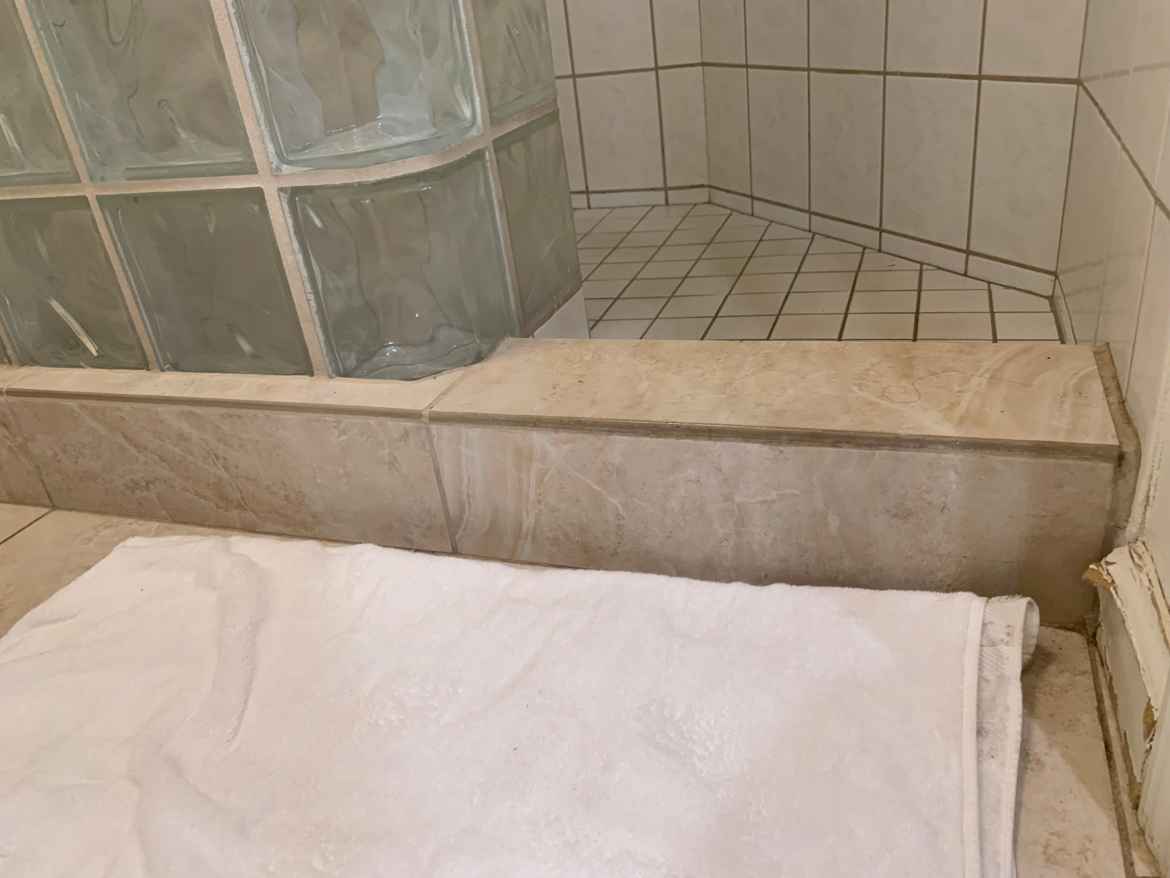 The second bedroom includes a queen-size bed, a twin bed, and an ensuite bathroom with a tiled step-in shower and sink. It also has access to a private balcony and a TV with cable. Central AC throughout the condo ensures a comfortable stay.