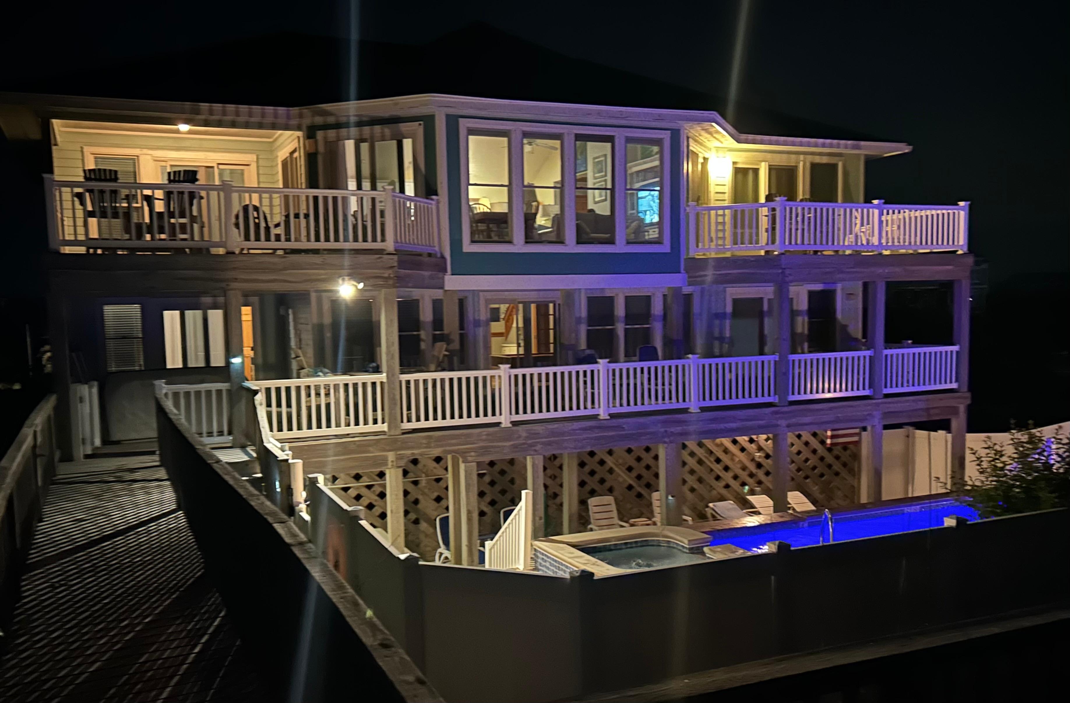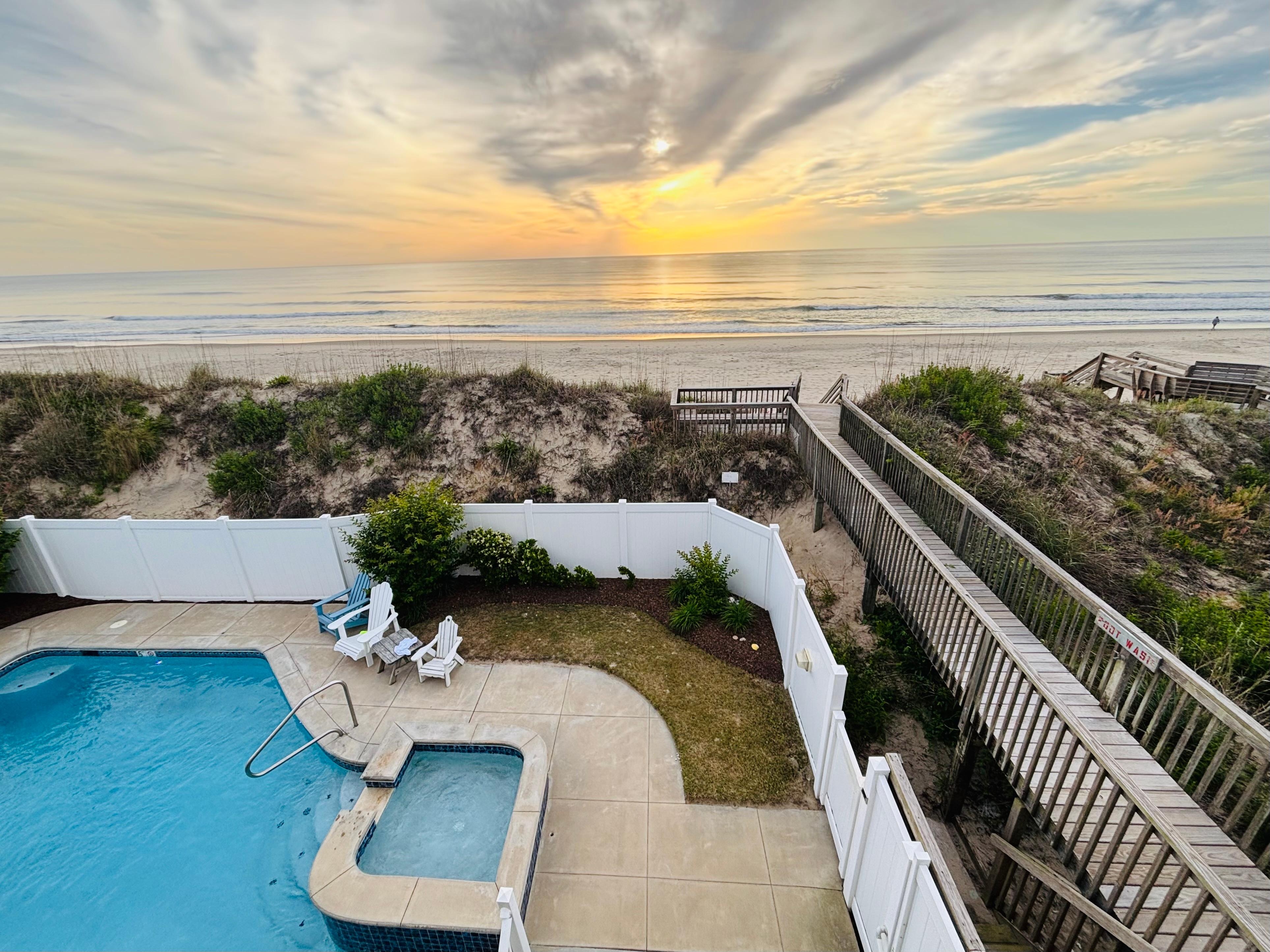 The Mid Level hosts the Hot Tub under a Covered Porch accessible through the Game Room, the Pool deck & two bedrooms. You'll overlook the pool and have a connected Walkway to the Beach from the Mid Level Deck. Fifty steps bring you to a Dune deck and over the dune stairs leading to the Beach & Ocean shoreline.